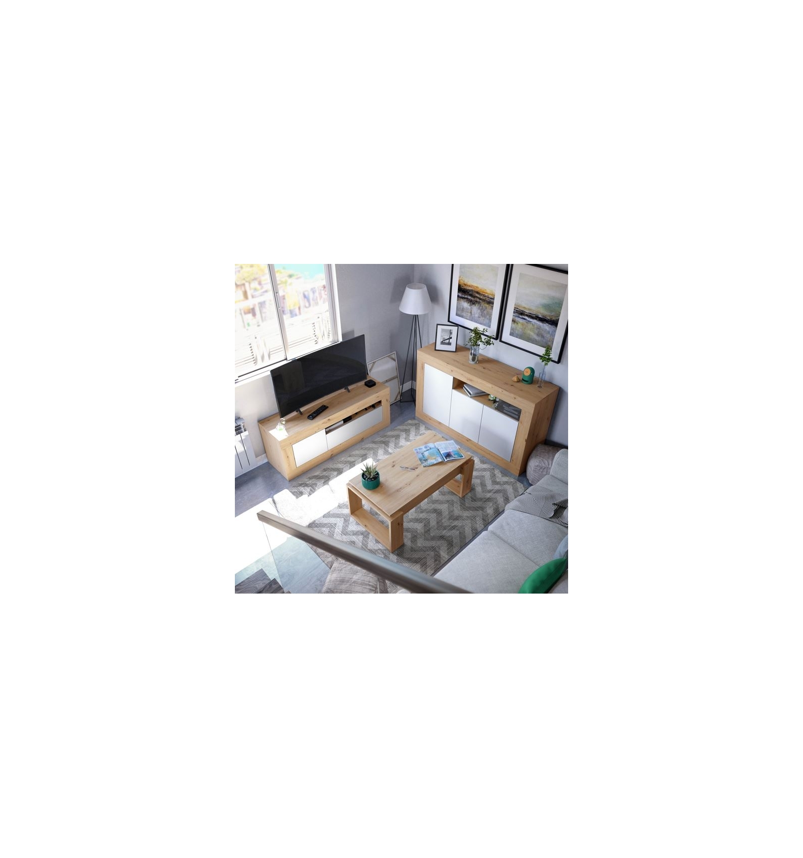 Moderno aparador de líneas rectas en combinación de tonos blanco y roble, perfecto para completar la decoración de tu salón.