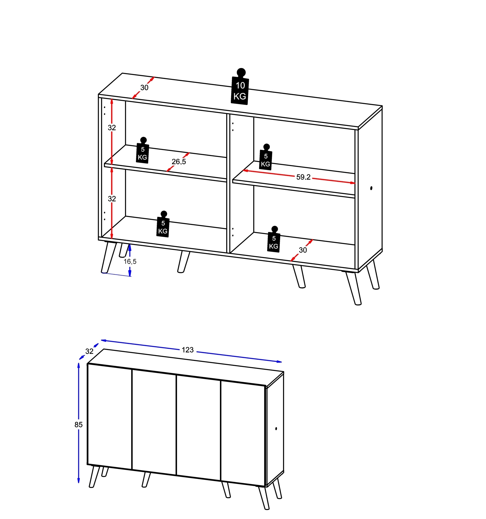 En su interior, cuenta con dos estantes y una división vertical simétrica, proporcionando un almacenamiento eficiente y ordenado. Los estantes tienen una capacidad de hasta 5 kilos cada uno, mientras que la superficie superior soporta hasta 7 kilos, lo que lo convierte en un mueble práctico y duradero.
