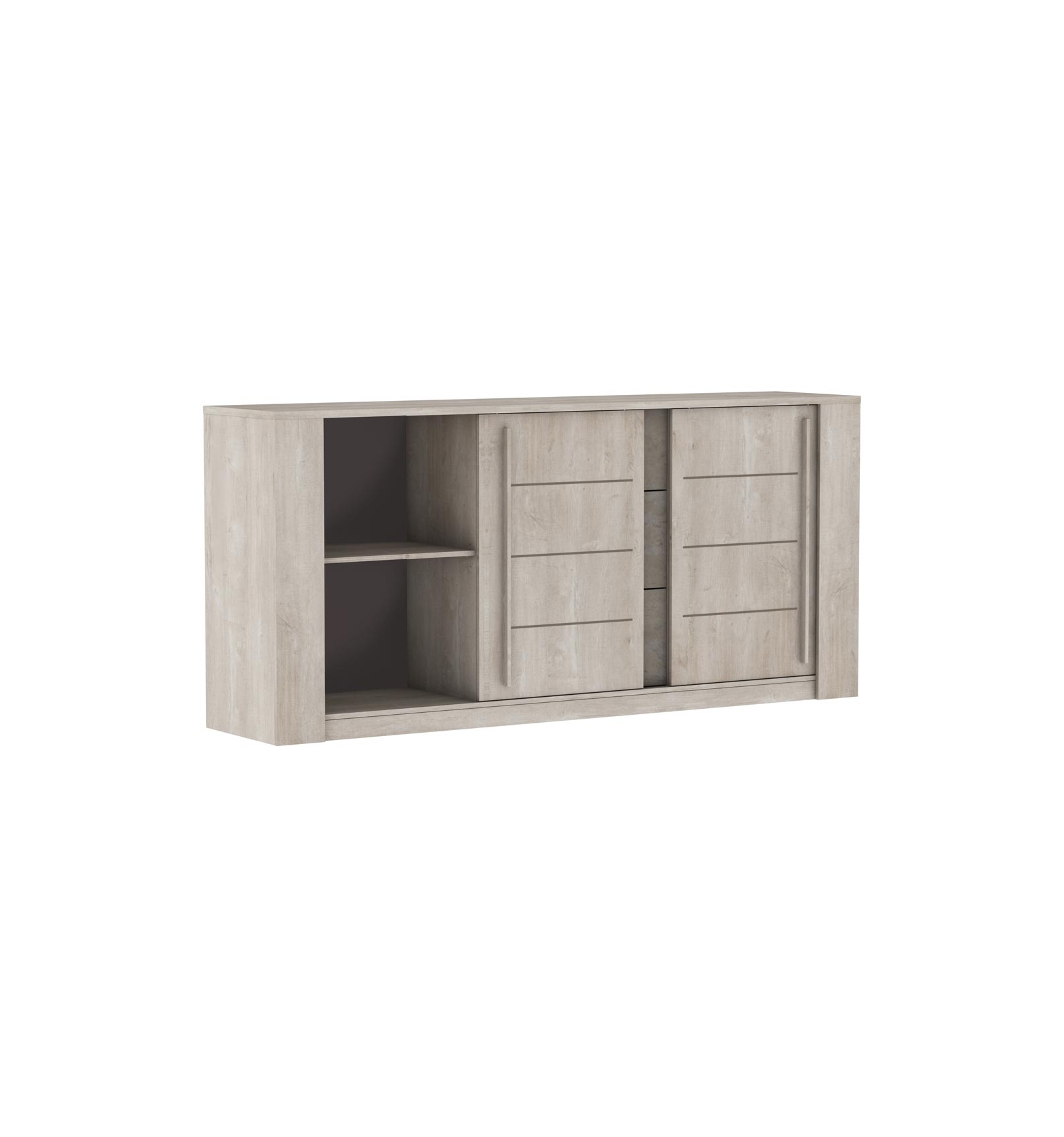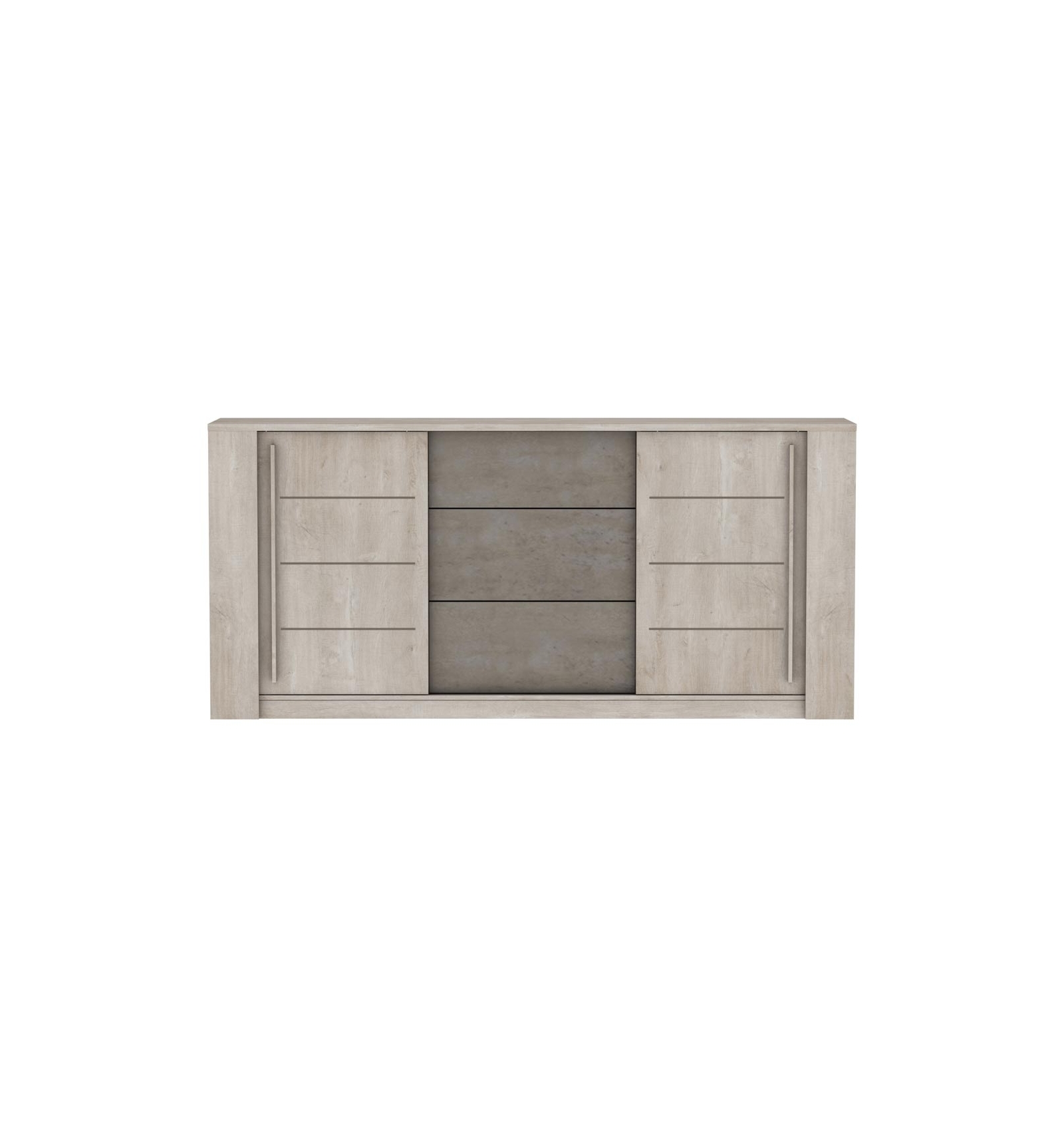 Moderno aparador bicolor en roble champagne y cemento. Consta de 2 puertas correderas que incluyen un estante regulable en altura para maximizar el espacio y 3 cajones de apertura a presión "push".
