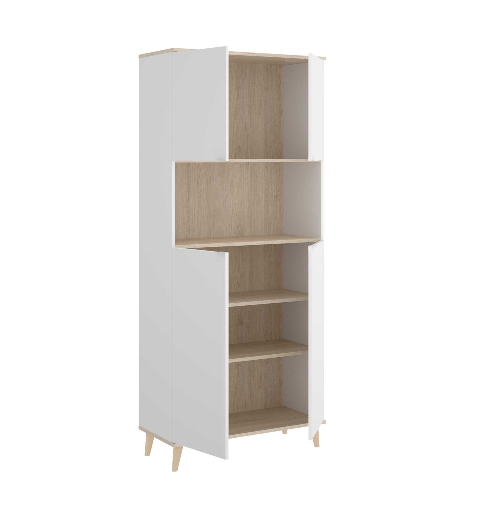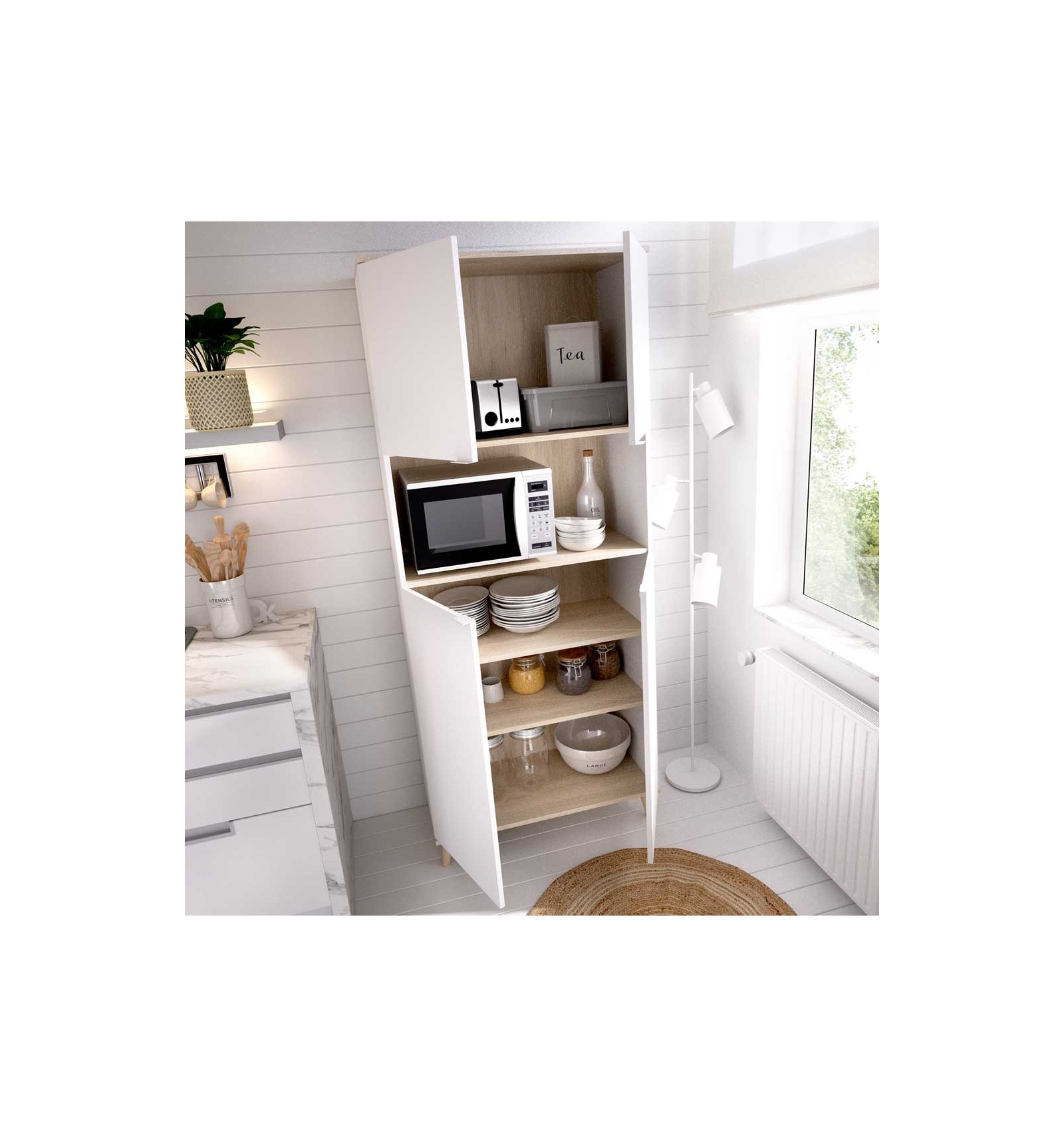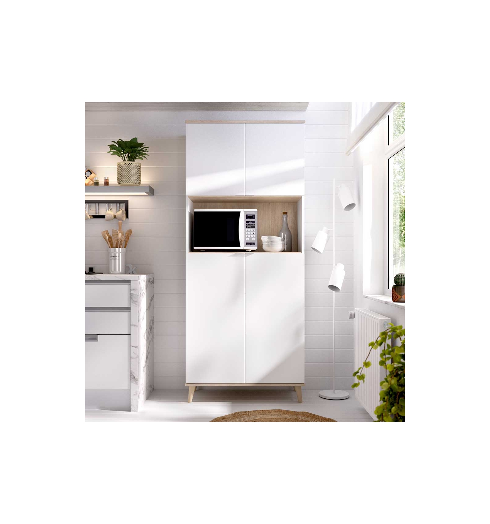 El mueble despensa Metre hará que tu cocina sea sofisticada y selecta a la vez gracias a la combinación del blanco con el fondo natural. Podrás mantener tu cocina ordenada, ya que dispone de 4 puertas y 5 estantes (uno de los cuales descubierto para el microondas o para los elementos que quieras tener más a mano).