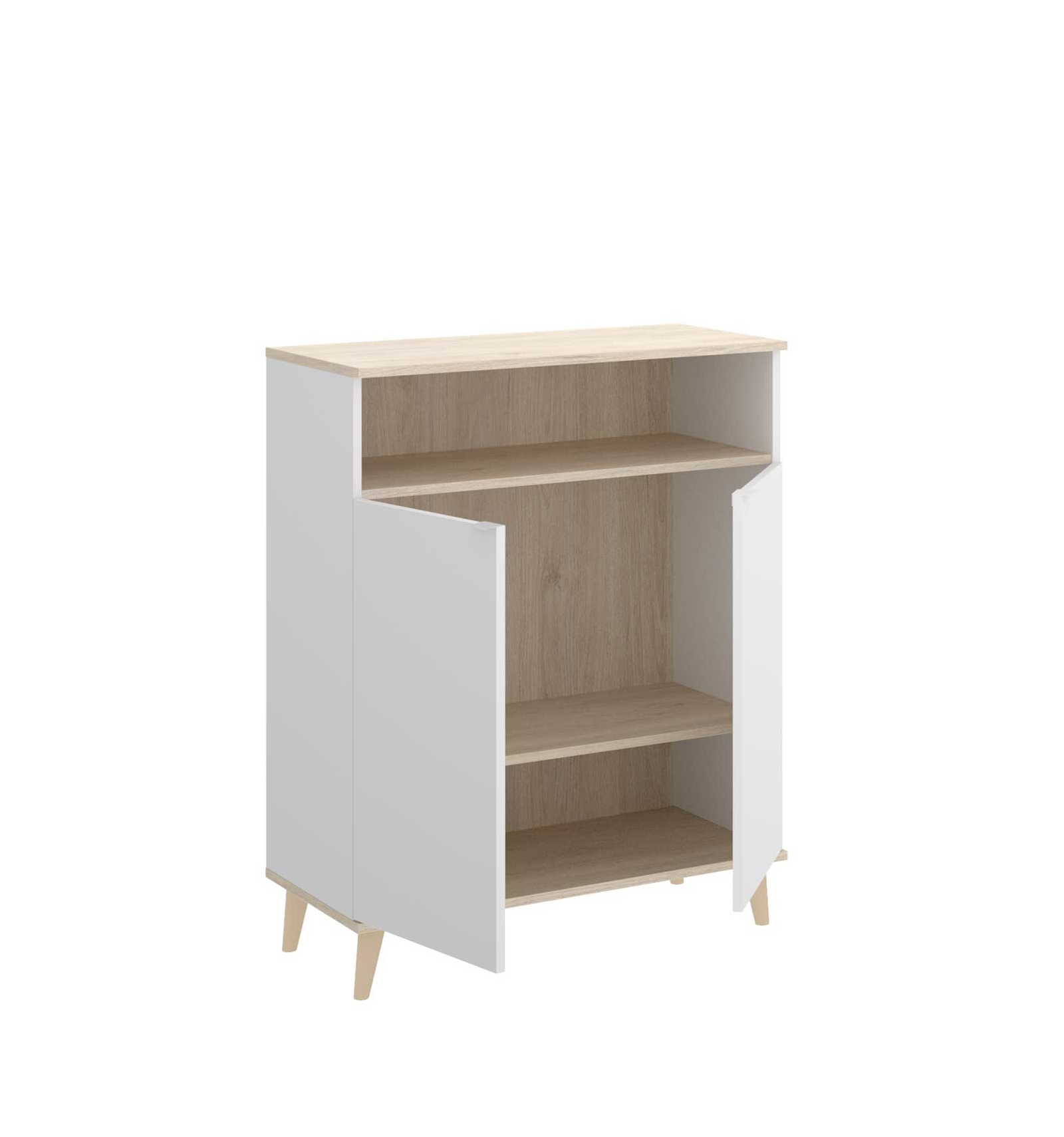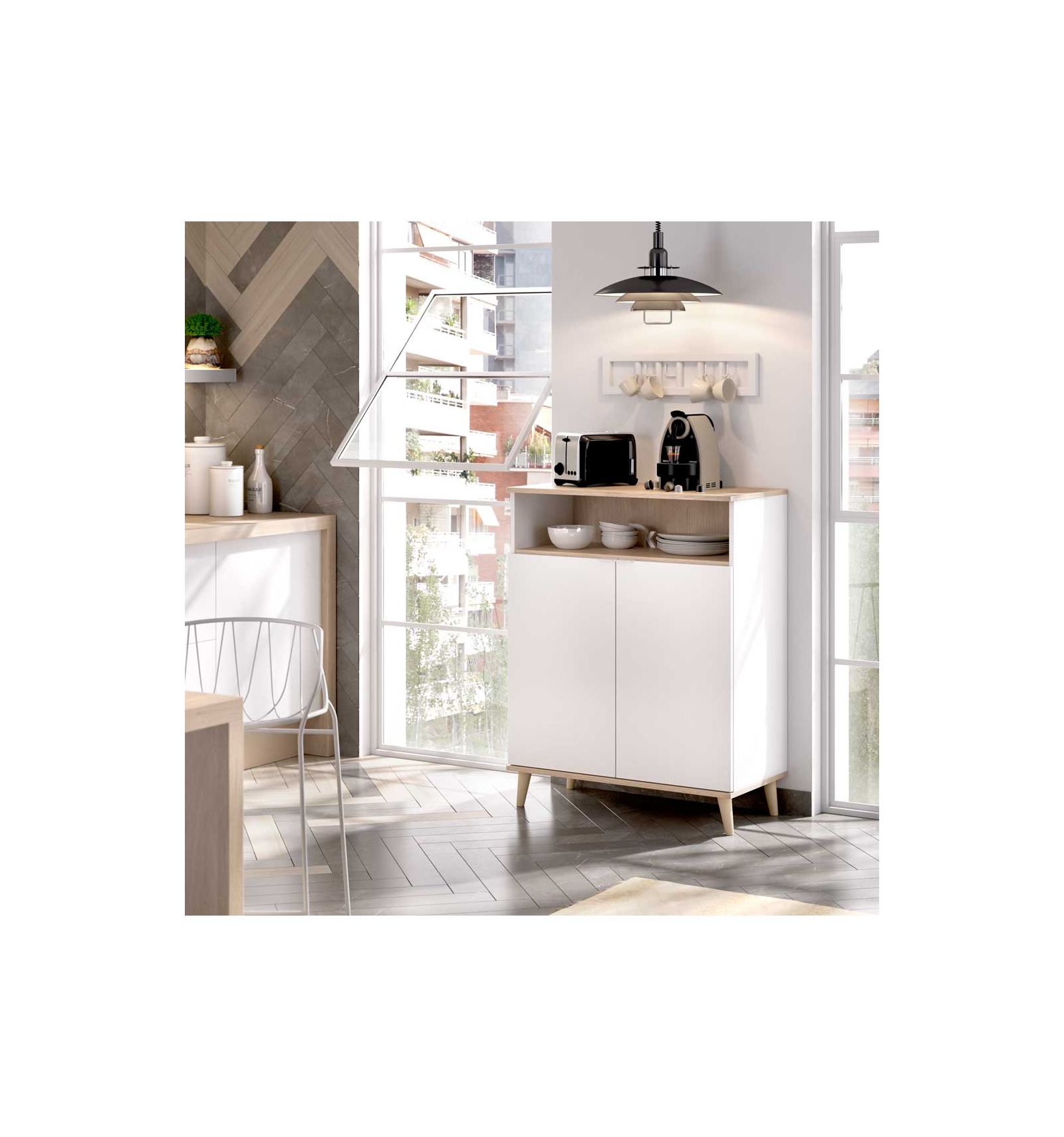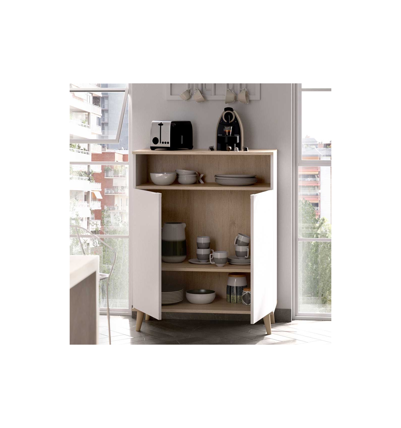 El mueble Petri hará que tu cocina sea sofisticada y selecta a la vez gracias a la combinación del blanco con el fondo natural. Podrás mantener tu cocina ordenada, ya que dispone de 2 puertas y 4 estantes (2 de ellos visibles y 2 ocultos tras las puertas).