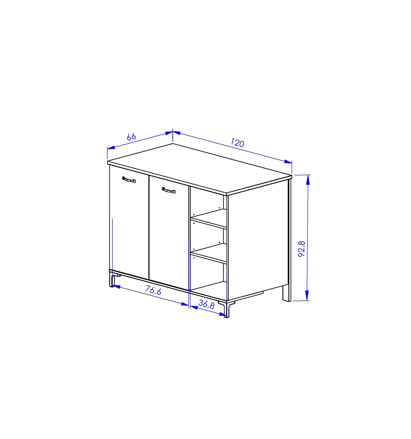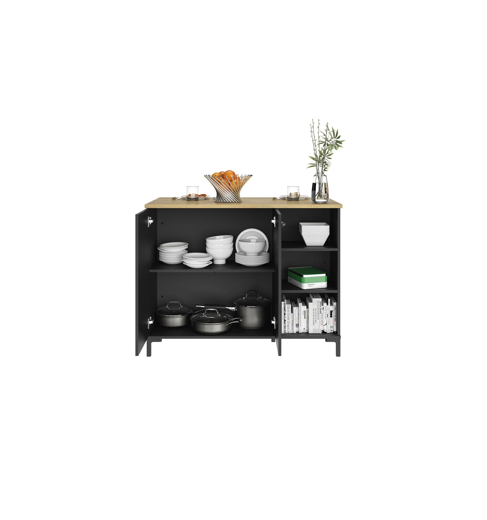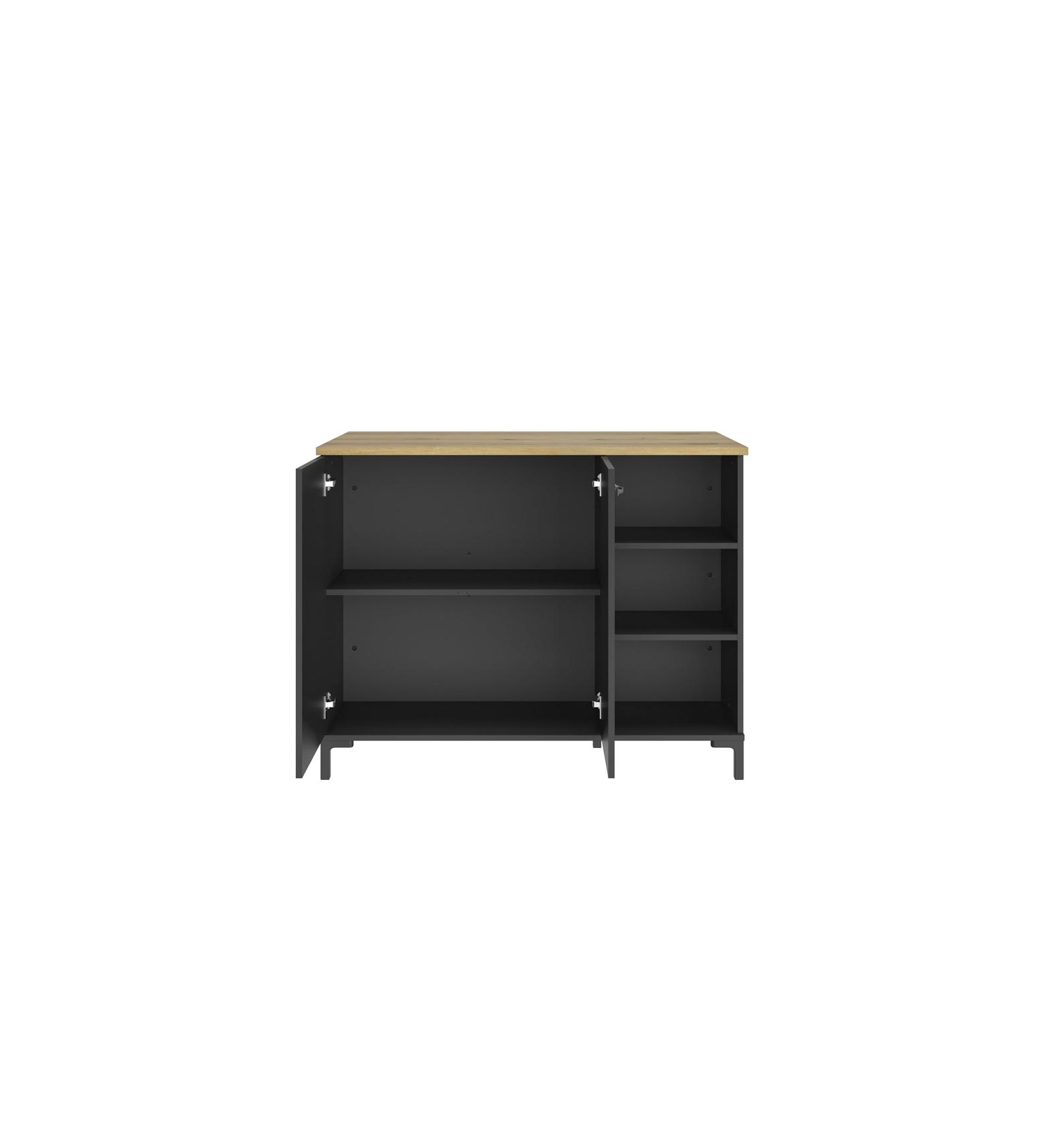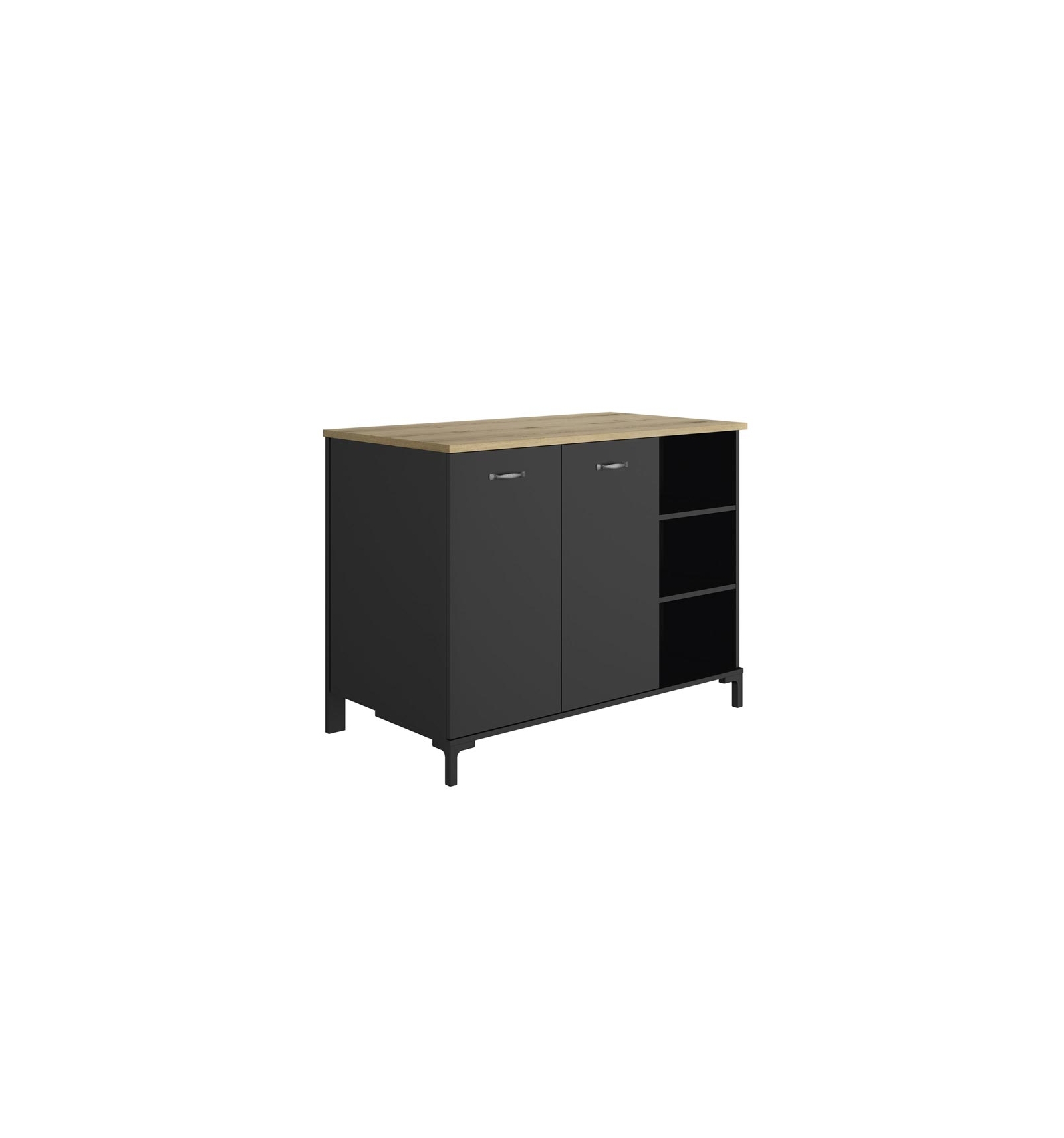 • Almacenamiento: el mueble se compone de un armario de 2 puertas con un estante regulable en altura de 77 cm de ancho. Dispone de un espacio abierto de 37 cm de ancho con 2 estantes regulables en altura.