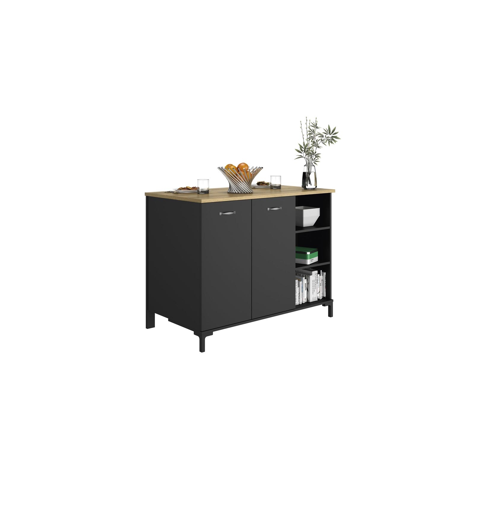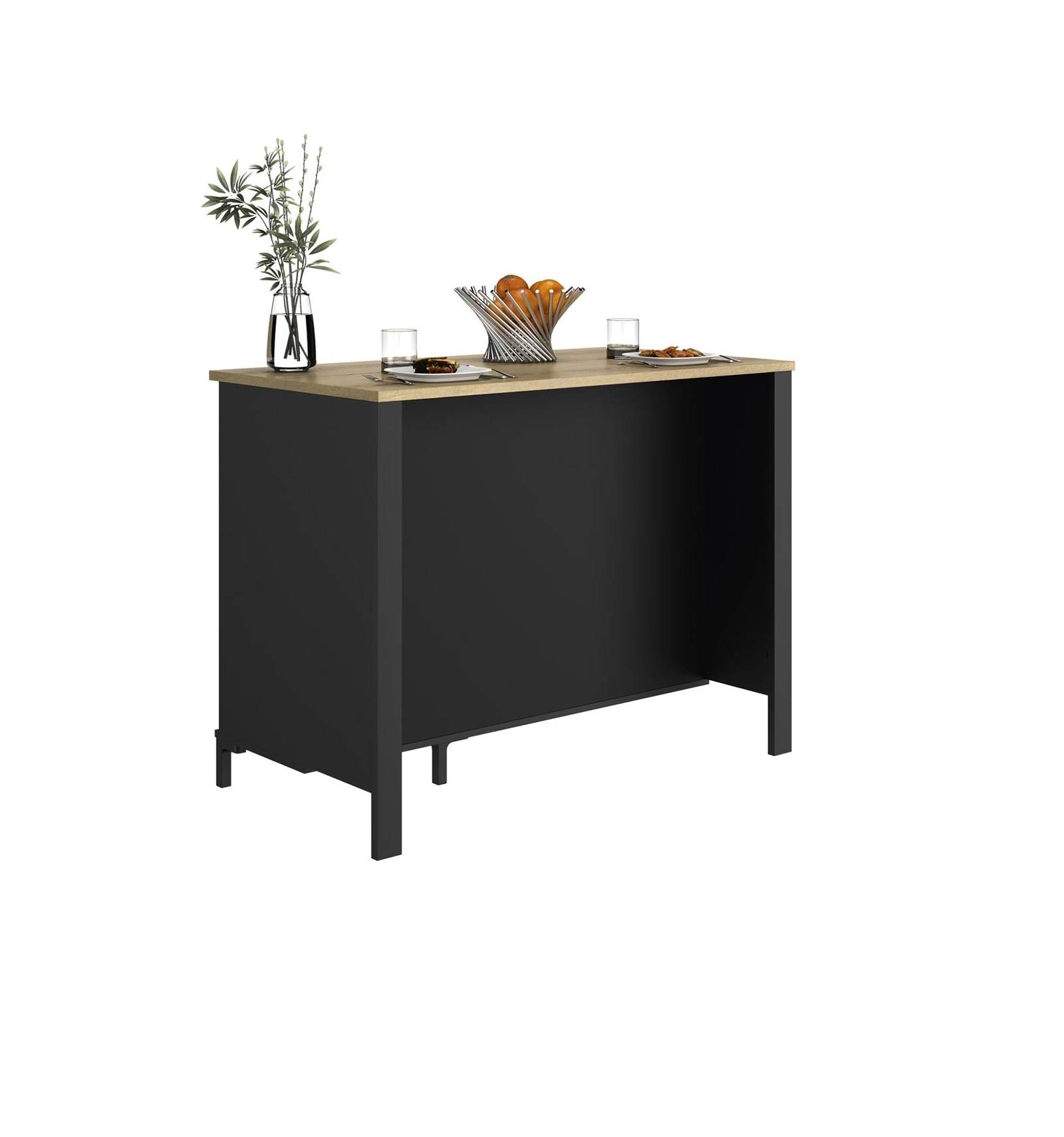 • Diseño: Este mueble auxiliar de cocina Ruby provee de funcionalidad y estilo a cualquier espacio. El color principal es el negro, mientras que el secundario es roble Helvezia, imprimiendo un toque de contraste y elegancia al conjunto de estilo industrial. Asimismo, puede utilizarse como mesa improvisada para comer o tomar un aperitivo ya que está diseñada para ubicar 2 sillas altas con asiento de aproximadamente 65 cm de altura.