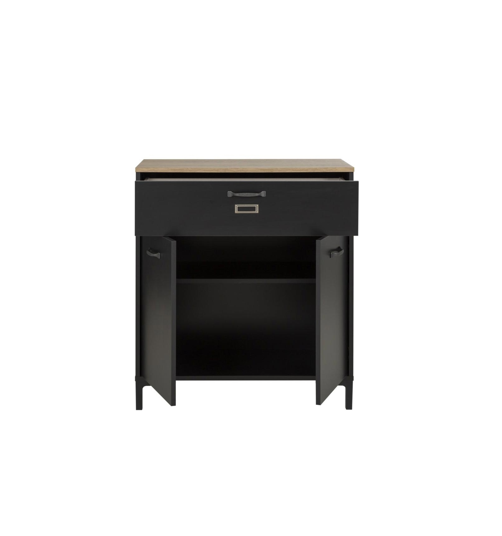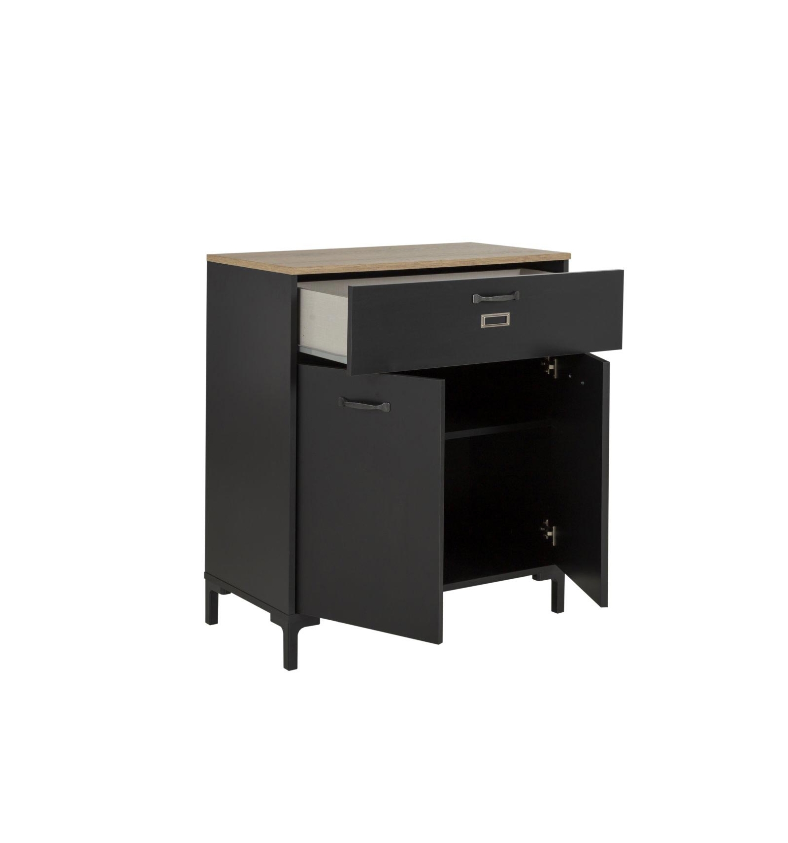 • Material: Tablero de partículas melaminizado de alta densidad con acabado en negro y sobre en roble. Patas de ABS en negro y tiradores ABS con acabado envejecido. El aparador pequeño cuenta con un práctico detalle de un portaetiquetas de metal, perfecto para anotar el contenido del cajón.