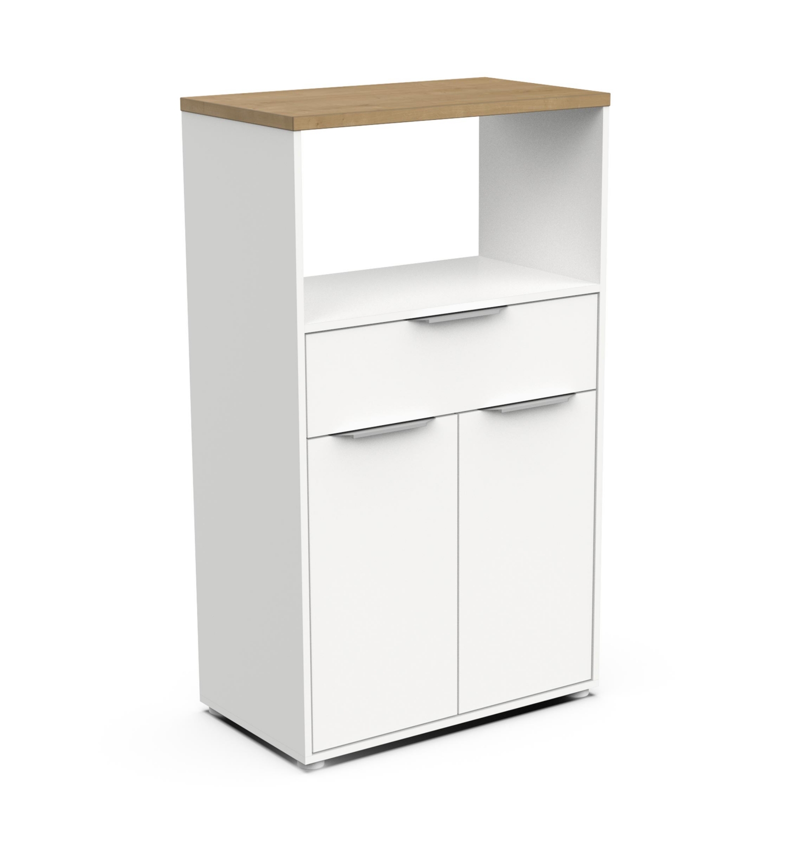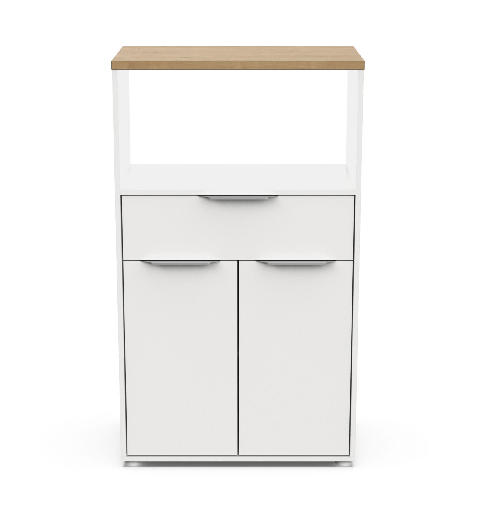 El mueble de cocina Kaon cuenta con un práctico nicho donde colocar el microondas, la cafetera o la batidora. Artículos que necesitamos tener a mano pero que son aparatosos. Un amplio cajón en su parte central, para tener todos los utensilios a mano y un armario de 2 puertas con estante, para mantener todo organizado y fuera de la vista.