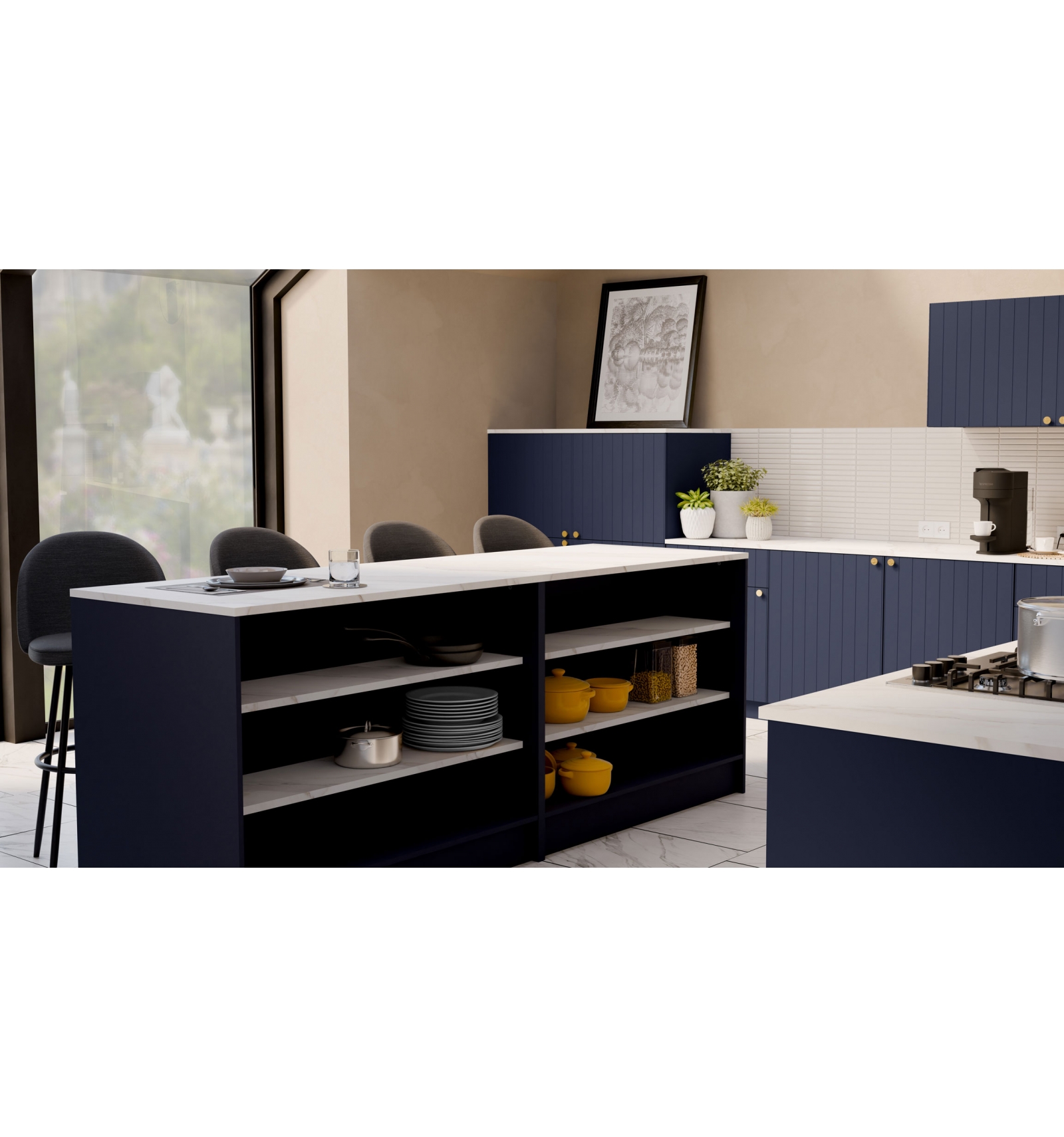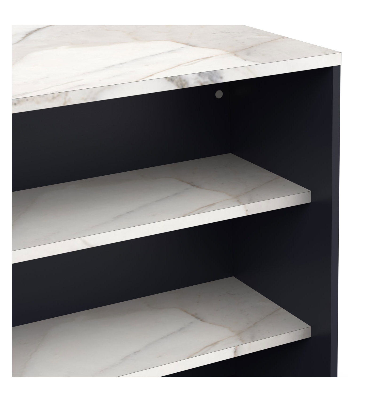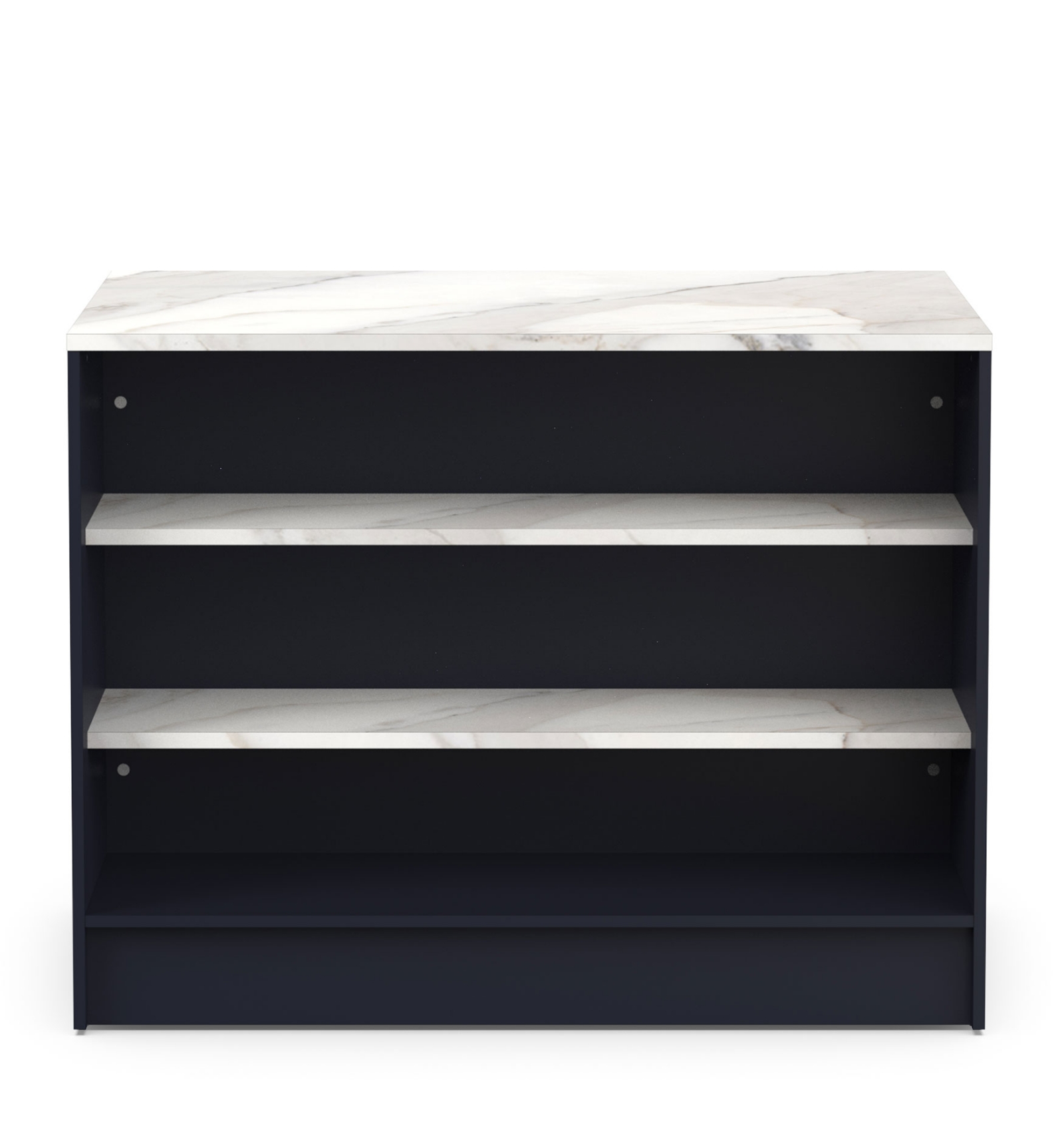 Con un diseño moderno que combina un acabado en azul índigo, mármol y blanco, este mueble se convierte en el centro de atención de cualquier espacio.