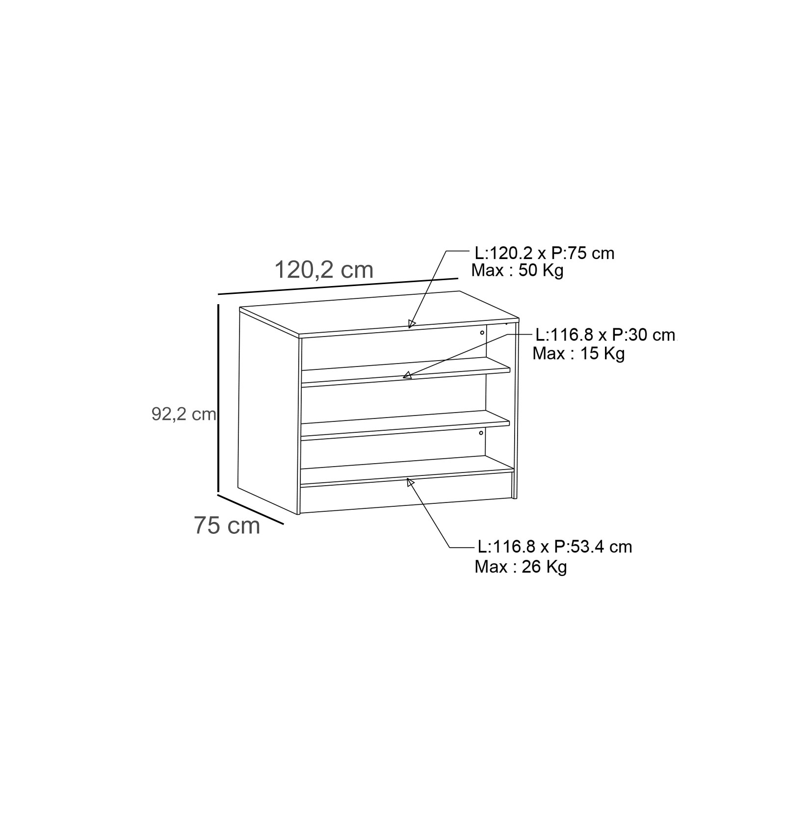 Con dimensiones generosas (120.2 cm de largo) y una estructura robusta en aglomerado, ofrece un amplio almacenamiento para utensilios, ingredientes y más.