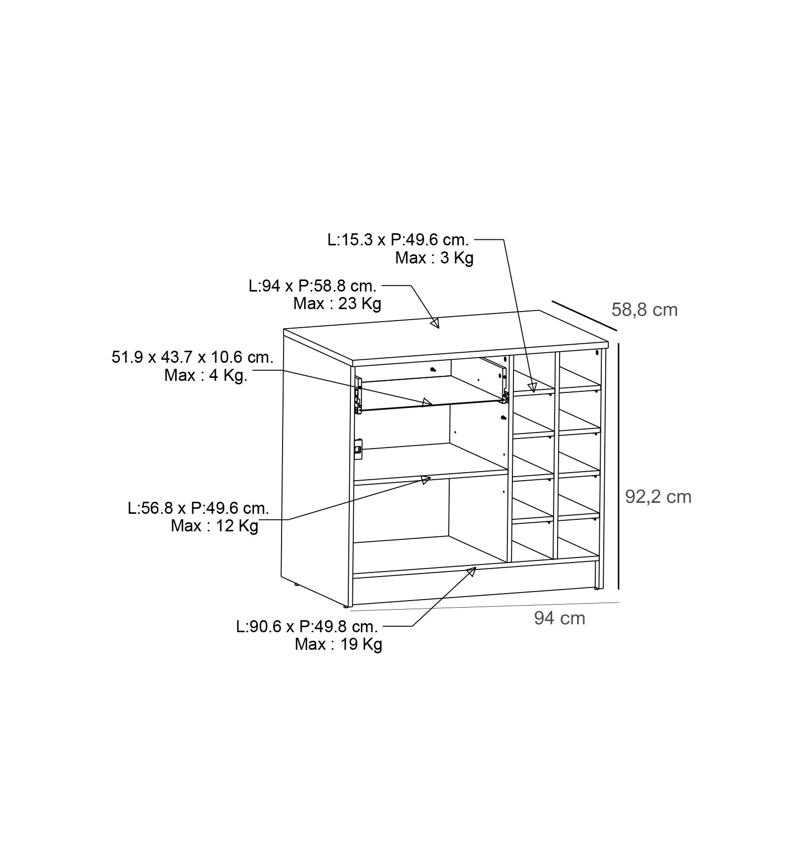 | Otras características: | Botellero: 15,3 x 49,6 cm |