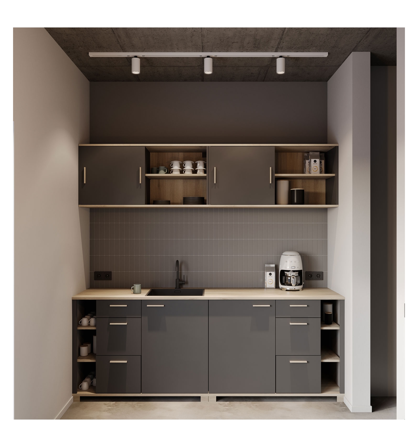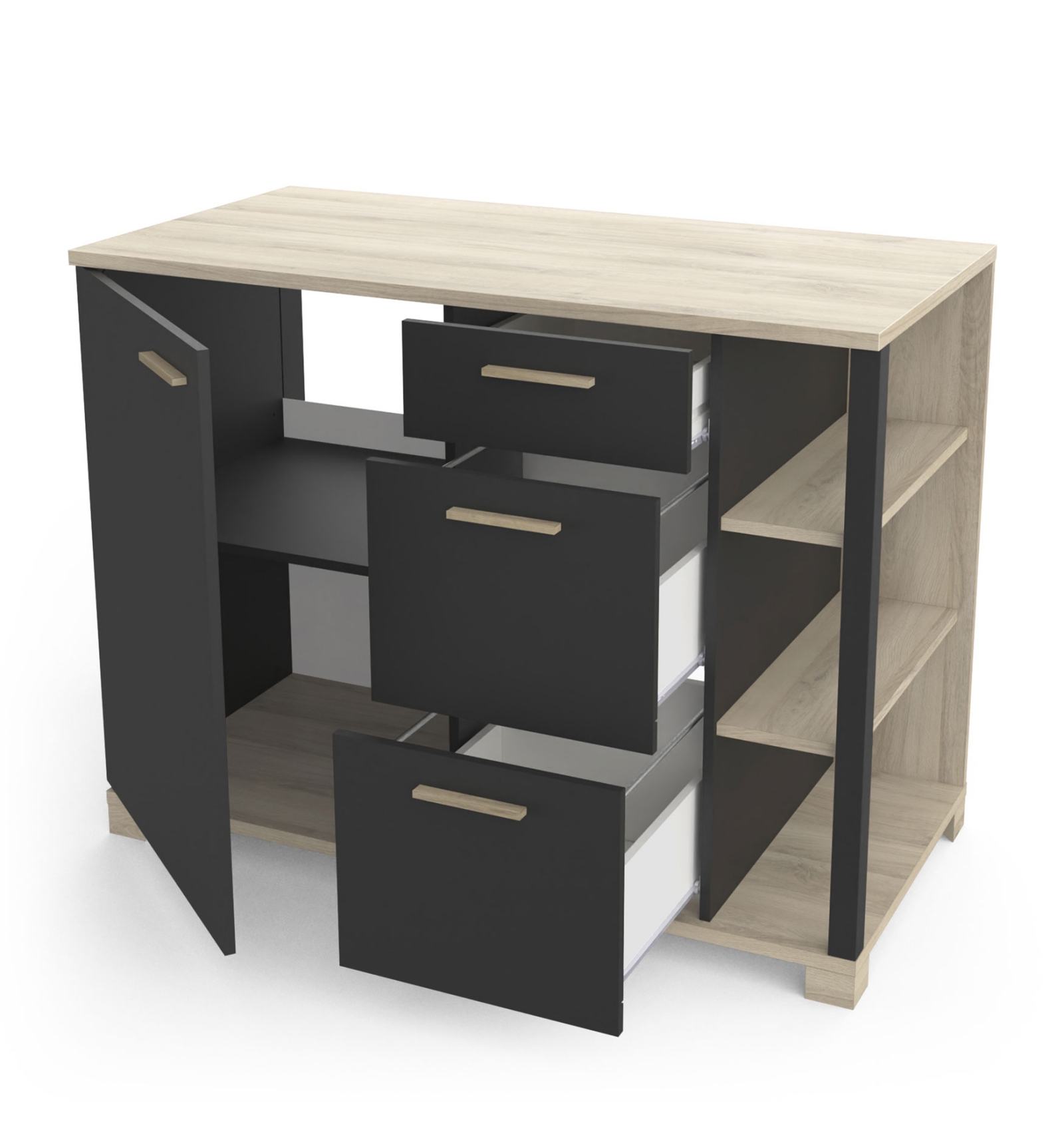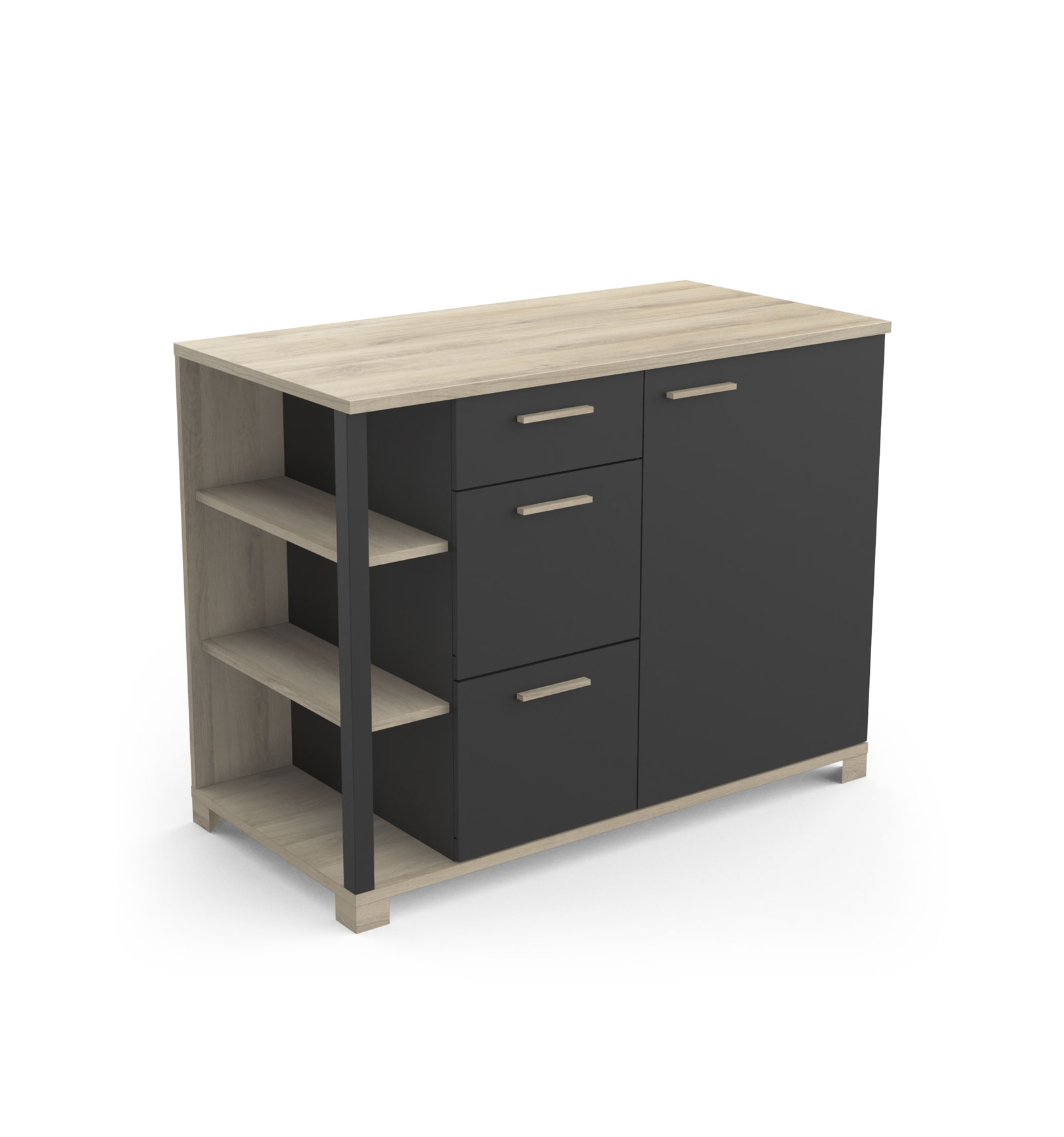 Descubra el Mueble bajo de cocina Clemen, una pieza compacta y funcional que con su estructura en color negro mate y encimera en acabado roble, aporta un estilo industrial actual a tu cocina. Este mueble está diseñado para integrarse perfectamente en espacios reducidos, ofreciendo soluciones de almacenamiento inteligentes para sus utensilios esenciales.