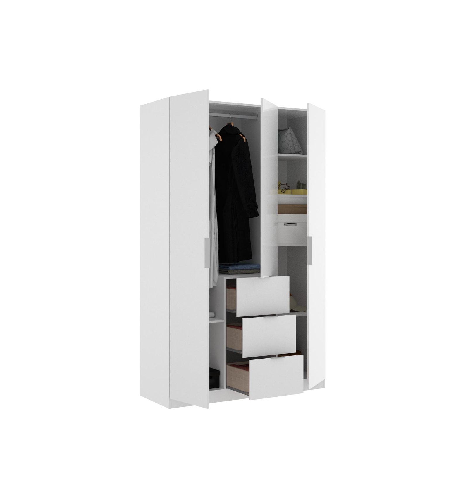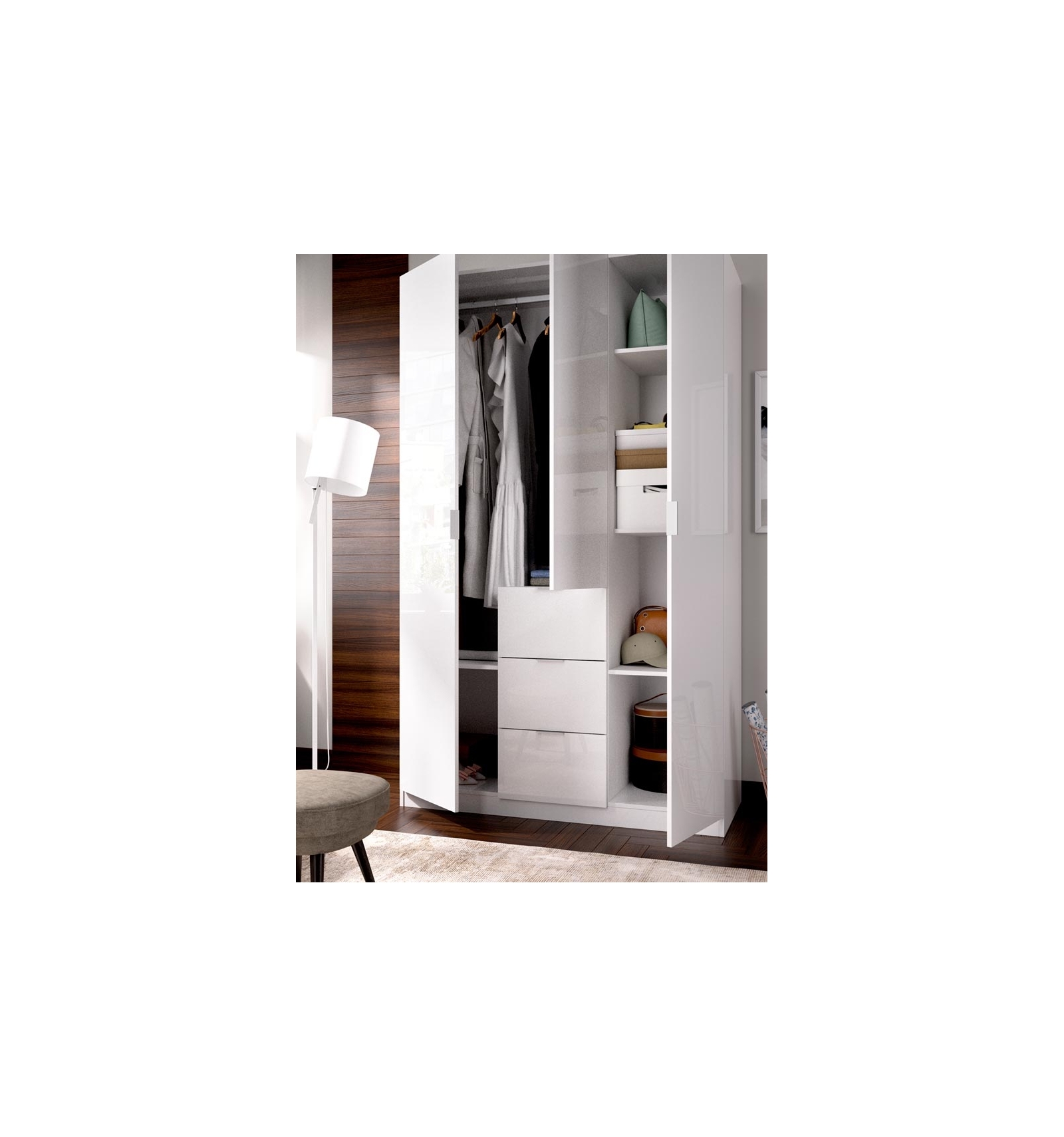 El armario de 3 Puertas y 3 grandes cajones Eleven es ideal si lo que buscas es una gran capacidad de almacenamiento. Cuenta con tres puertas y dos cajones para poner todos los tipos de prendas que tengas. El blanco brillante del armario Eleven le da un toque especial y muy llamativo al dormitorio, por lo que otorgará un diseño único a la habitación. Gracias a su diseño elegante y sus medidas, este armario es ideal para cualquier tipo de habitación y combina con cualquier decoración que tenga. Para el fabricado del armario 3 Puertas y 3 grandes Cajones eleven, se utilizó melamina de alta calidad, para ofrecer así lo mejor a sus clientes y dar mucha seguridad, resistencia y alta capacidad de almacenaje. Para instalar el armario, se cuenta con un manual de usuario muy completo y detallado, para realizar así el montaje fácilmente.