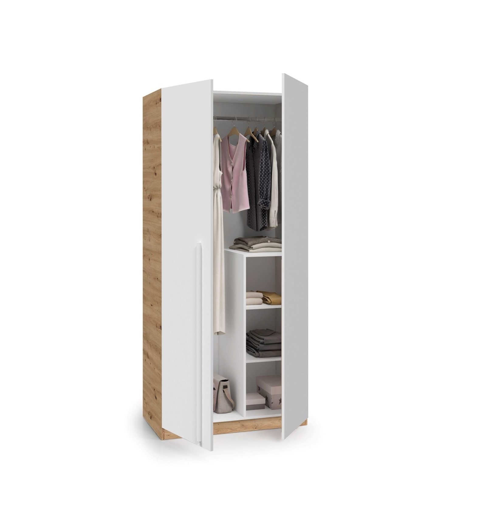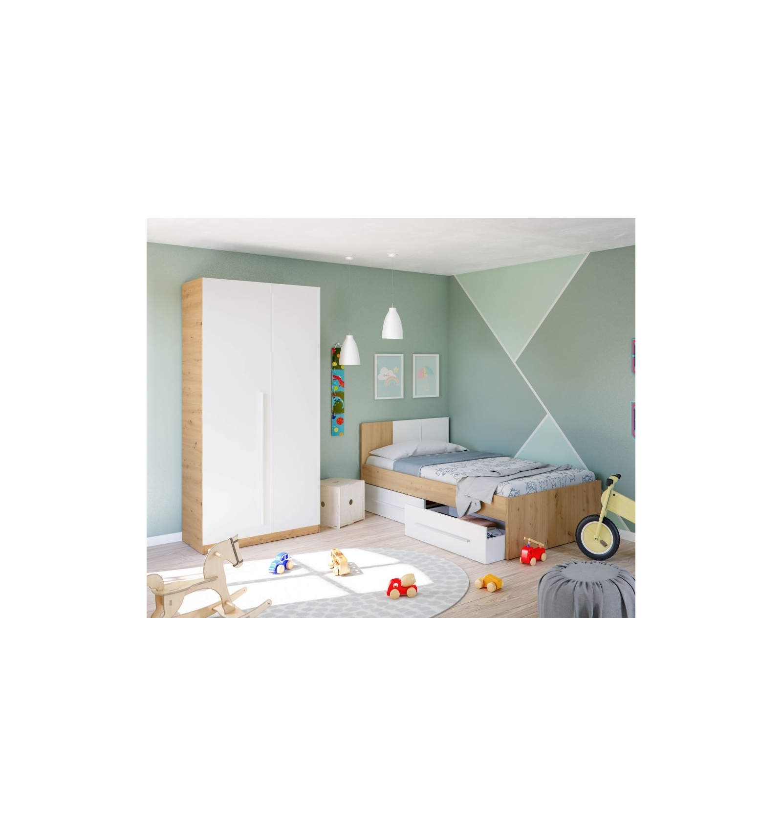 El armario vestidor Raiden ha sido especialmente diseñado para encajar en cualquier estilo y su acabado en combinación de tonos roble y blanco es totalmente neutro, para que tus hijos puedan darle su toque personal.