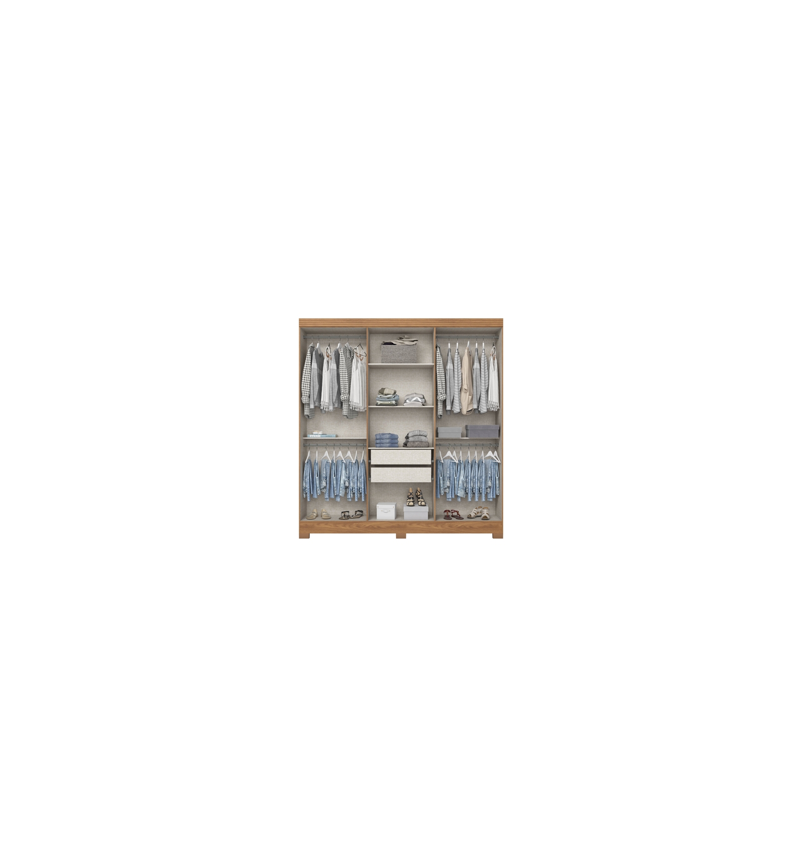Este armario 6 puertas cuenta con una distribución interior práctica que se adapta a tus necesidades: 4 secciones con barra colgador, pensadas para organizar camisas, blusas, faldas o pantalones. Incluye además 3 estantes para ropa doblada como camisetas o jerseys, y 2 cajones ideales para ropa interior, cinturones o complementos. Gracias a su diseño funcional, se convierte en un armario de dormitorio espacioso y versátil, perfecto para parejas que desean dividir el espacio de manera equilibrada.