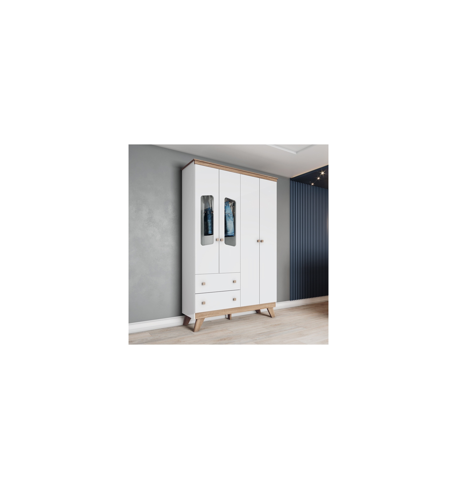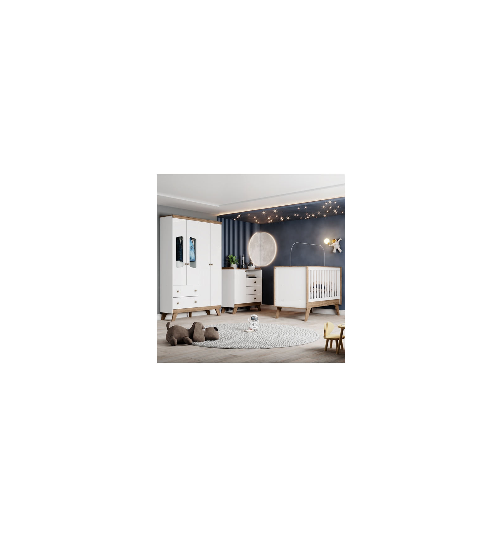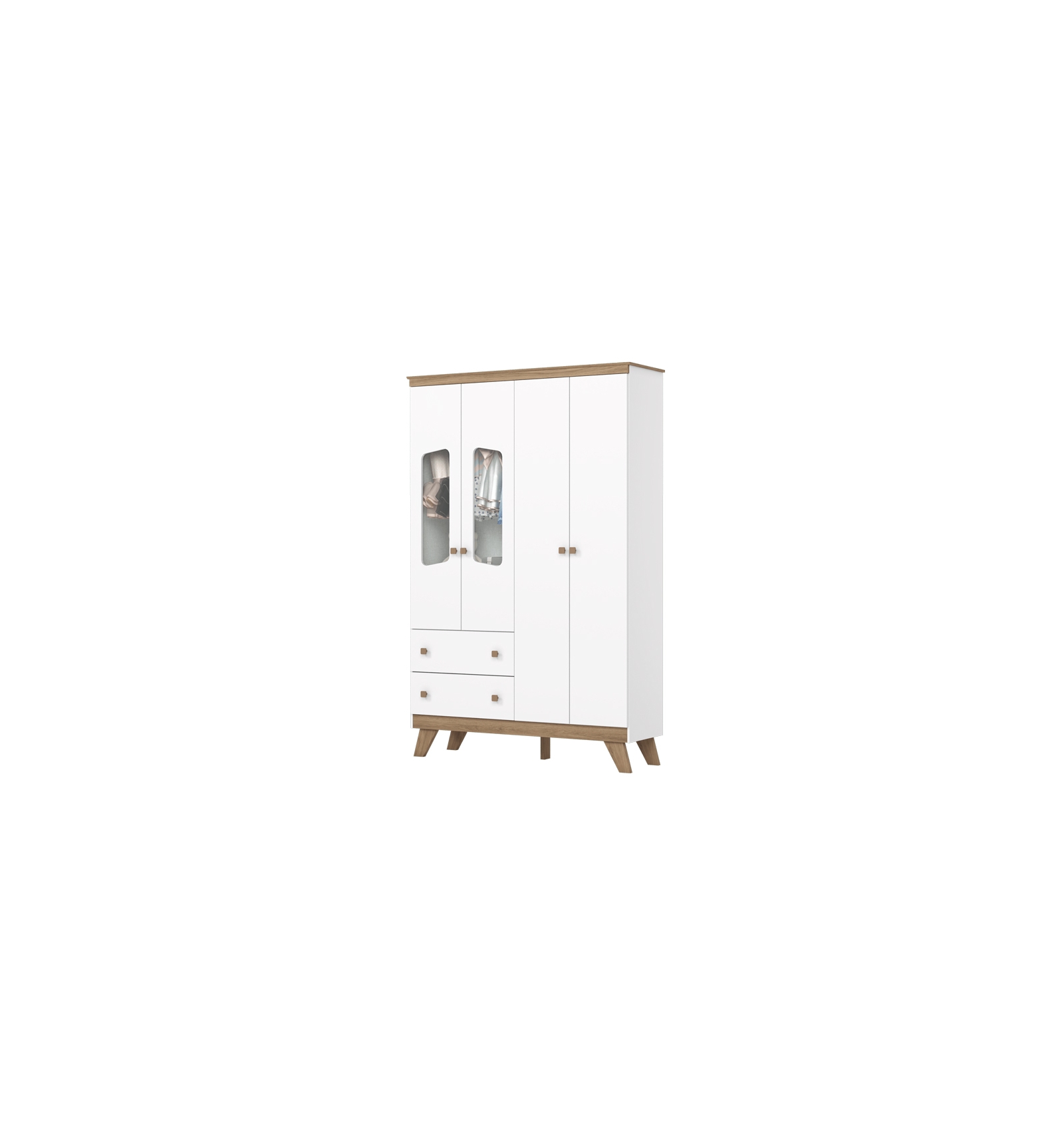 El Armario Infantil 4 Puertas 2 Cajones Clown es la solución ideal para quienes buscan un armario infantil grande y funcional para el dormitorio de los niños. Con unas medidas de 200 cm de alto x 131 cm de ancho x 41 cm de fondo, ofrece un espacio amplio y bien distribuido para guardar ropa, juguetes y complementos, manteniendo la habitación siempre organizada. Su acabado en blanco, combinado con detalles en madera natural en los tiradores, patas y molduras, aporta un diseño moderno y cálido que se adapta a cualquier estilo decorativo.