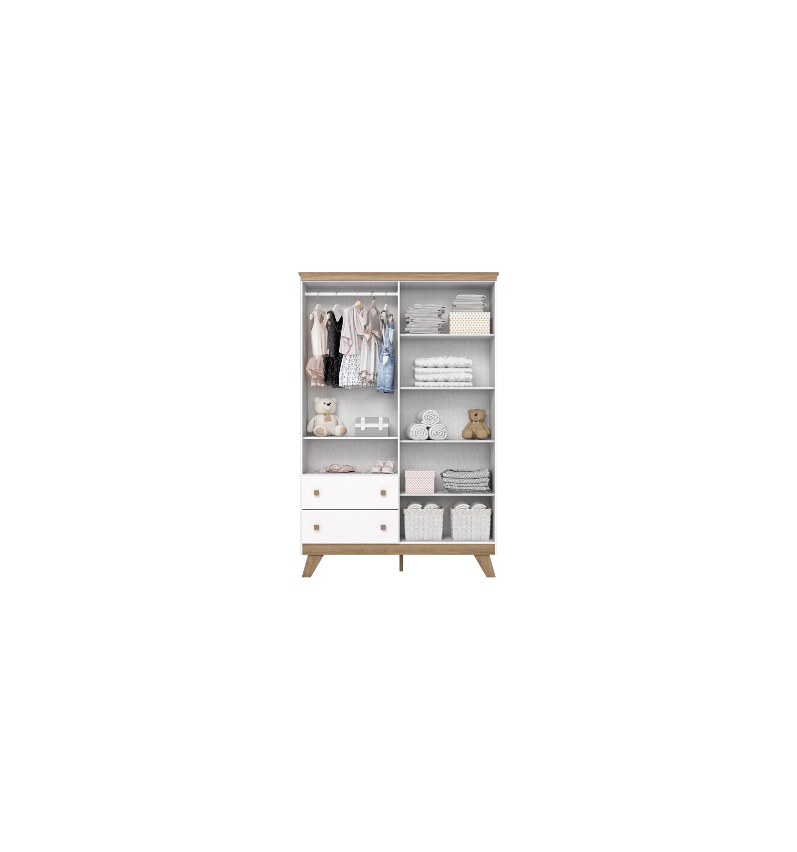 Este armario infantil de 4 puertas y 2 cajones cuenta con un interior versátil y muy práctico: una sección con barra colgadora y un estante, perfecta para vestidos, camisas y chaquetas, y otra con 5 estantes, ideal para ropa plegada, cajas organizadoras o accesorios. Los 2 cajones inferiores proporcionan espacio extra para guardar ropa interior, juguetes o artículos de uso diario. Gracias a su distribución inteligente, este armario ofrece la mejor combinación de capacidad, orden y diseño para el cuarto infantil.