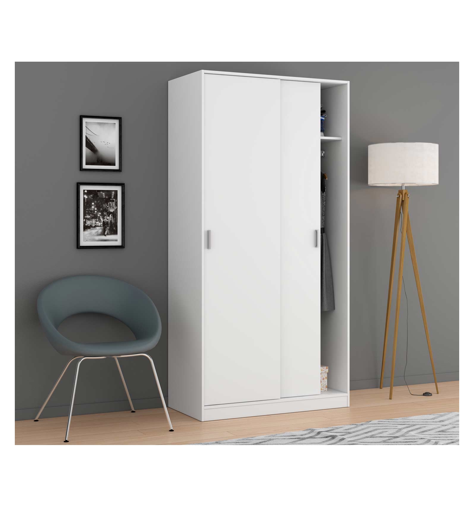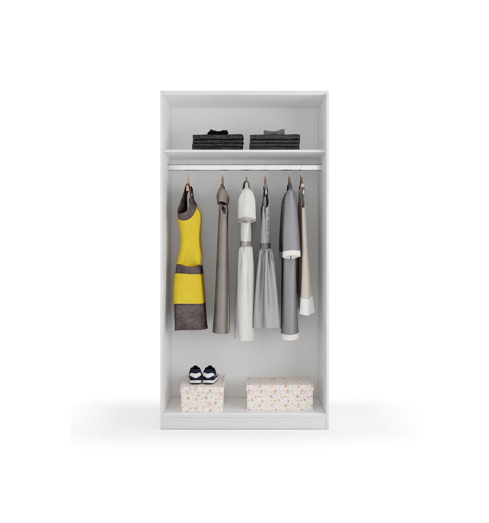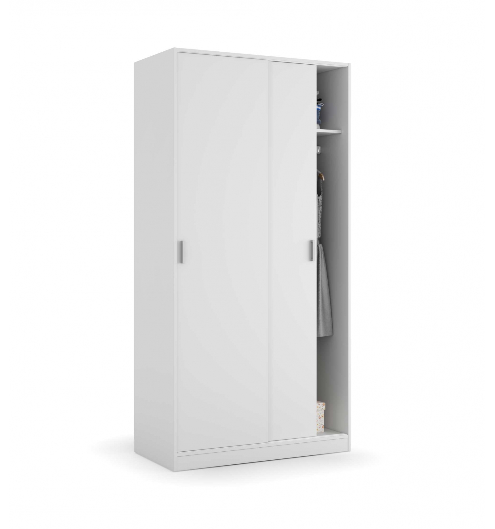 Se trata de un armario de puertas correderas muy completo ya que en su interior cuenta con una barra horizontal que cruza el armario y en la que puedes colgar toda tu ropa y un estante superior para que lo puedas utilizar como altillo.