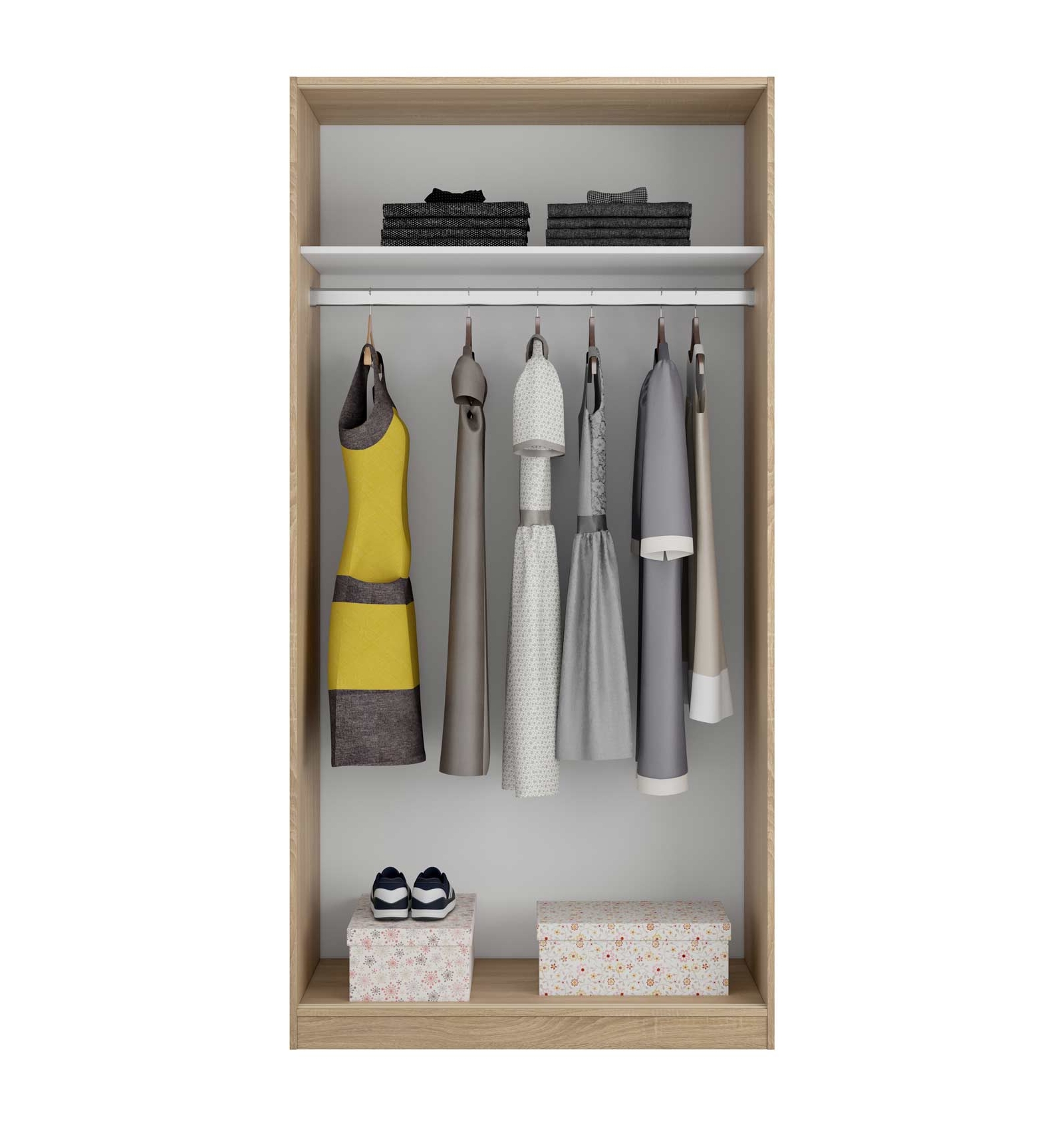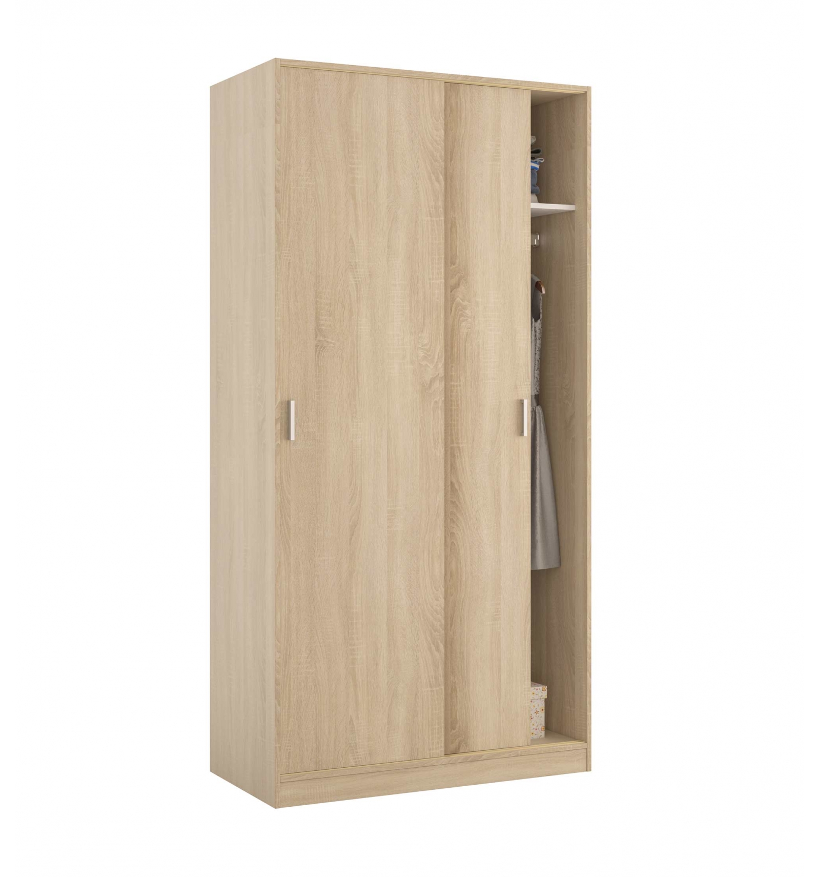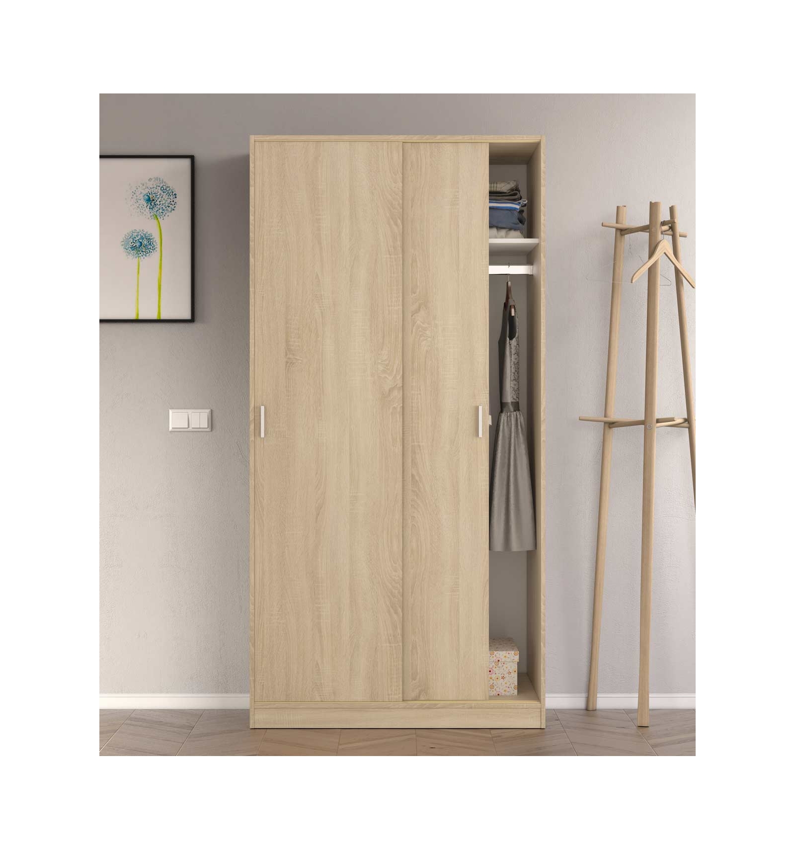 Se trata de un armario de puertas correderas muy completo ya que en su interior cuenta con una barra horizontal que cruza el armario y en la que puedes colgar toda tu ropa y un estante superior para que lo puedas utilizar como altillo.
