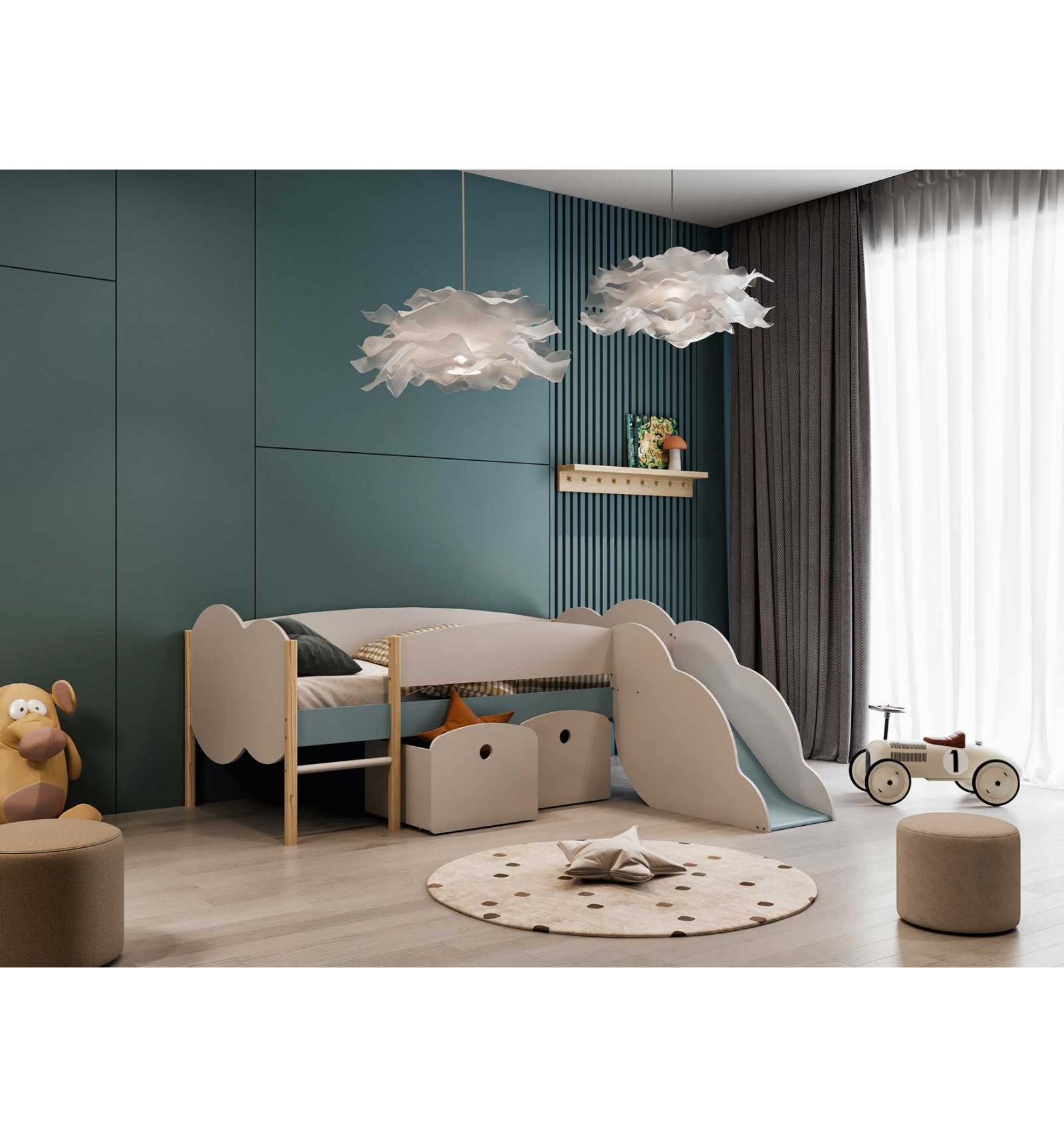 El momento de acostarse y levantarse se convierte en un divertido instante con esta preciosa cama que combina tonos pastel que emulan la naturaleza, el cielo y las nubes.