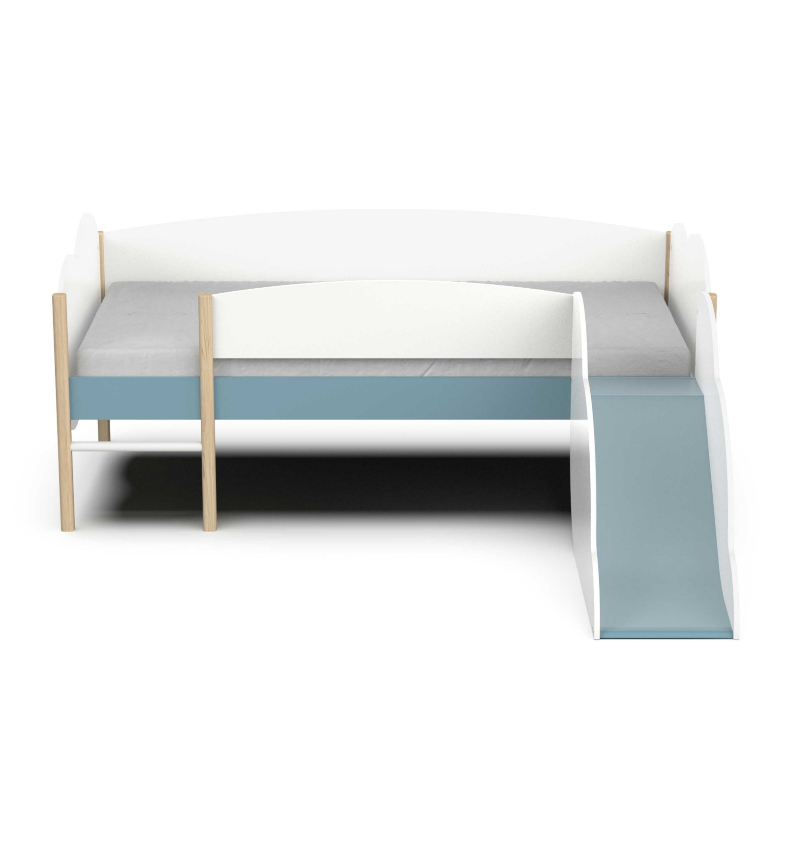 La cama infantil con tobogán Kumi es apta para colchones de 90 x 190 cm o 90 x 200 cm, escogiendo la medida durante el montaje. El tobogán y la escalera pueden intercambiarse.