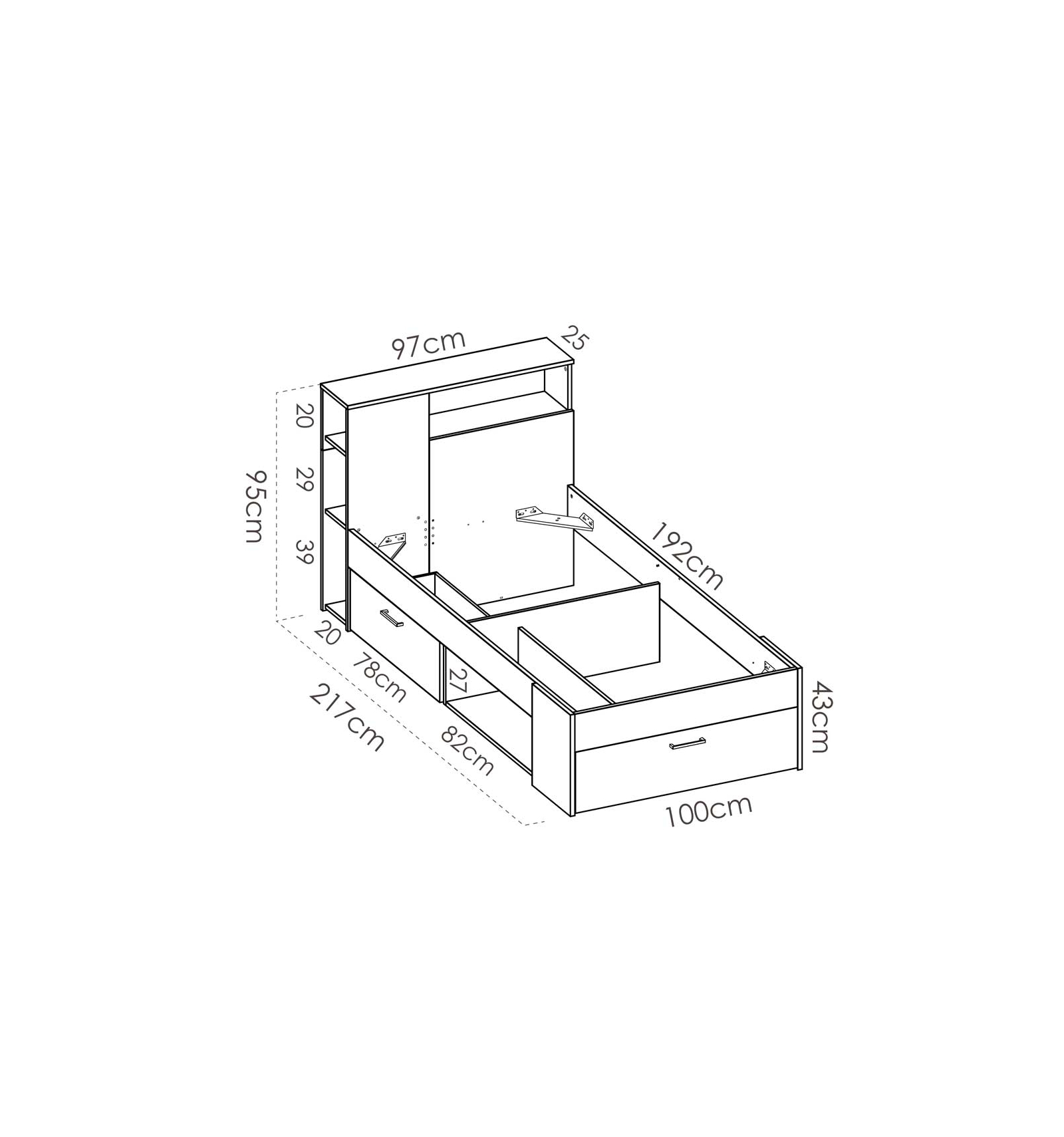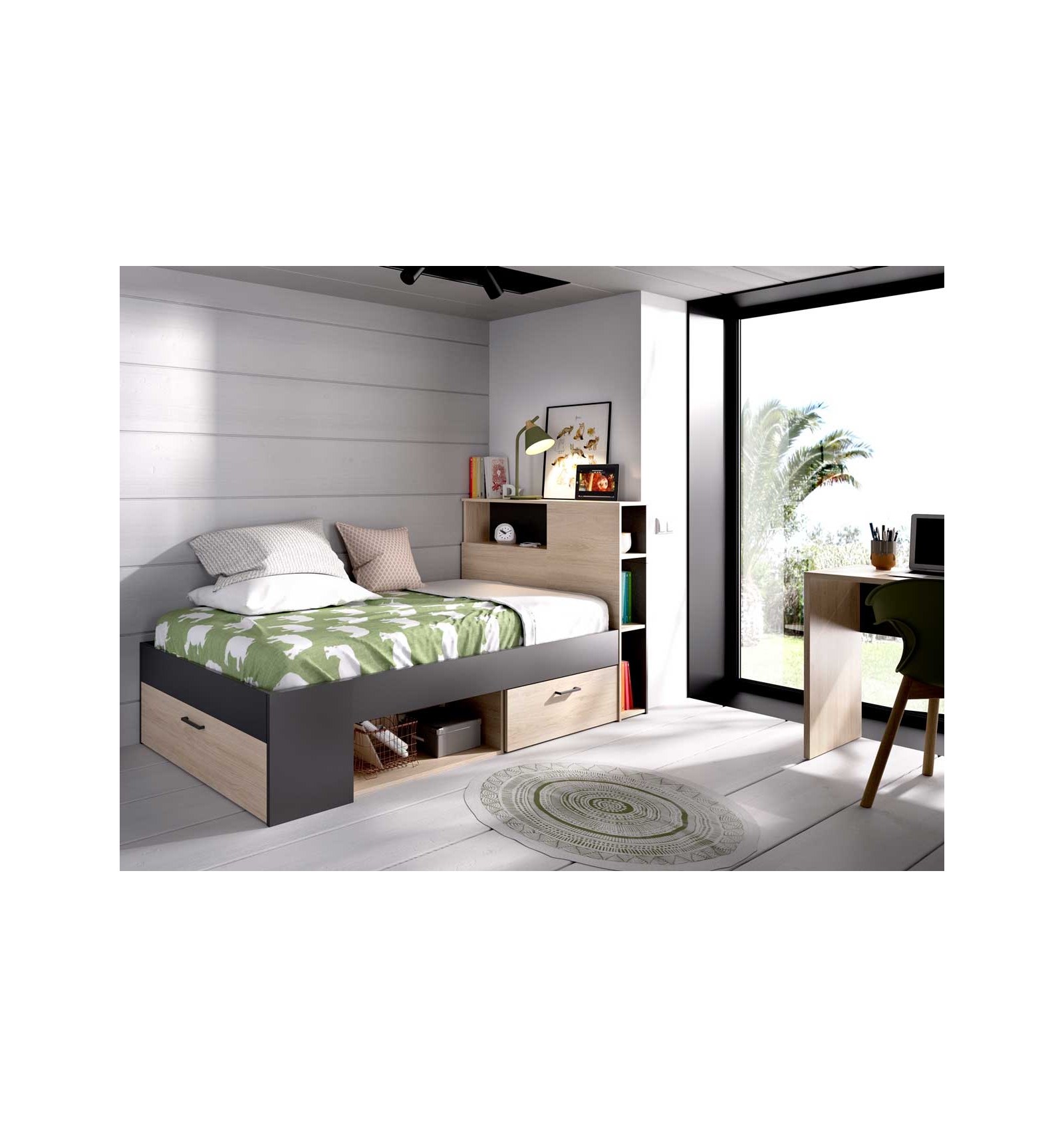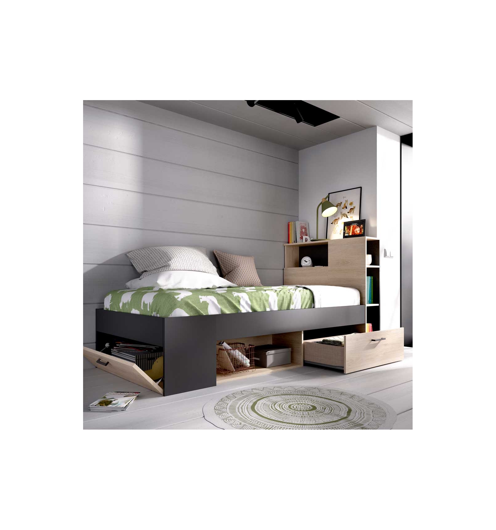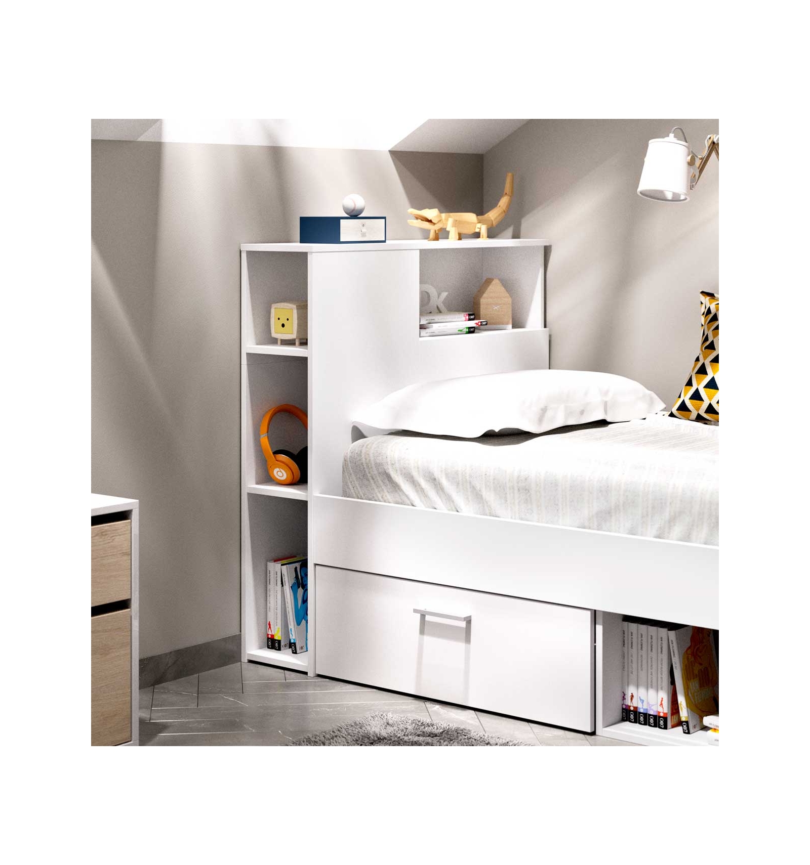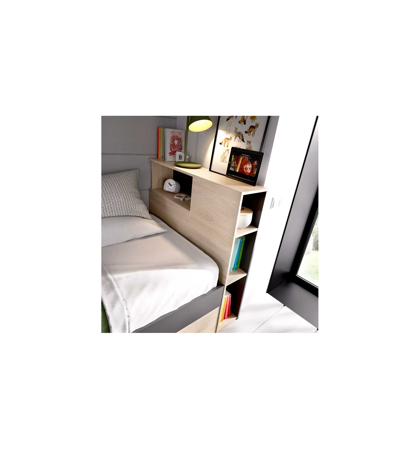 Una habitación juvenil no por ser pequeña debe ser menos estilosa y con la cama Memory lo conseguirás. Esta cama con cajones y estantes es la solución ideal para tener un dormitorio organizado, limpio y espacioso. Cuenta con un cajón inferior para que tu hijo pueda tenerlo todo ordenado, una puerta abatible al pie de la cama, estante inferior, 3 estantes laterales y uno superior que se puede utilizar como mesita de noche, para guardar el móvil, la lectura o las gafas.