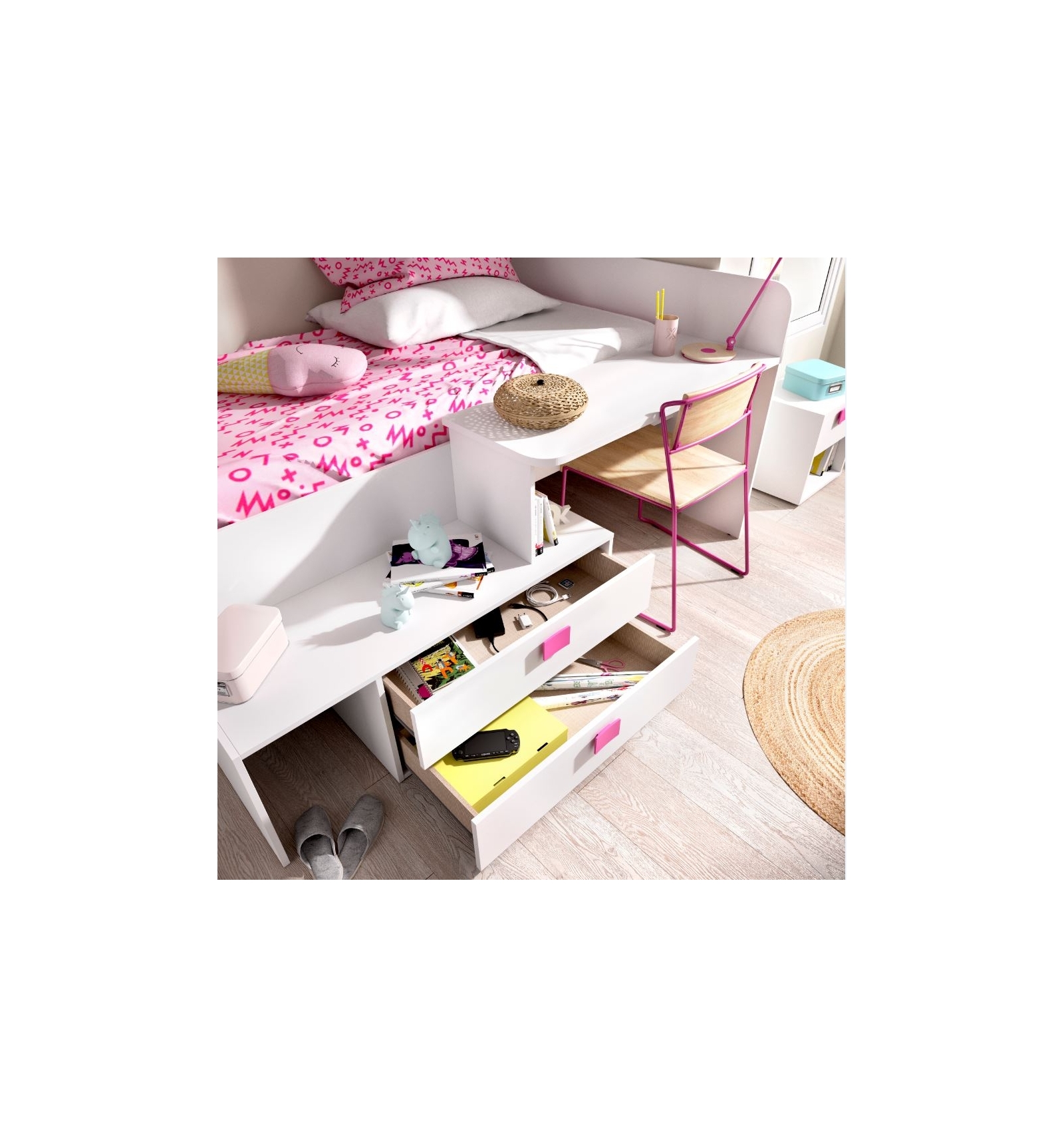 La cama compacta con escritorio y cajones Dalila está concebida para disponer en todo momento de lo que necesitas. Todo a la vista, todo para ser utilizado.