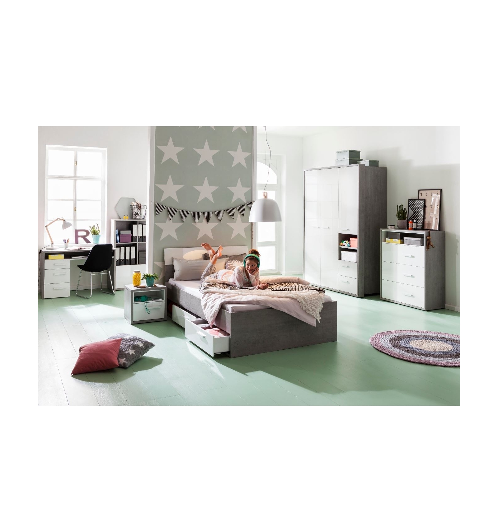 Su estructura principal está realizada en panel ecológico melamínico de 25 mm de espesor con revestimiento en gris cemento. La cama estelar incluye un moderno cabecero en tono bicolor blanco / cemento.