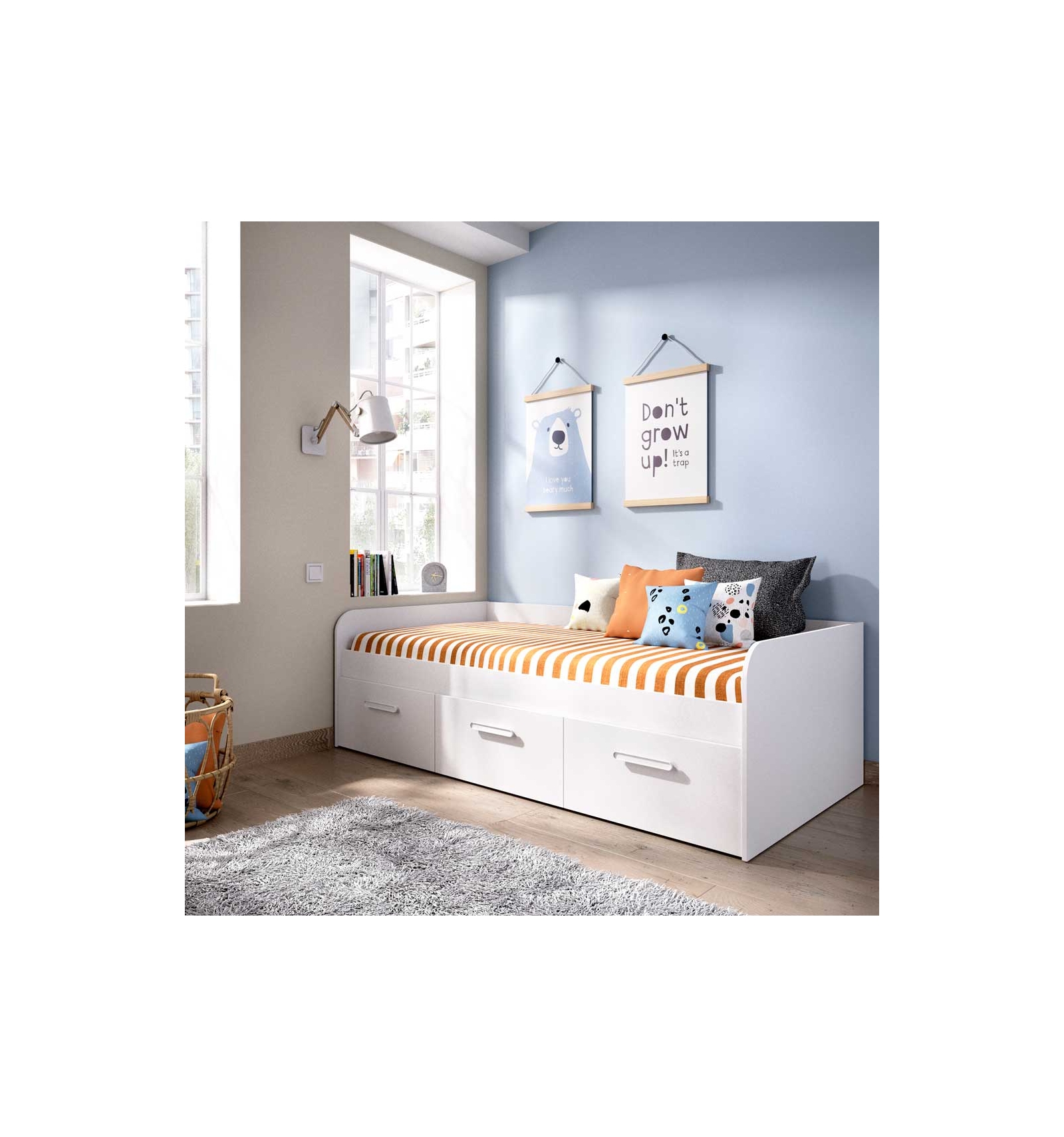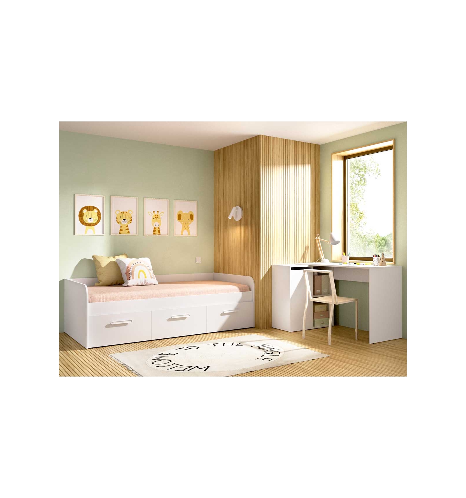 | Otras características: | Tiradores ABS en acabado Blanco. Ruedas unidireccionales de Nylon con soporte metálico en el cajón extraíble. Soportes de somier metálicos. |
