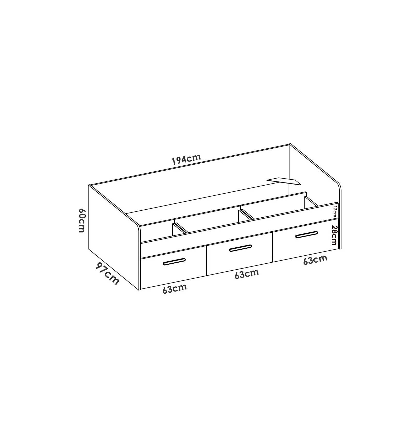 Con medidas totales de 194 x 97 x 60 cm de alto, es compatible con colchones de 90 x 190 cm, proporcionando una cómoda superficie para dormir.