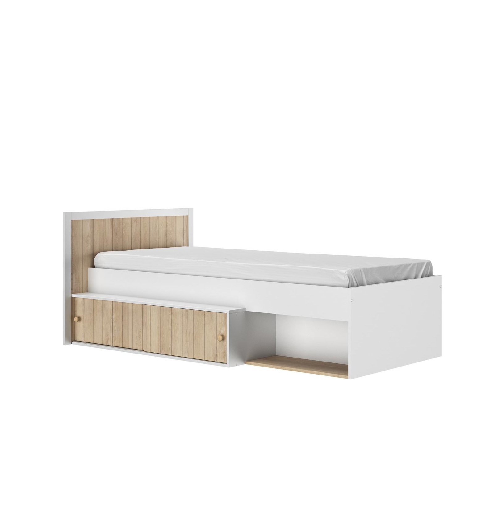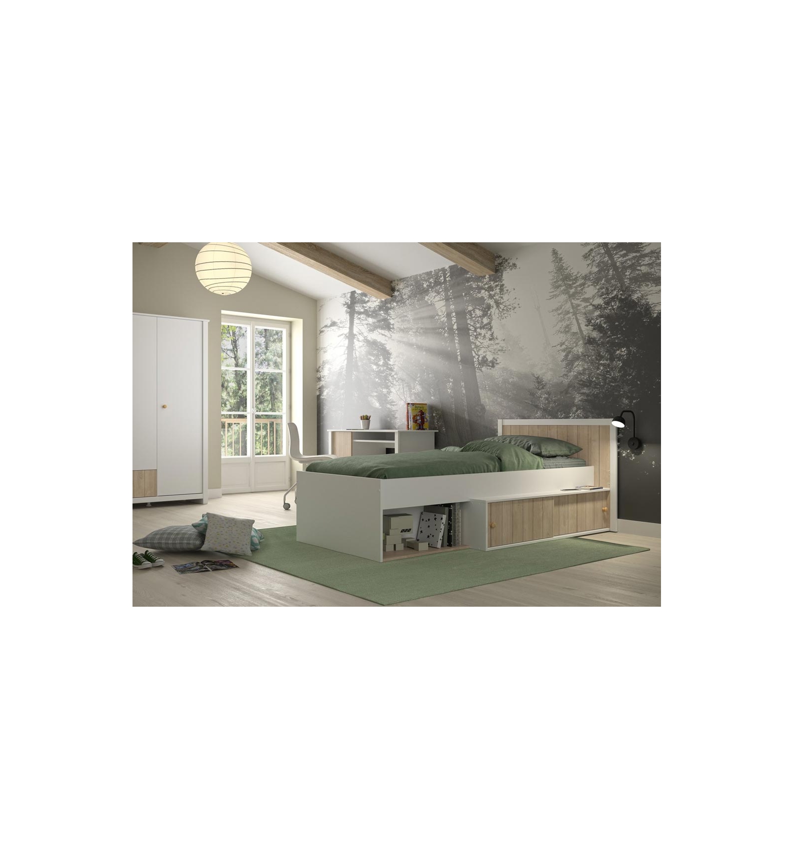 CAMA JUVENIL DE ESTILO NORDICO EN TONOS BLANCO Y ROBLE Y CON ALMACENAJE.