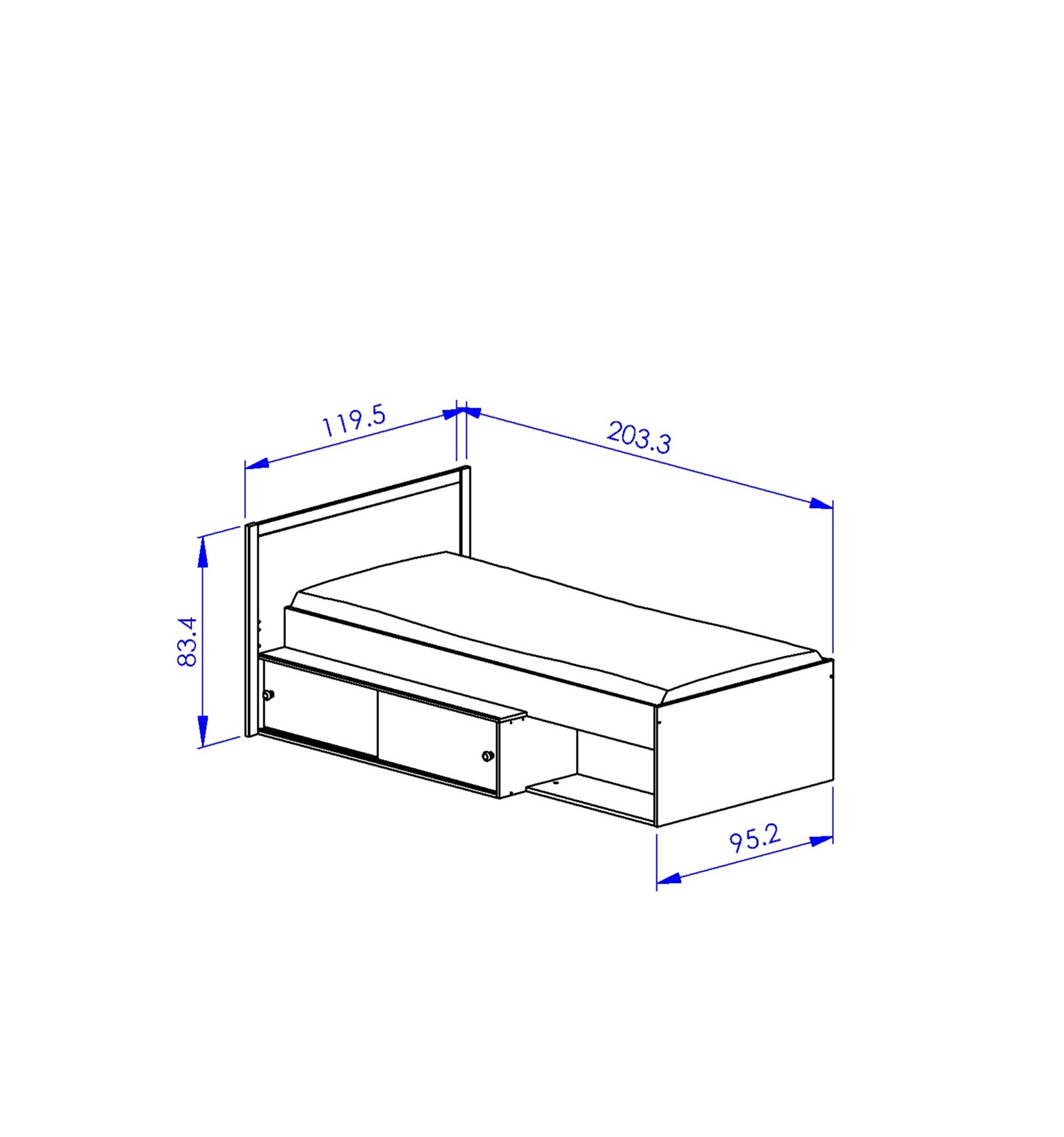 La cama juvenil Postel destaca por su originalidad, ya que se trata de un mueble que incluye un armario de puertas correderas en su parte inferior y un estante permitiendo guardar objetos personales y libros cómodamente.