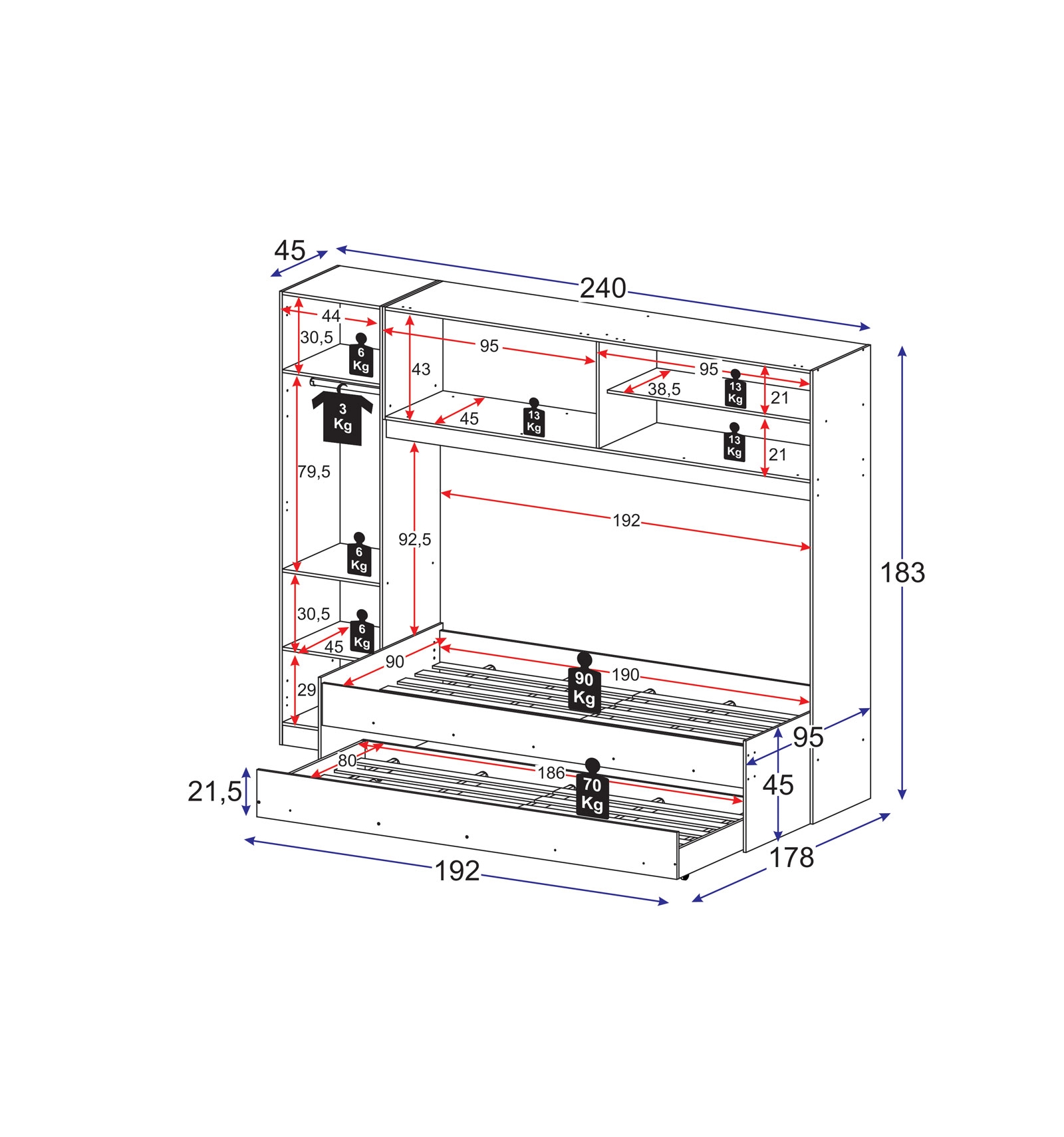 | Medidas cama supletoria: | 80 x 186 cm |
