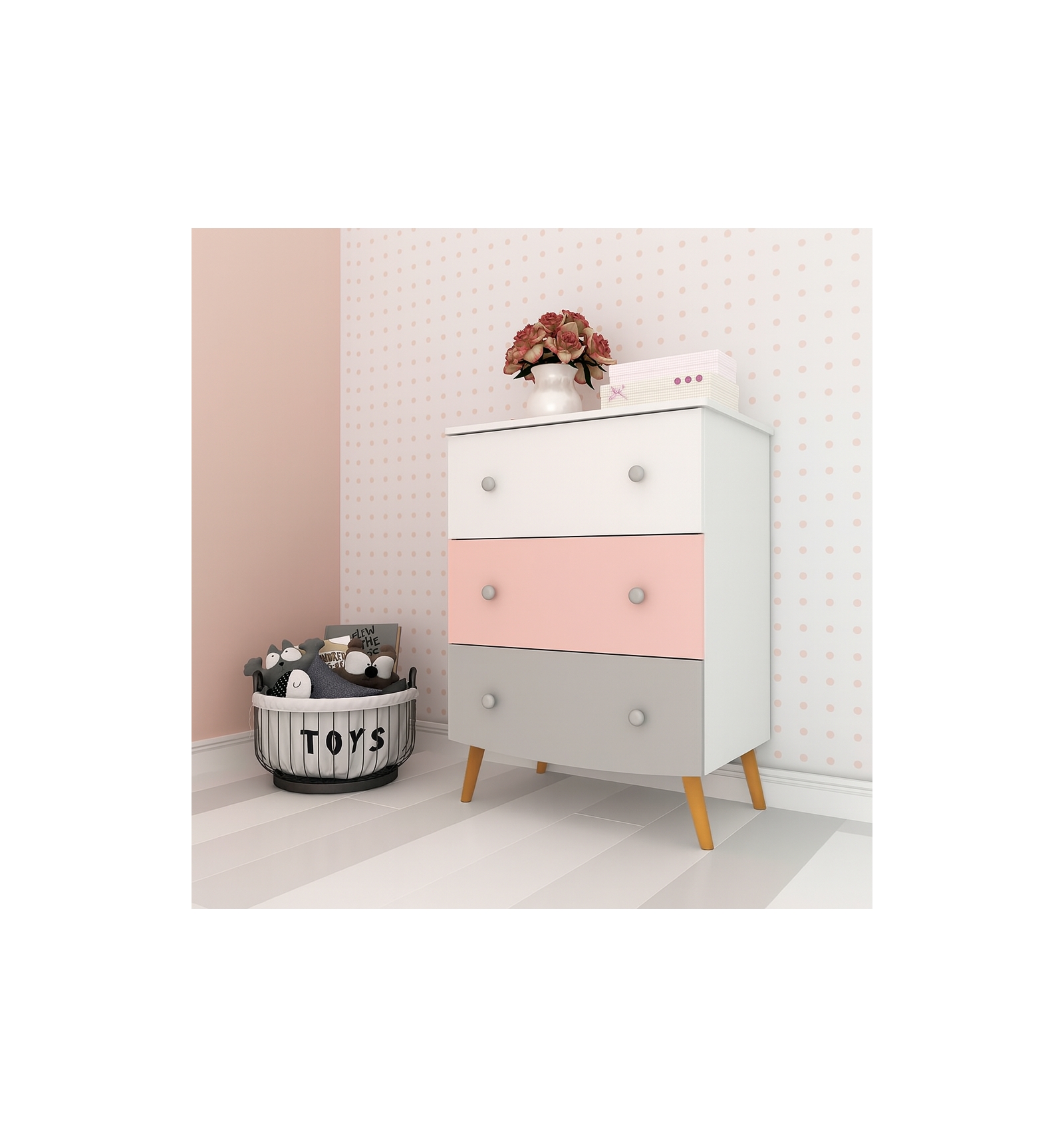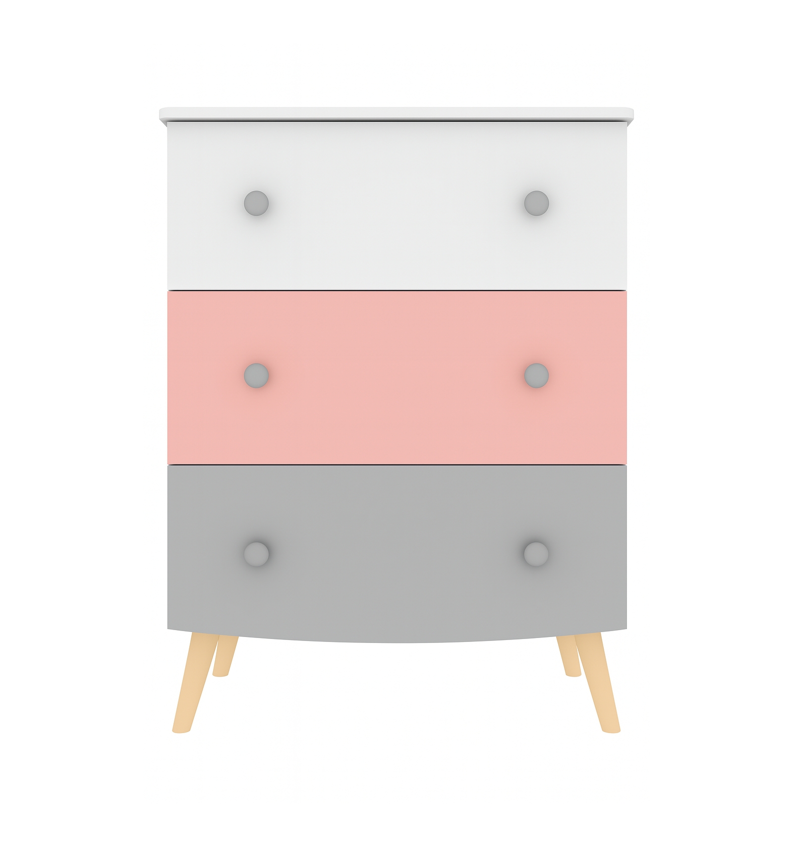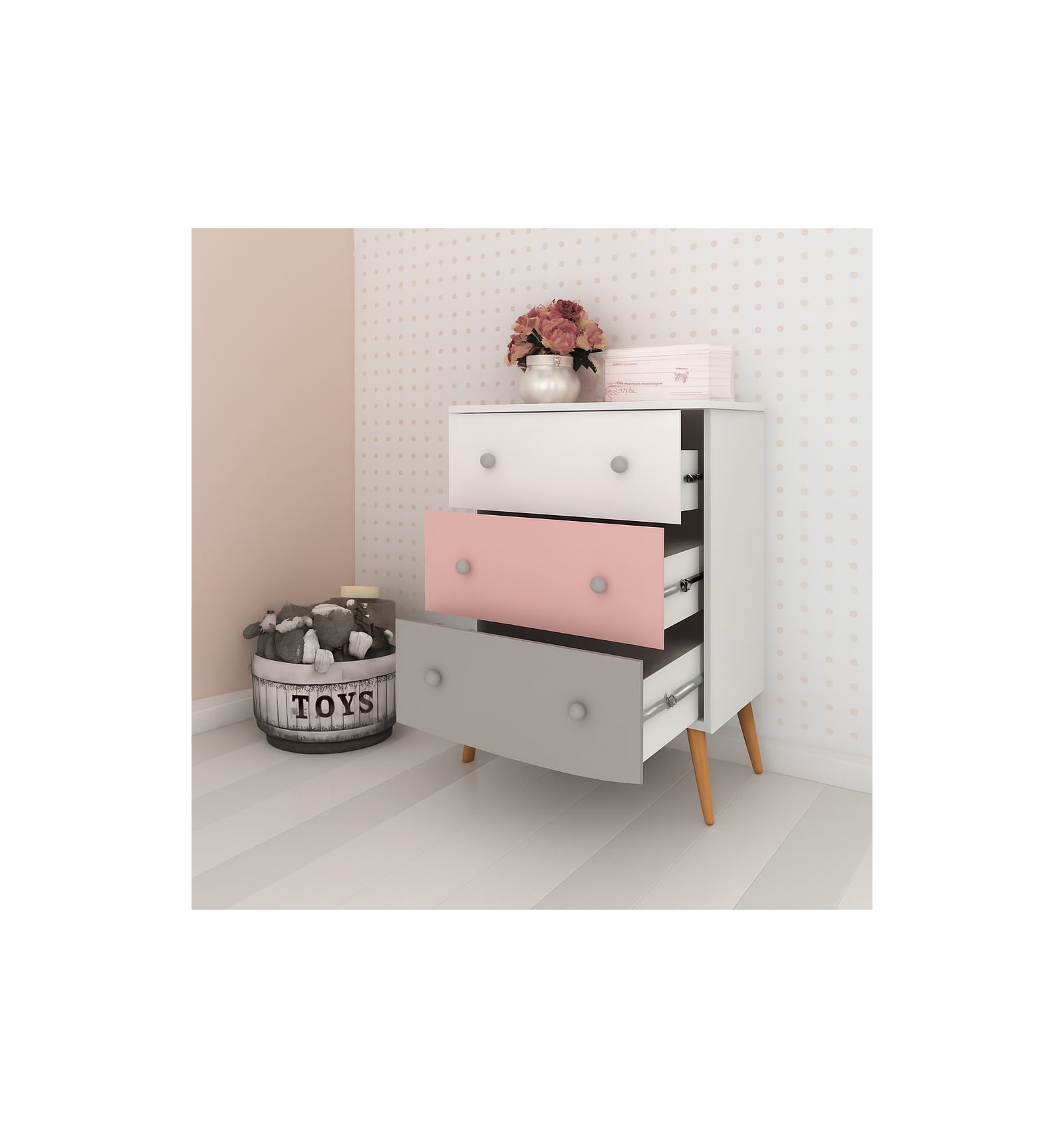 La Cómoda Ringo combina diseño moderno y materiales resistentes. Su paleta en blanco, gris y rosa crea una atmósfera cálida y encantadora para el dormitorio infantil.