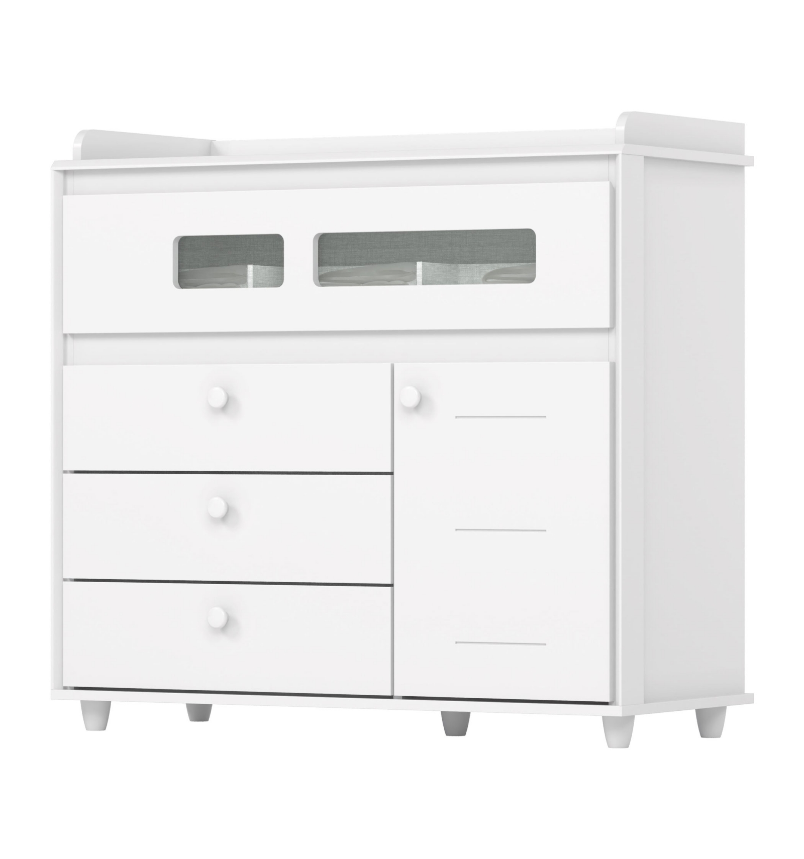 La Cómoda infantil con cambiador Celeste de 4 Cajones y 1 puerta es la solución perfecta para mantener el dormitorio de los niños siempre organizado, sin renunciar al estilo y la calidad. Con un diseño moderno, funcional y acabados sofisticados, este mueble se adapta a diferentes decoraciones y ofrece un amplio espacio de almacenamiento.