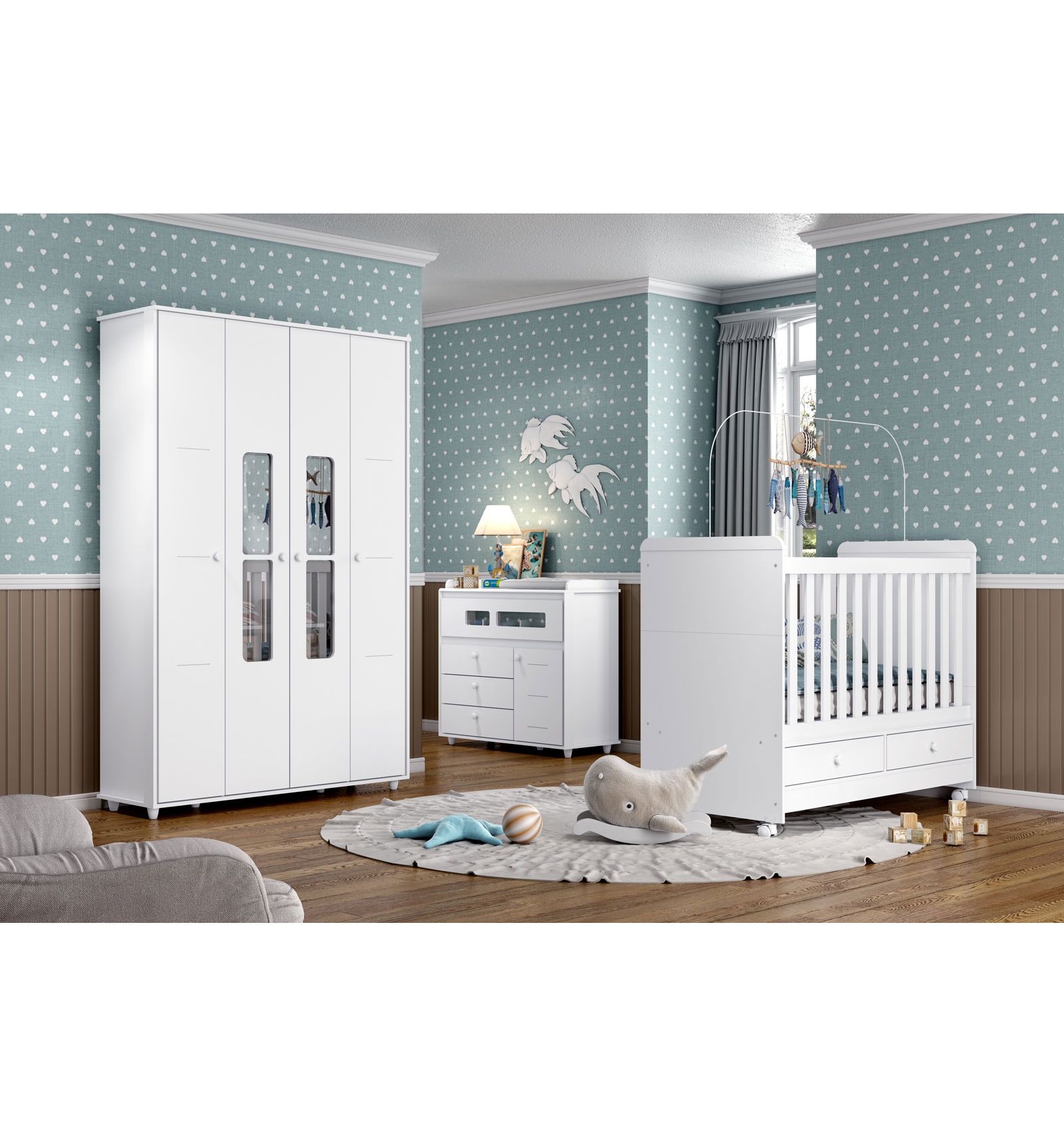 Con un elegante diseño en color blanco y detalles mecanizados en las puertas y cajones, la Cómoda infantil con cambiador Celeste aporta un toque delicado y moderno al ambiente infantil.