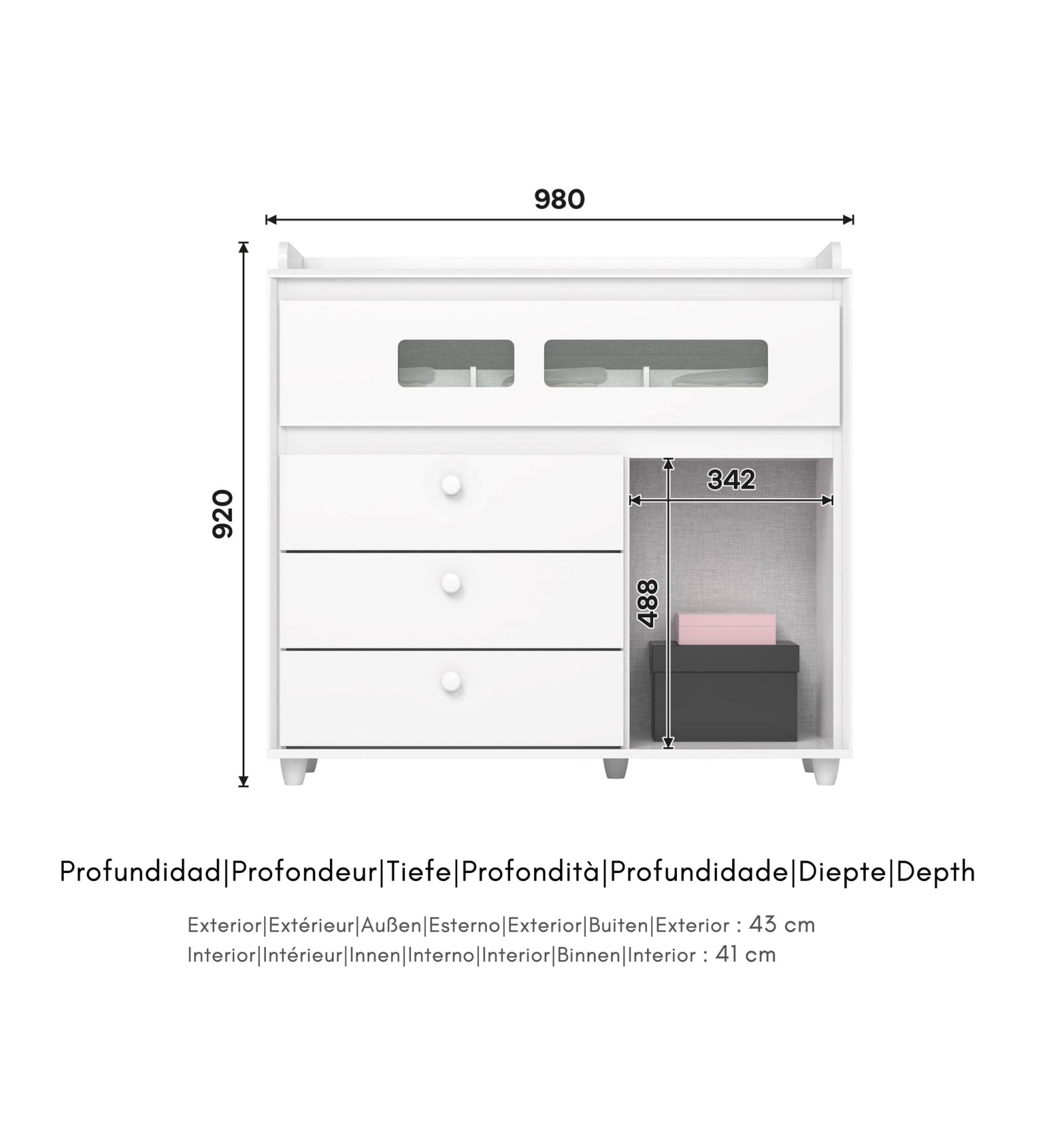 - 4 cajones espaciosos con correderas metálicas, ideales para guardar ropa, pañales y accesorios.