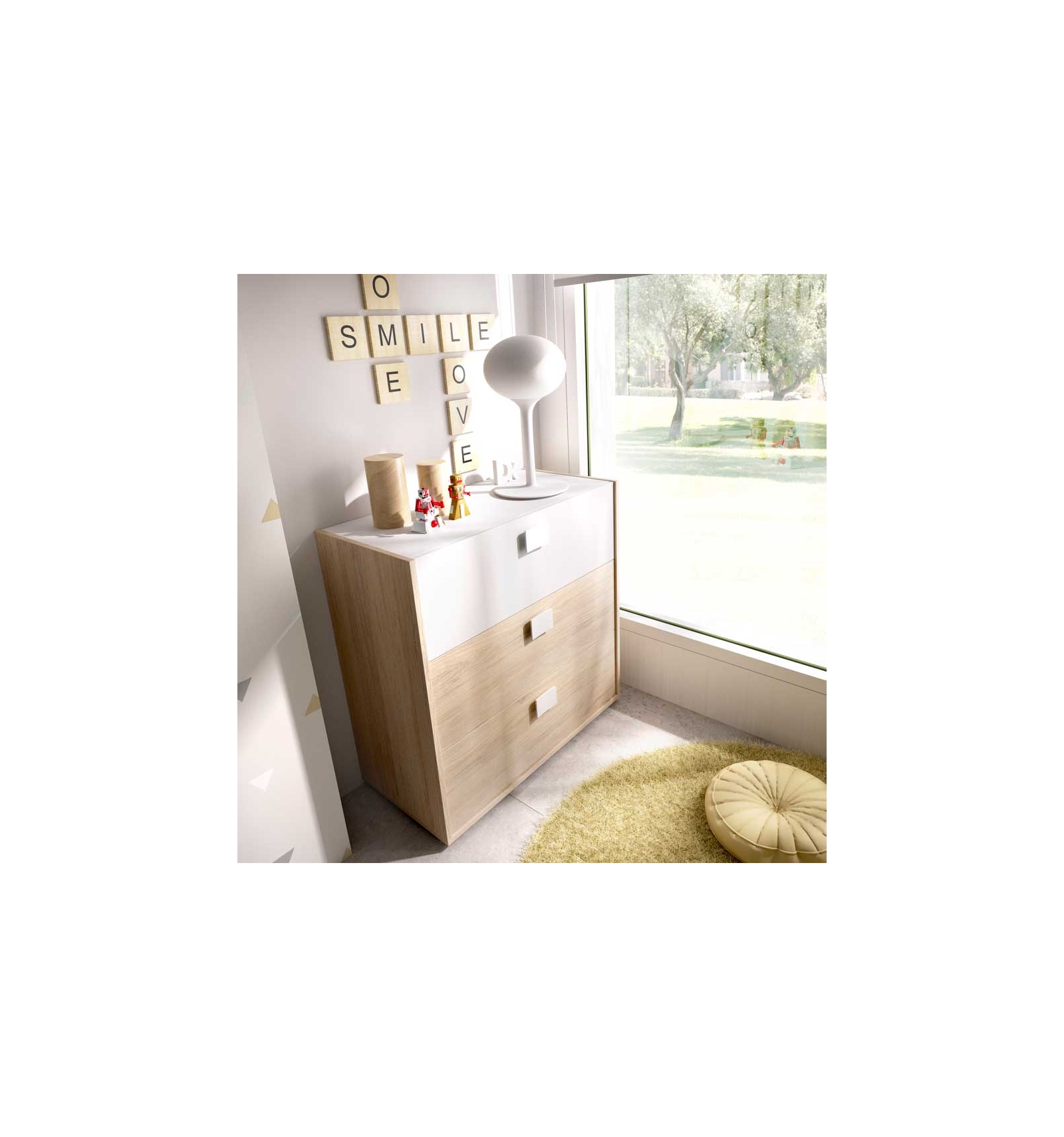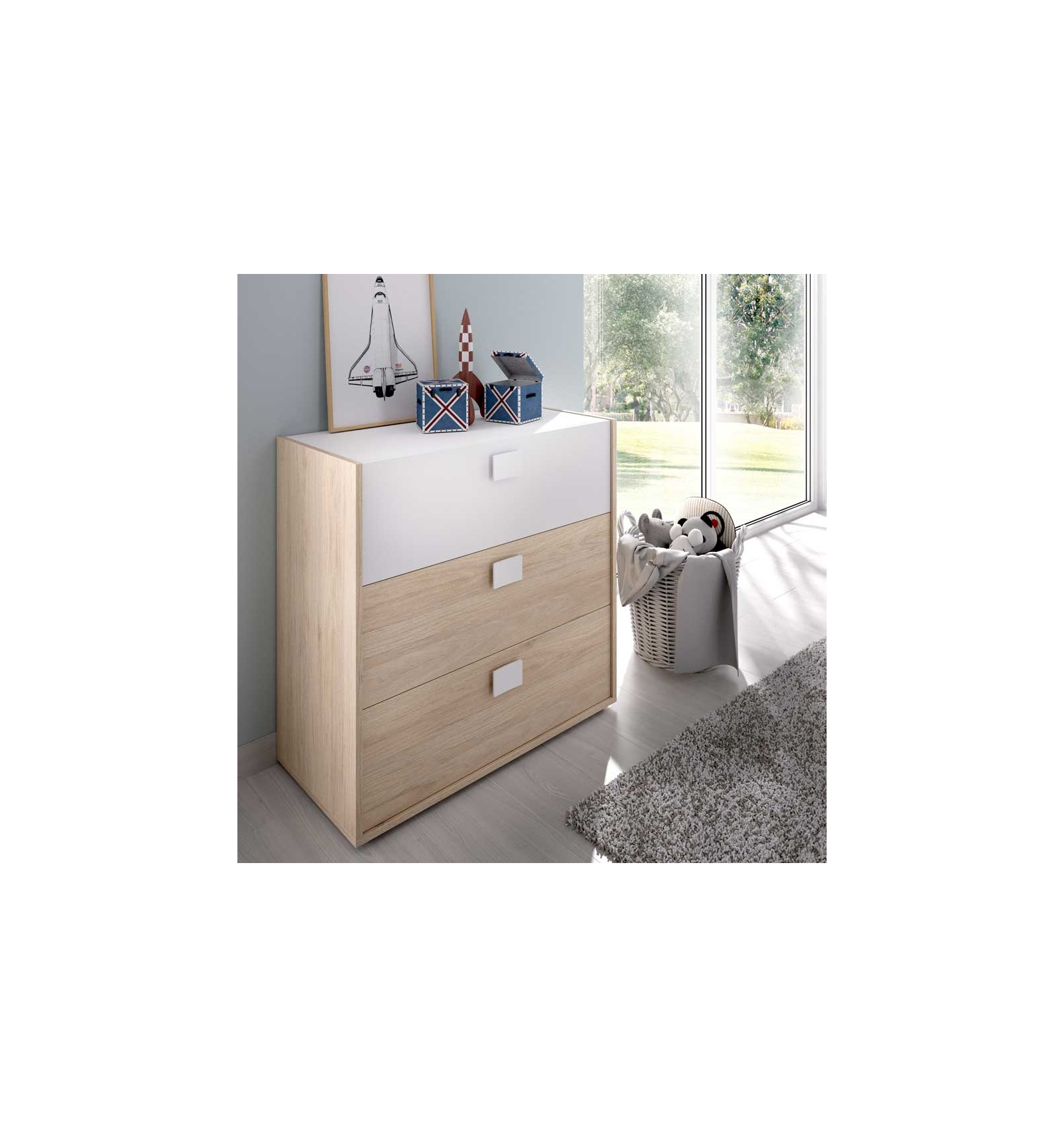 La cómoda presenta 3 cajones con tiradores cuadrados de color blanco con gran capacidad de almacenamiento para guardar lo que desees. El color natural y blanco le dará un aire moderno a la habitación con el que la podrás combinar perfectamente con cualquier mueble. ¡Pero qué mejor manera que hacerlo con el resto de muebles Limo!