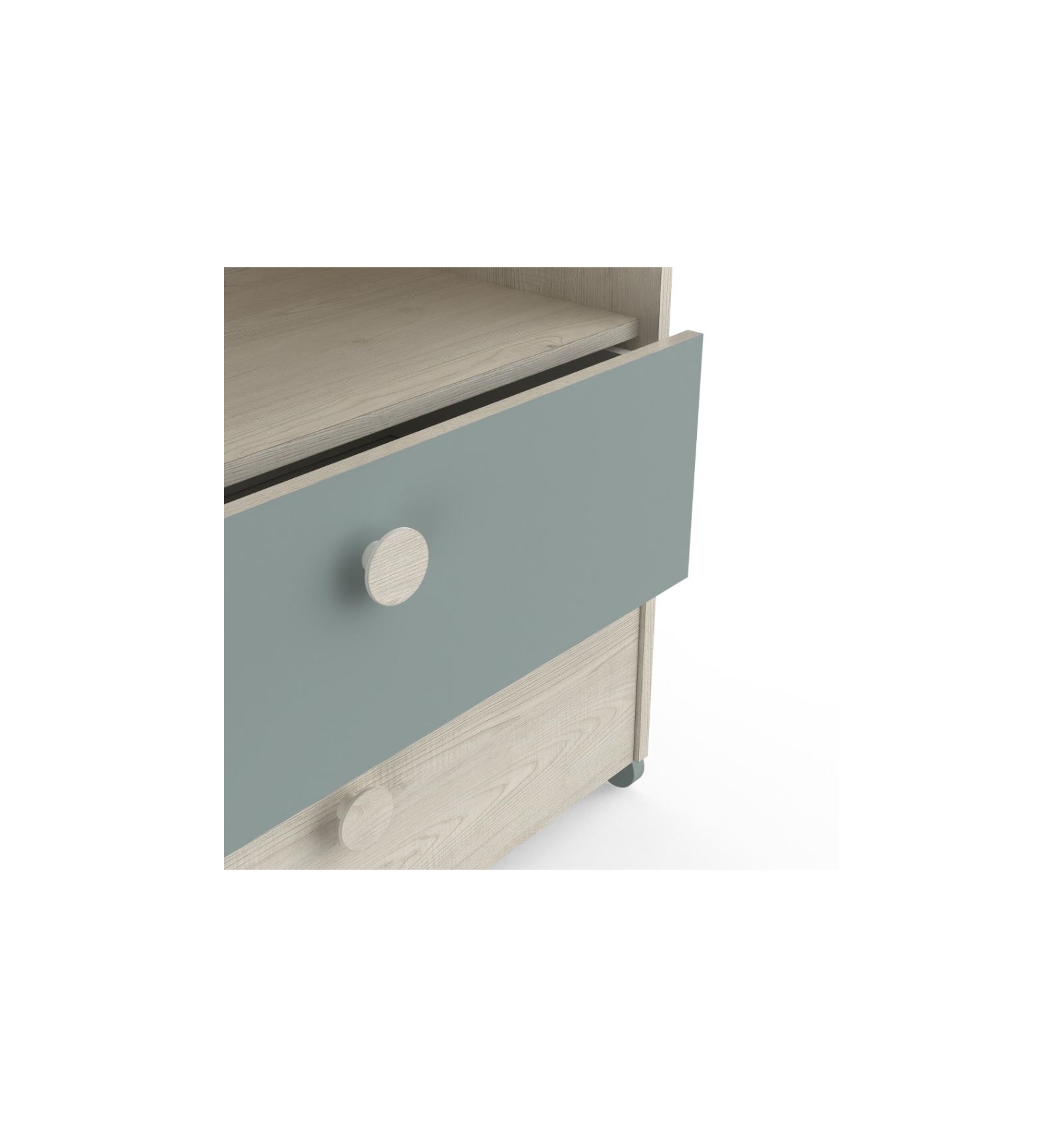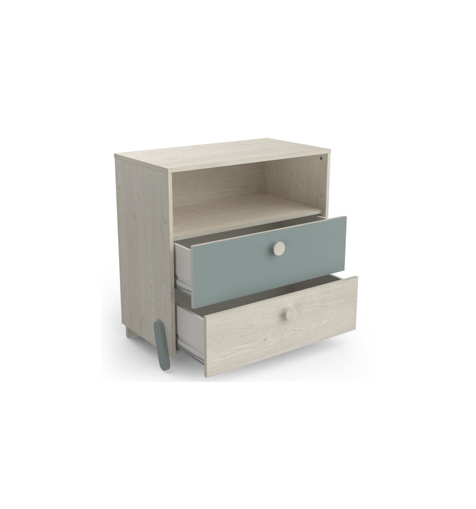 Cuenta con 2 cajones con tiradores redondos y un espacio extra de almacenaje descubierto muy funcional.