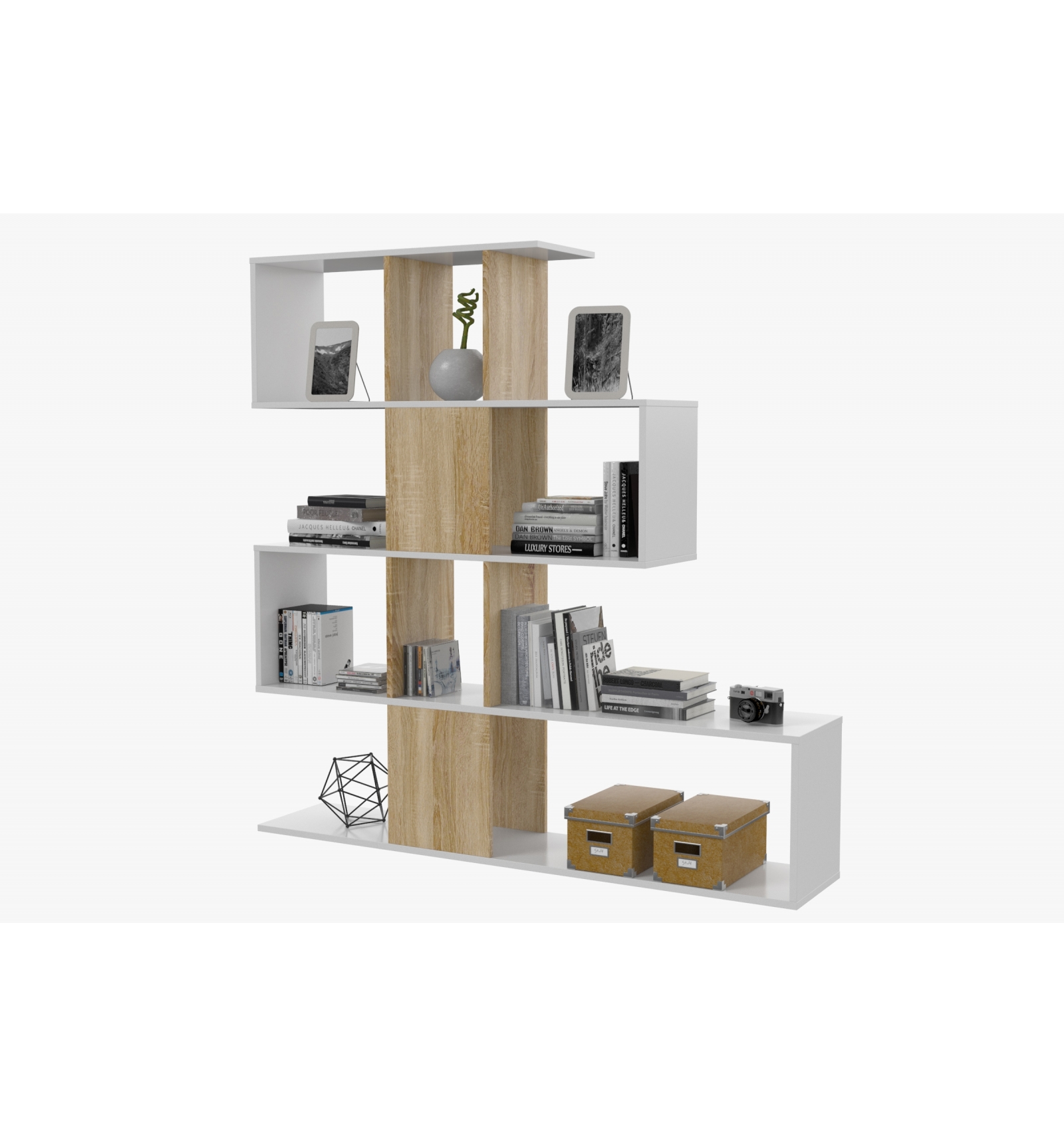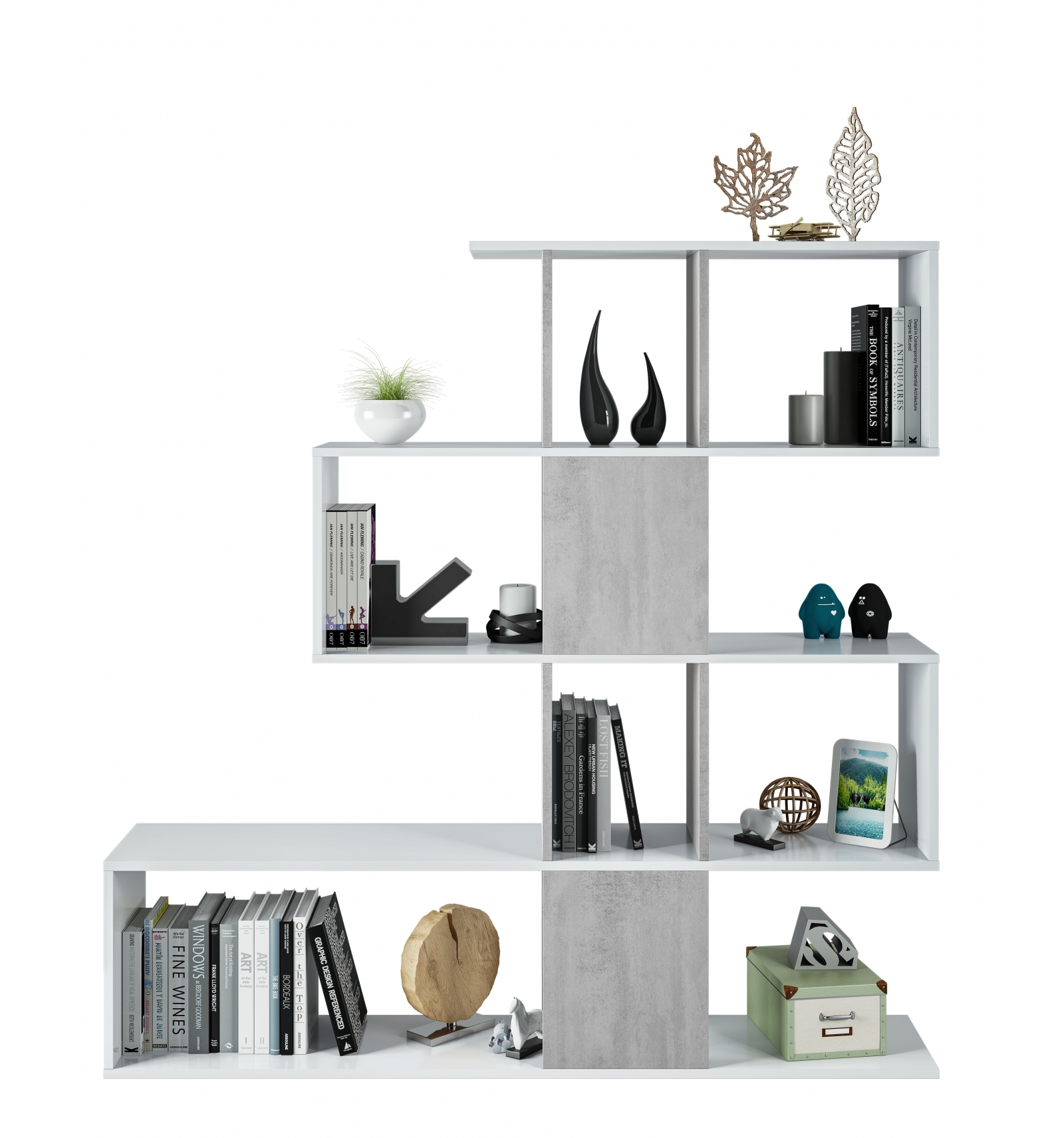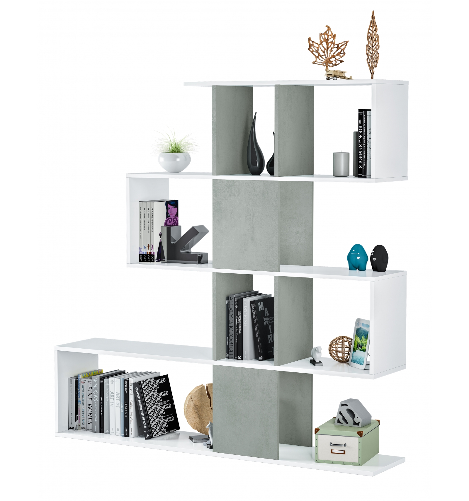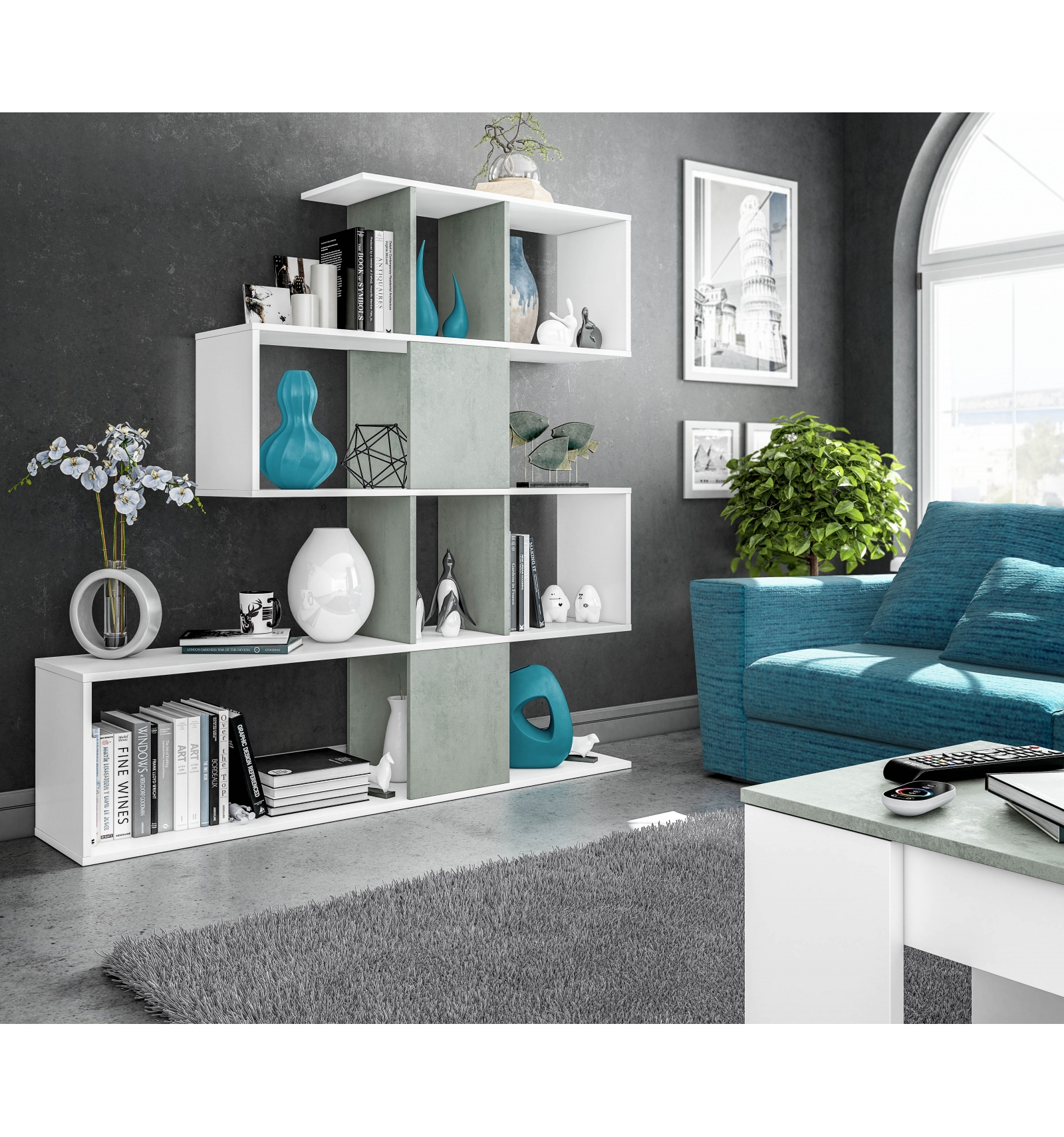 Original estantería separadora con diseño irregular en forma de zigzag que ofrece gran cantidad de compartimentos en los que podrás colocar todo tipo de objetos o decoración.