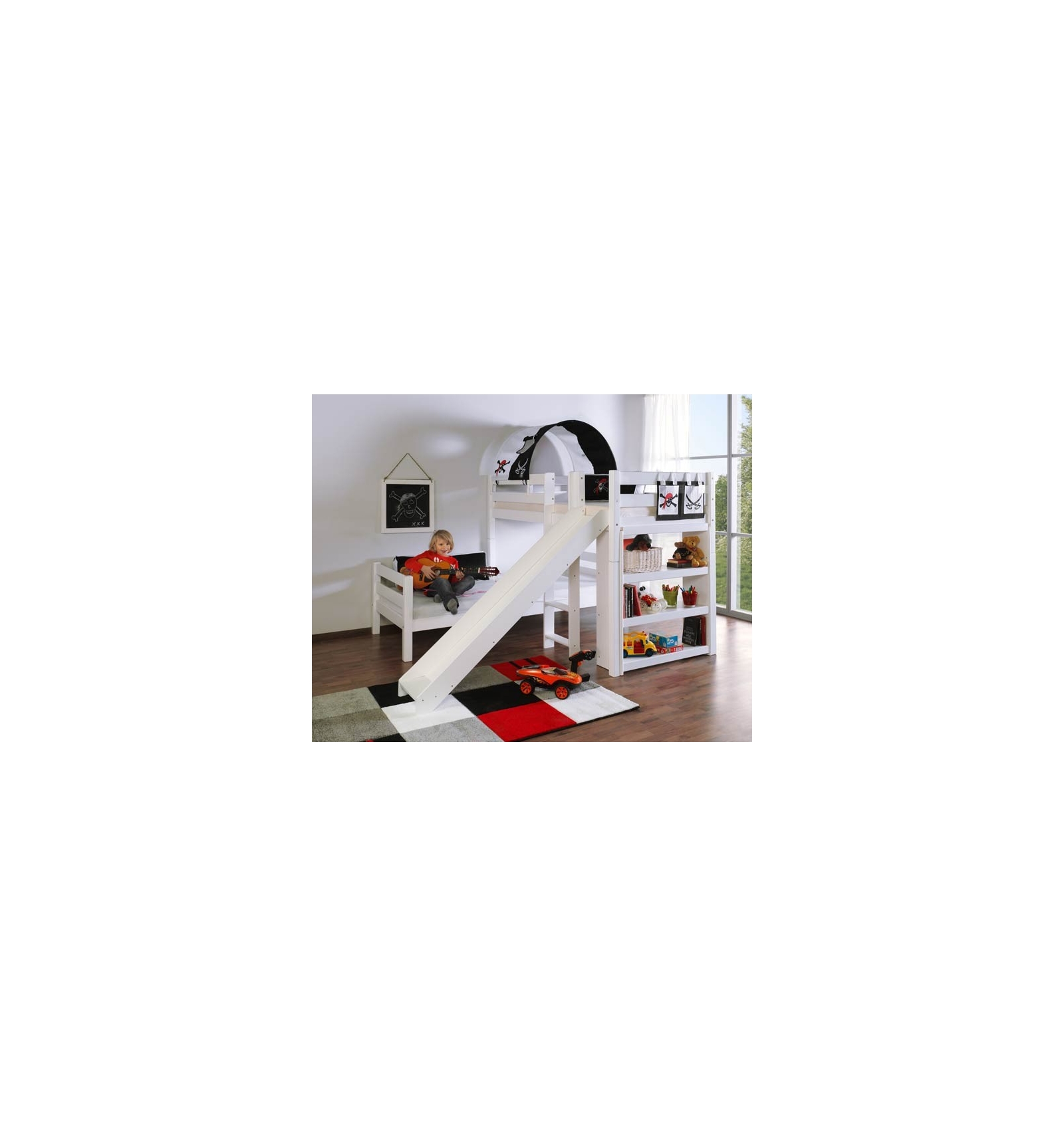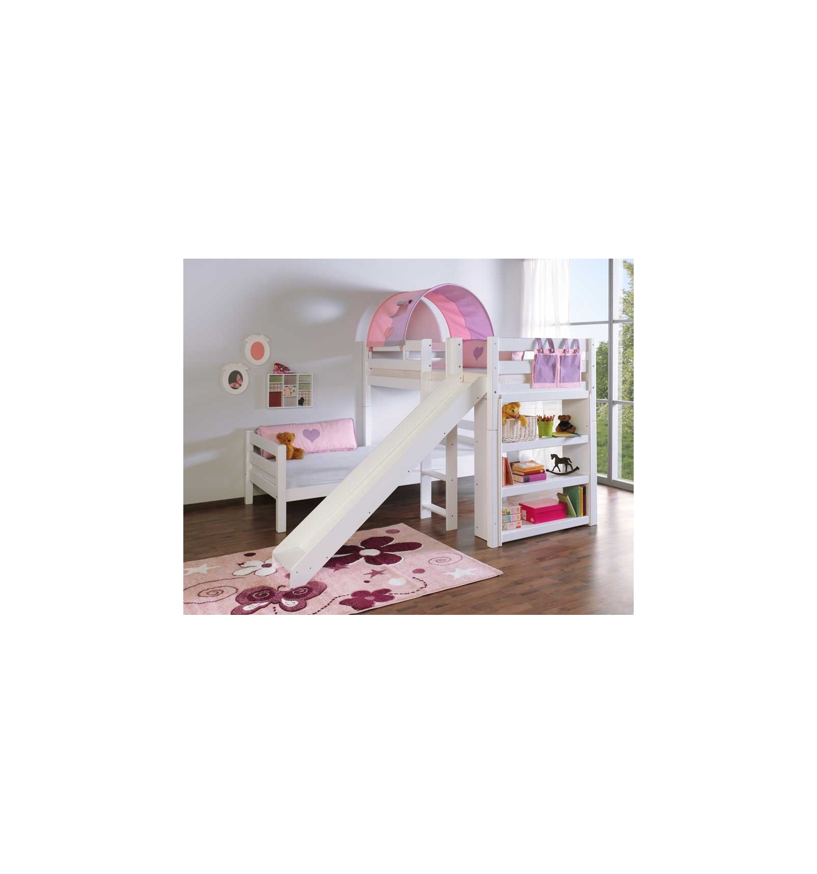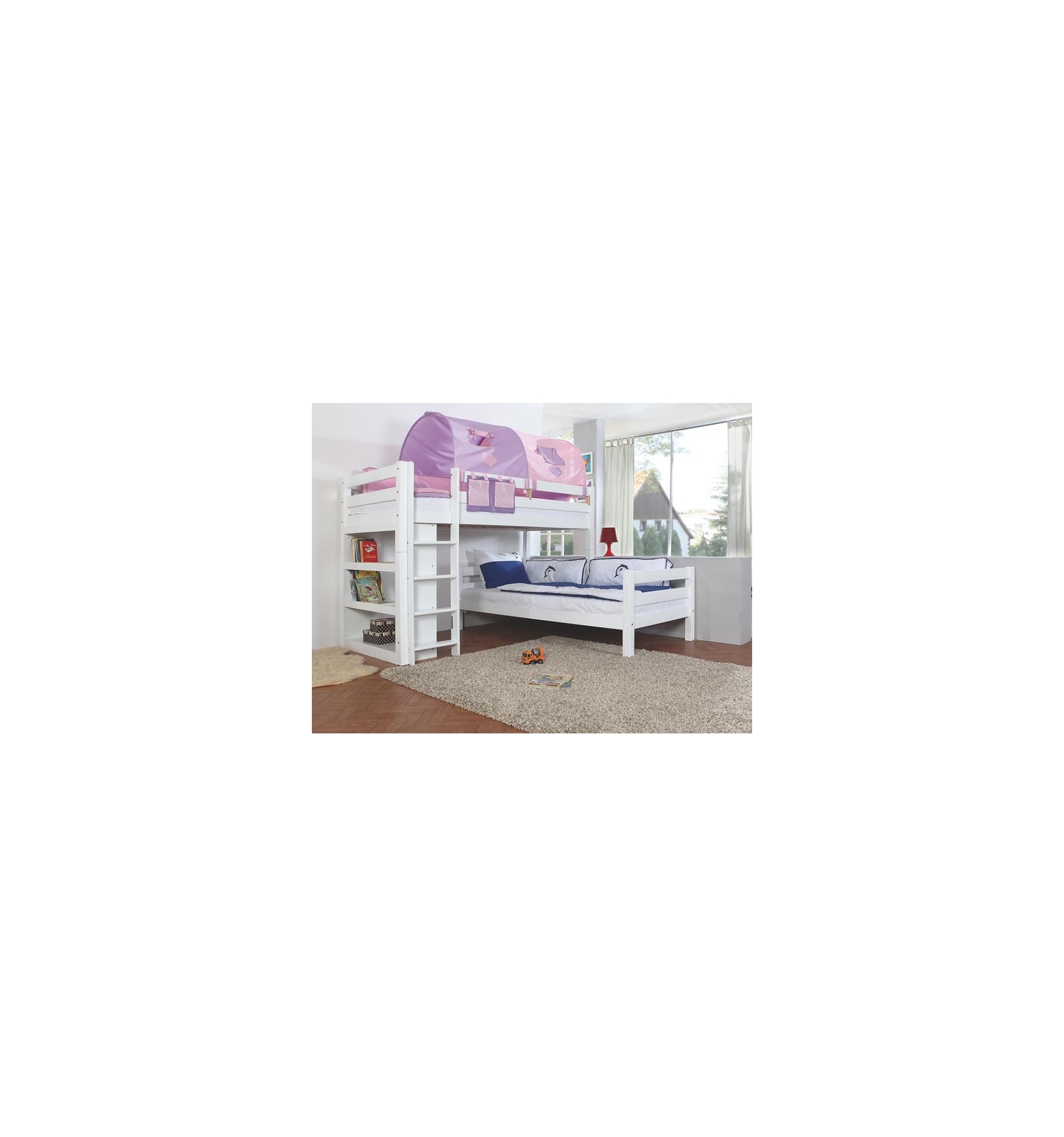 La litera infantil Tirreno es la solución perfecta para aprovechar cada rincón del dormitorio. Su diseño en ángulo ofrece una zona inferior práctica para jugar, leer o colocar una mesita de noche. Fabricada en madera maciza de haya, combina resistencia, estilo y confort.
