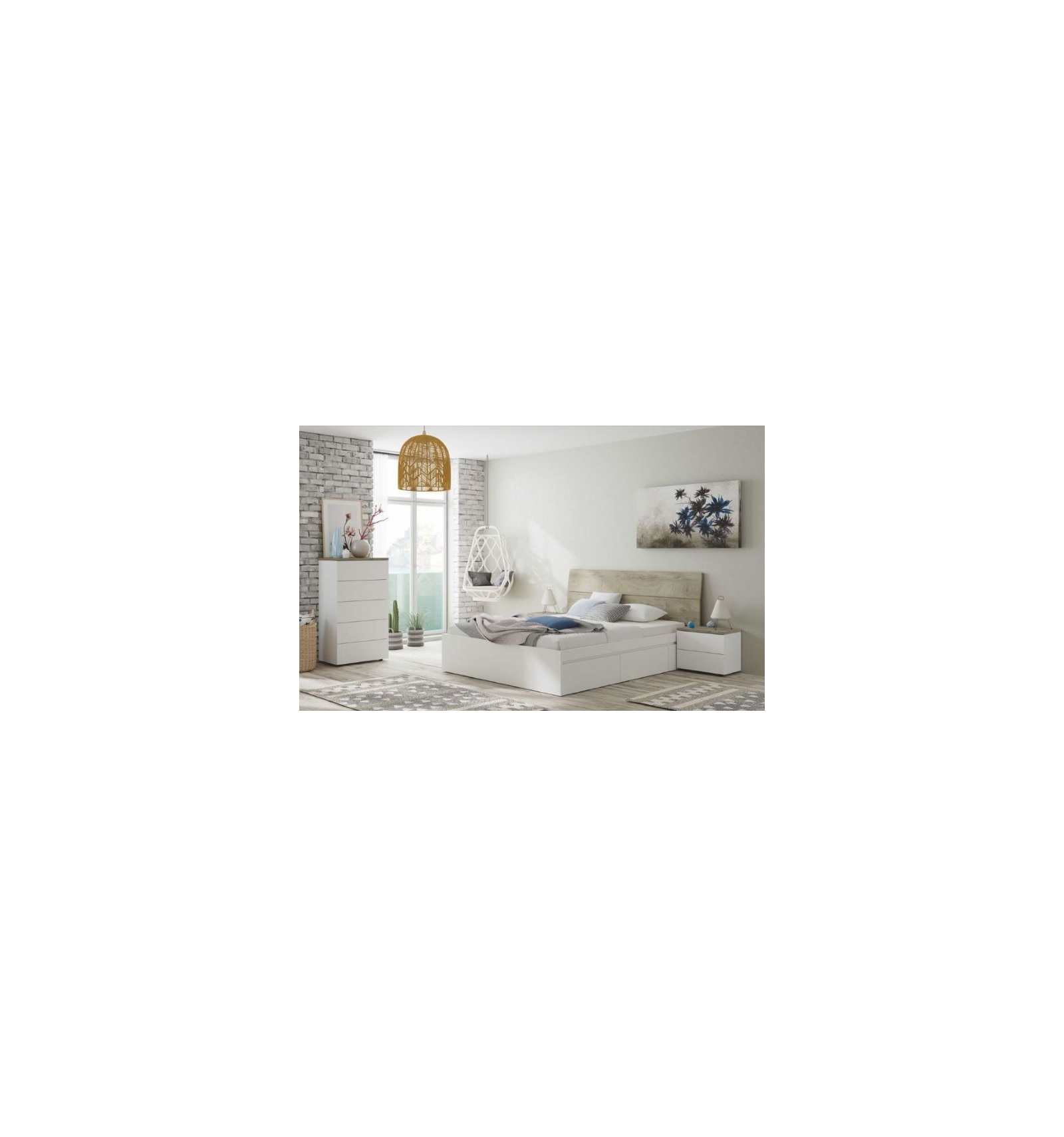 Está diseñado en una agradable combinación de colores en blanco mate y roble, y está pensado para camas de entre 135 y 150 cm de ancho.