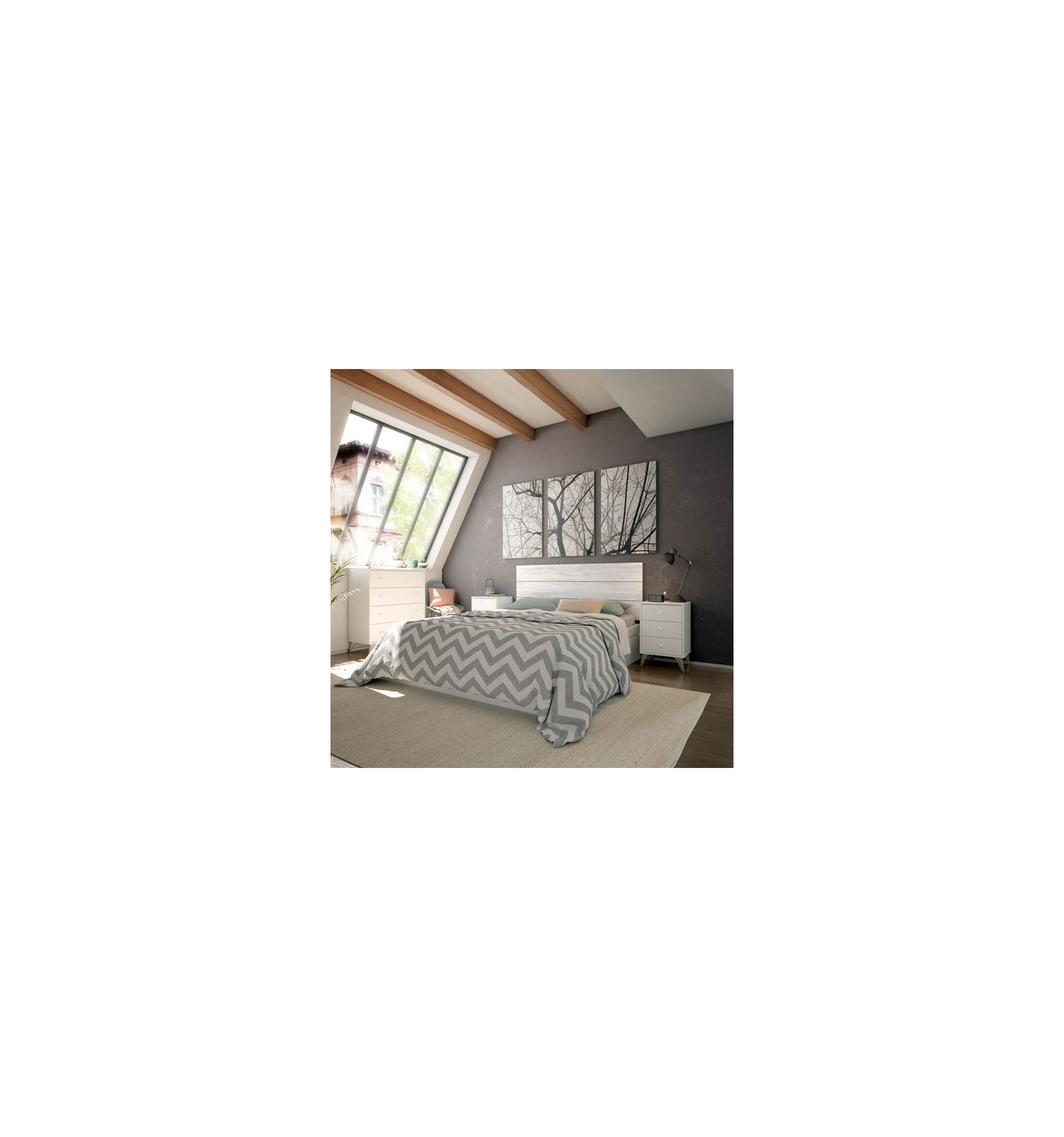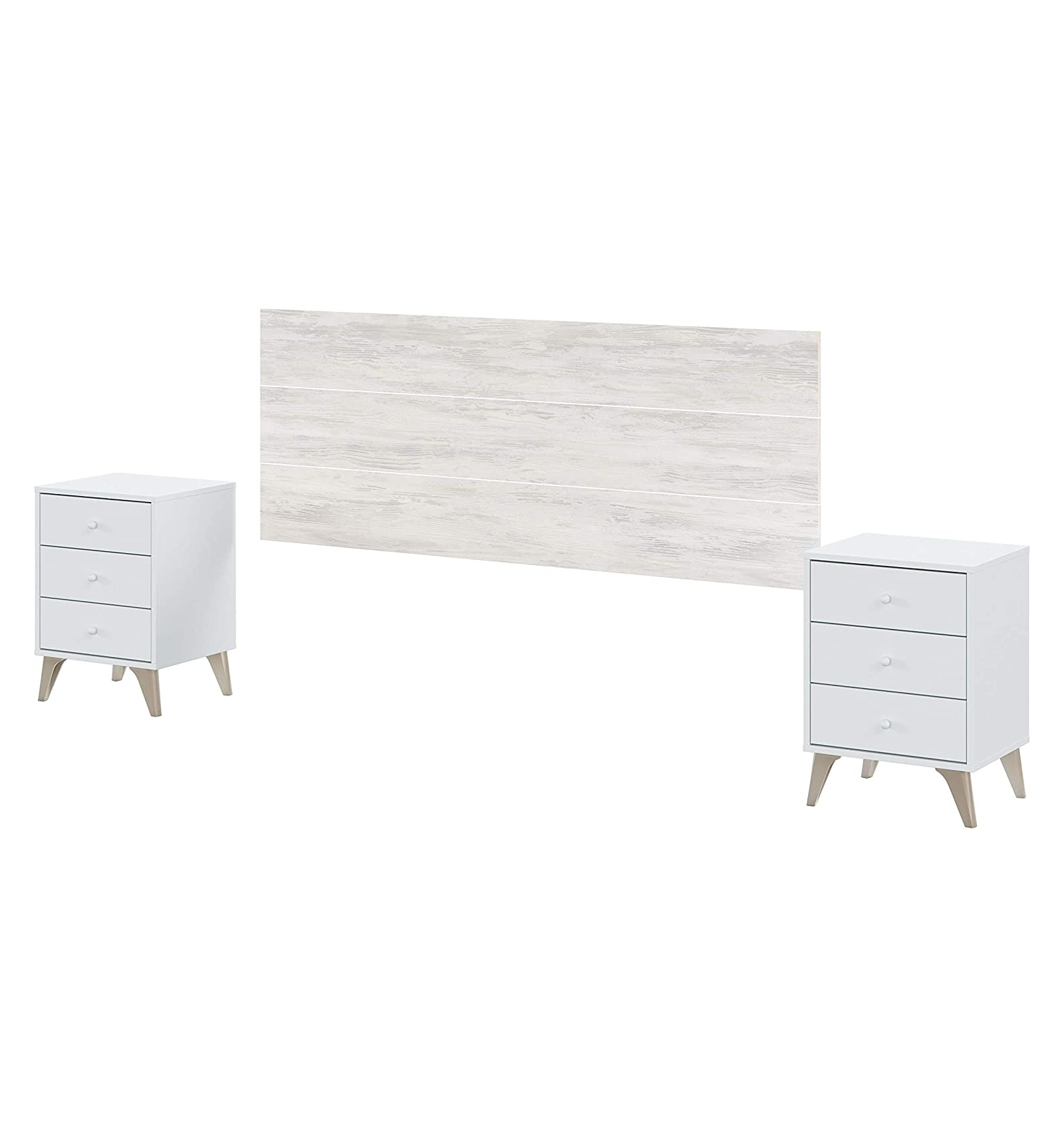 CABEZAL PARA CAMAS DE 135 O 150 CM + 2 MESITAS DE NOCHE CADA UNA CON 3 CAJONES. SUS TONOS BLANCOS SON PERFECTOS PARA COMBINAR CON CUALQUIER TIPO DE DECORACIÓN