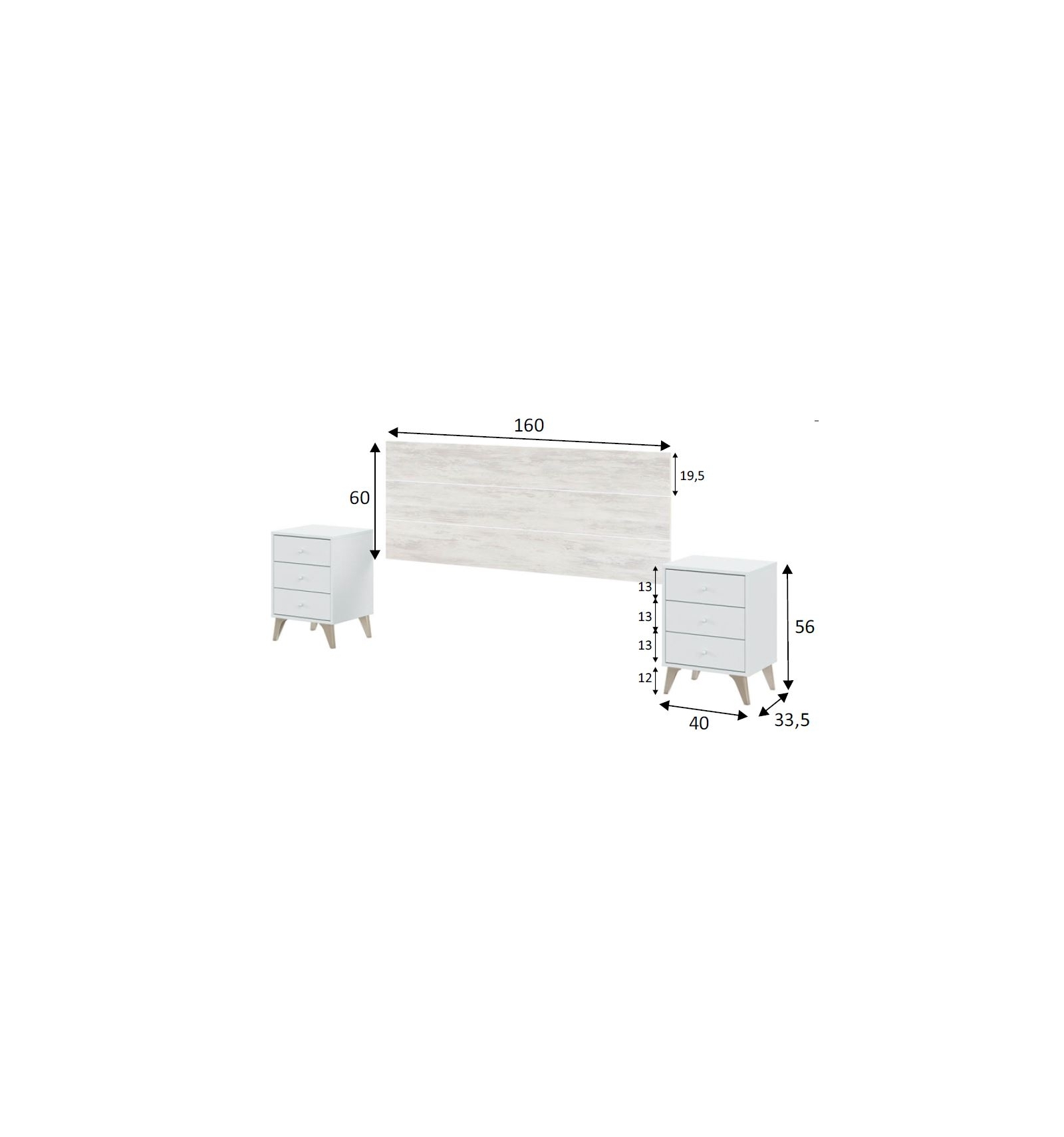 | Medidas: | Cabezal: 160 x 2,5 x 60 cm/ Mesita:40 cm x 33,5 x 56 cm/ Cajones: 34 x 25 x 10 cm |