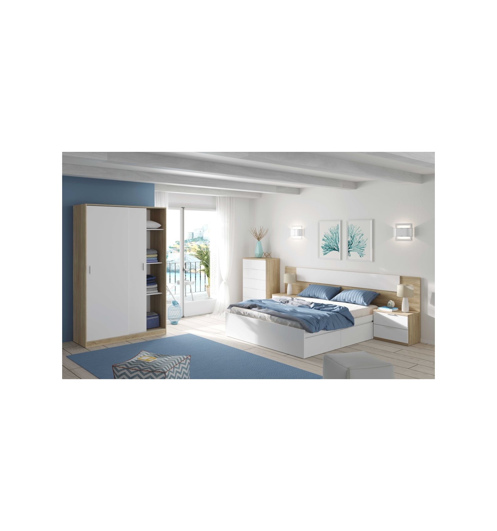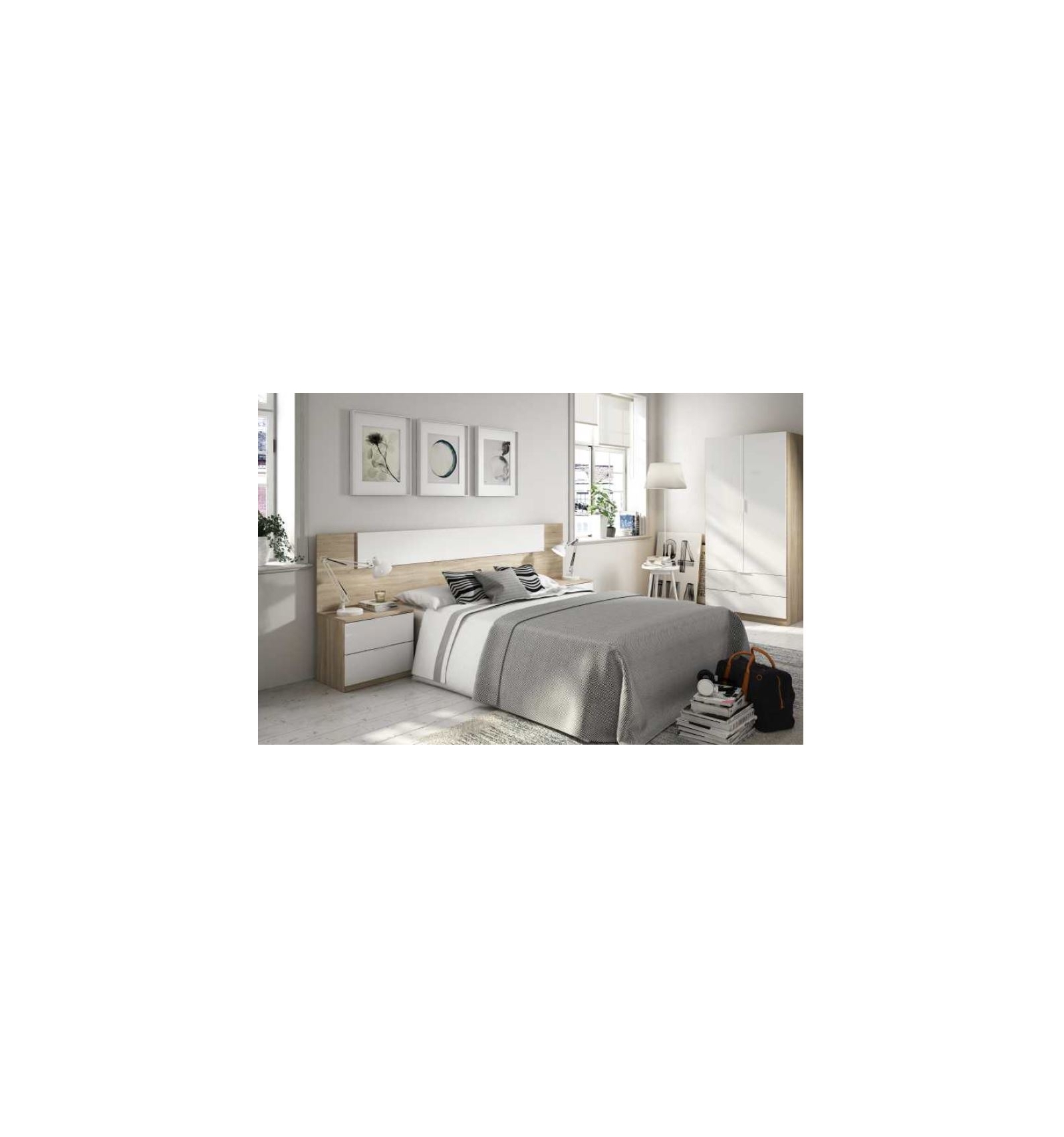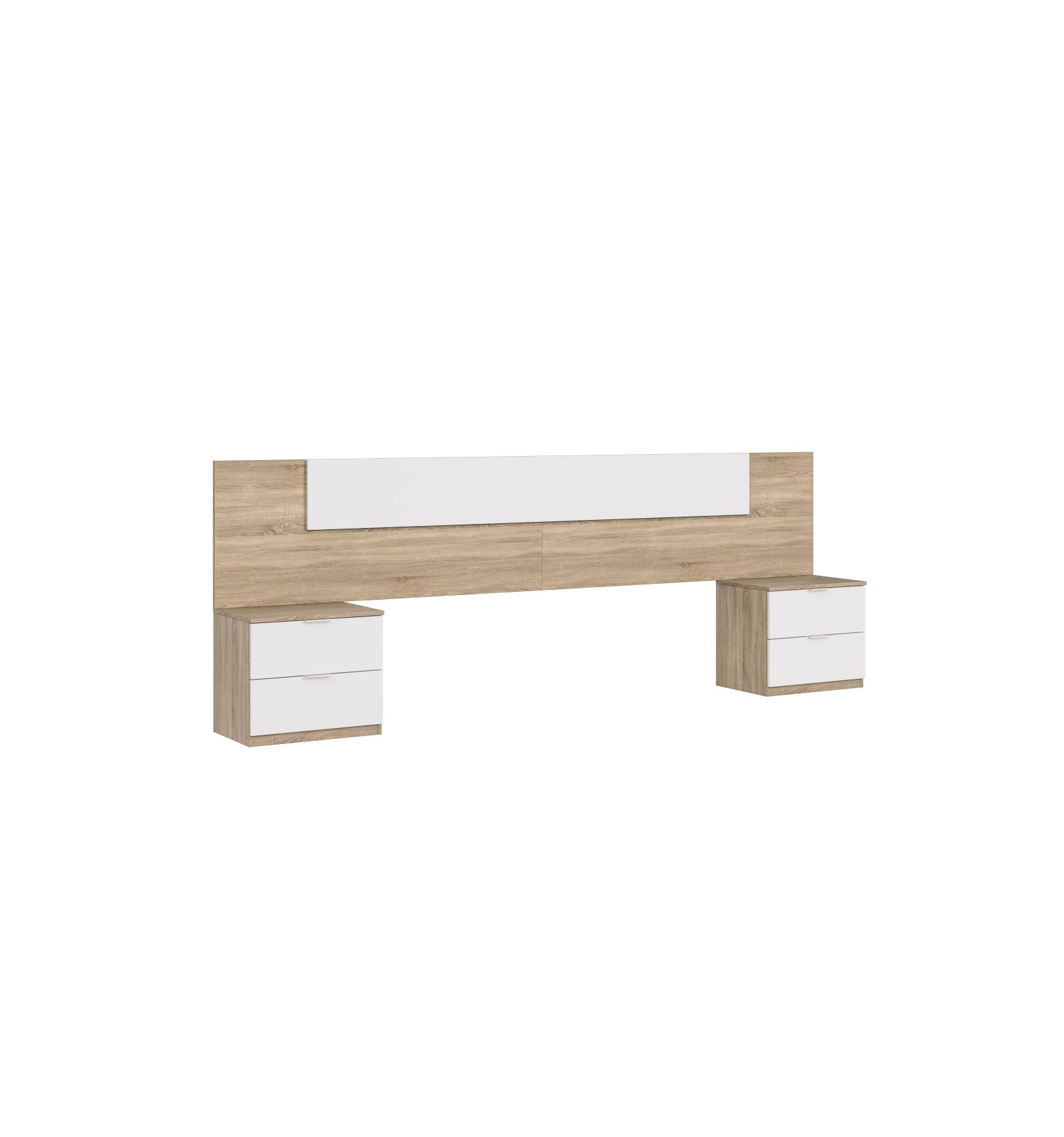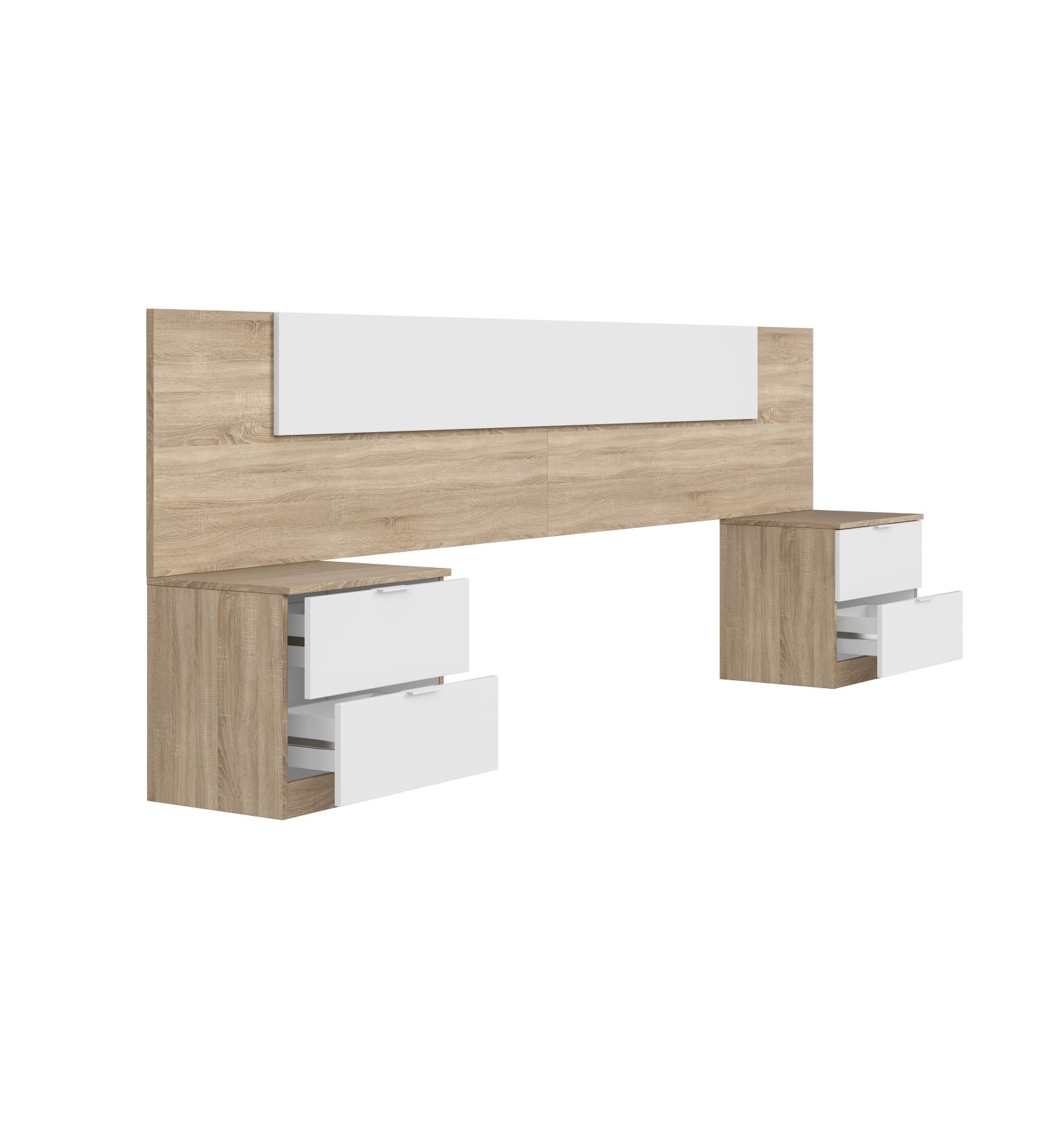 El cabezal con mesitas Turin tiene un diseño moderno y sencillo, con combinación de tonos en blanco y roble que sin duda aportarán luminosidad a la estancia.