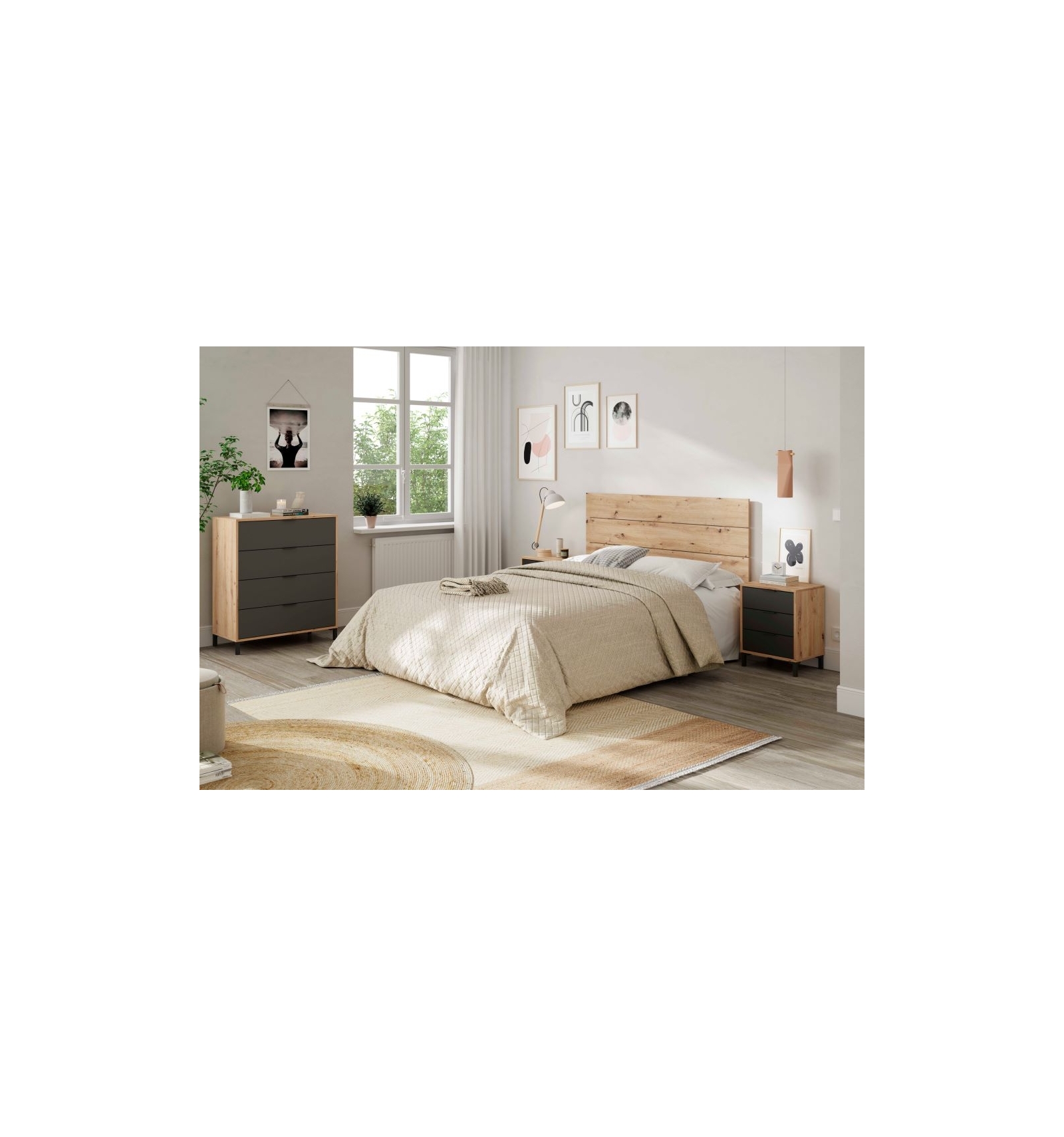 El cabezal con 2 mesitas Paracas simplifica mucho las cosas. Esta composición incluye un cabezal de color roble de 160 x 2,5 x 60 cm de altura, perfecto para camas de 135 a 160 cm de ancho y dos mesitas en tono roble con 3 atrevidos cajones en color gris antracita.