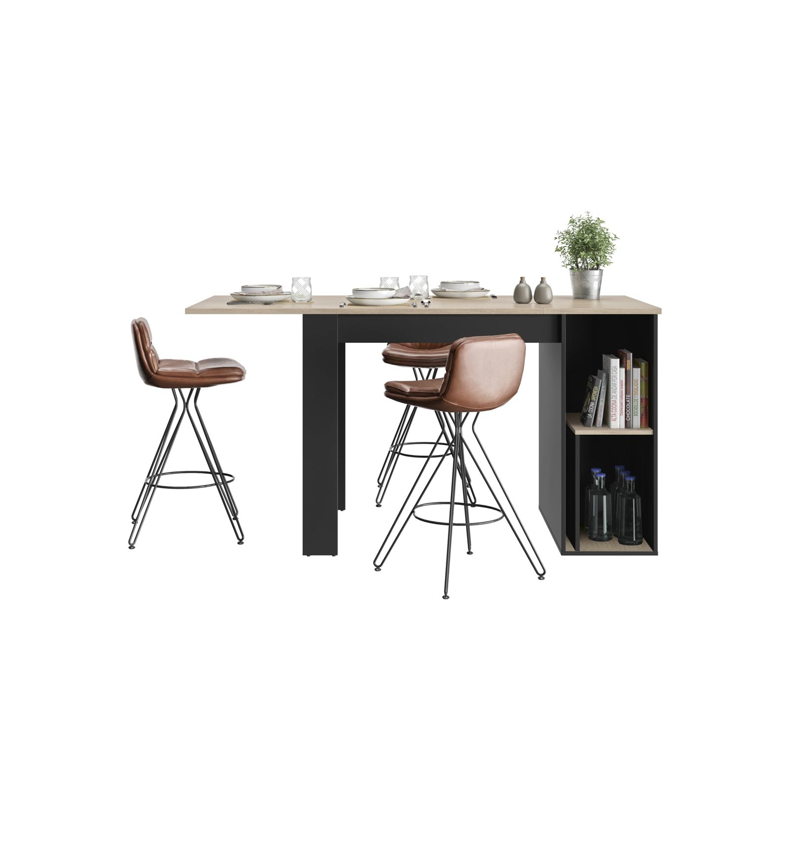 La mesa de cocina Chicago destaca por su extensión integrada y su diseño moderno. Además, está fabricada con materiales de calidad, es fácil de montar y ofrece un espacio de almacenamiento conveniente para colocar diversos objetos encima y en sus estantes.