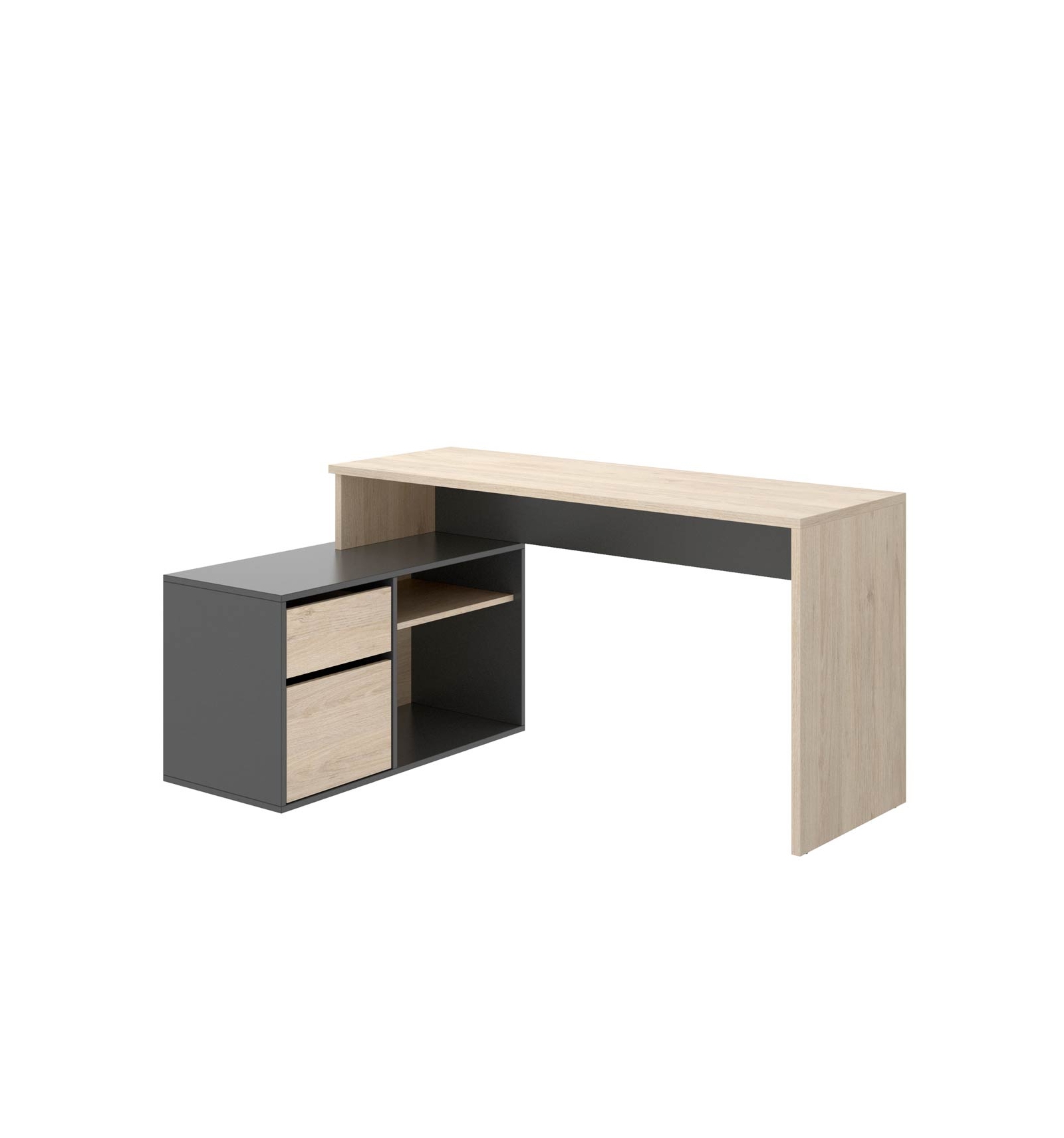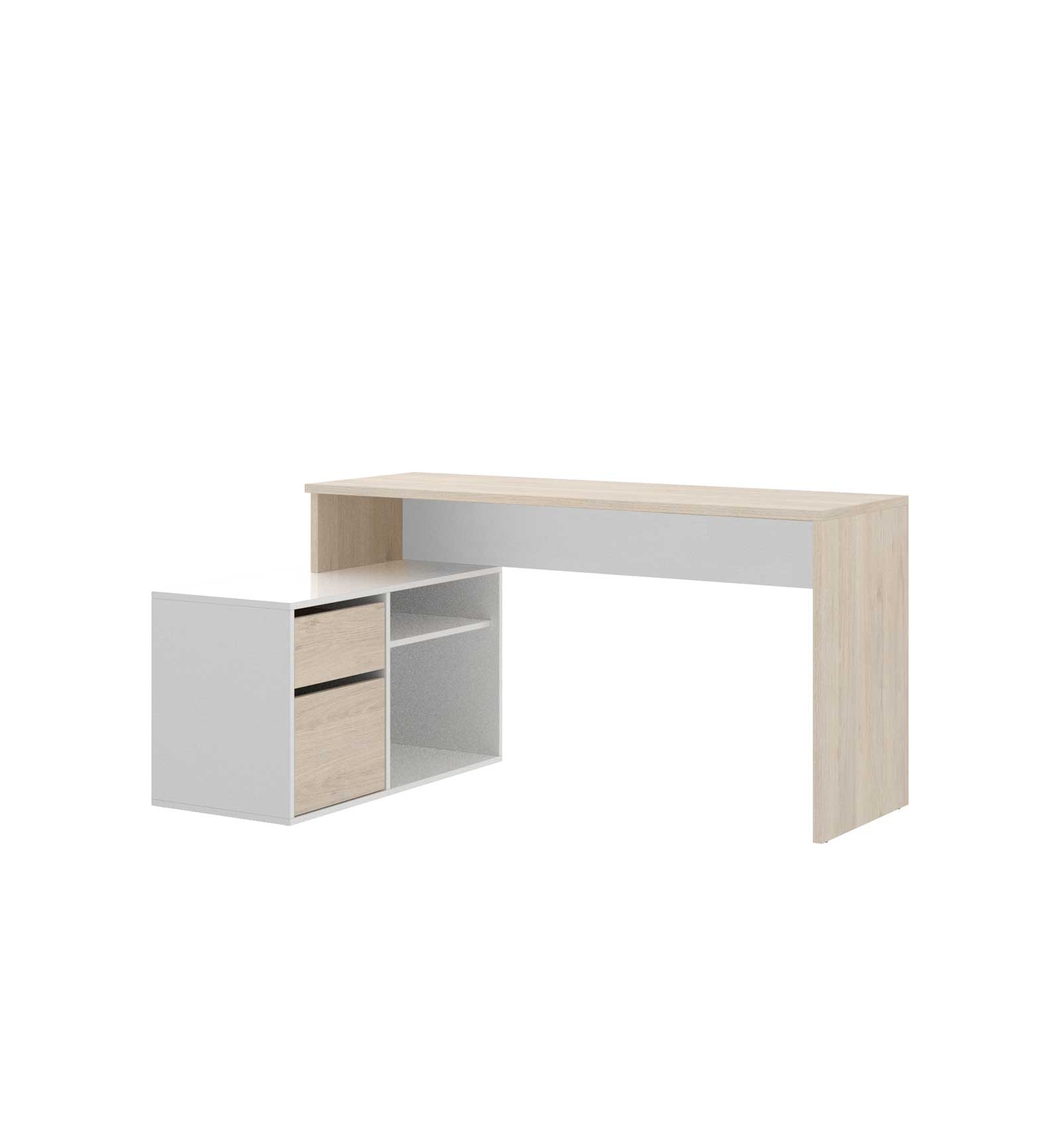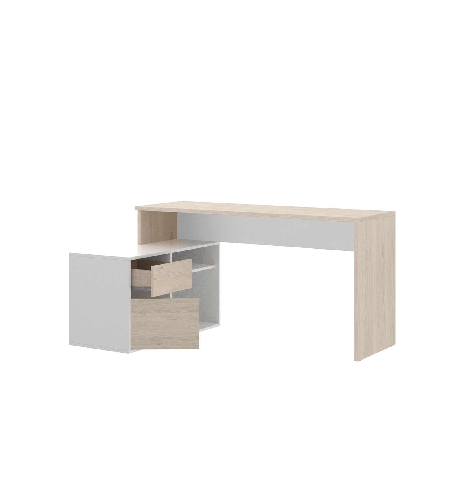 La mesa de escritorio en L Otto cuenta con un amplio espacio de trabajo y e incluye dos cajones de gran capacidad y dos estanterías.