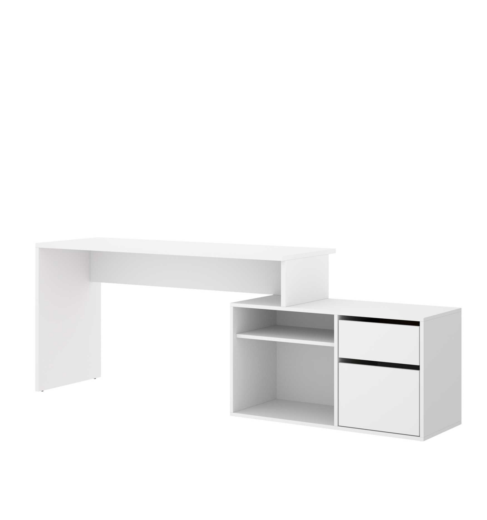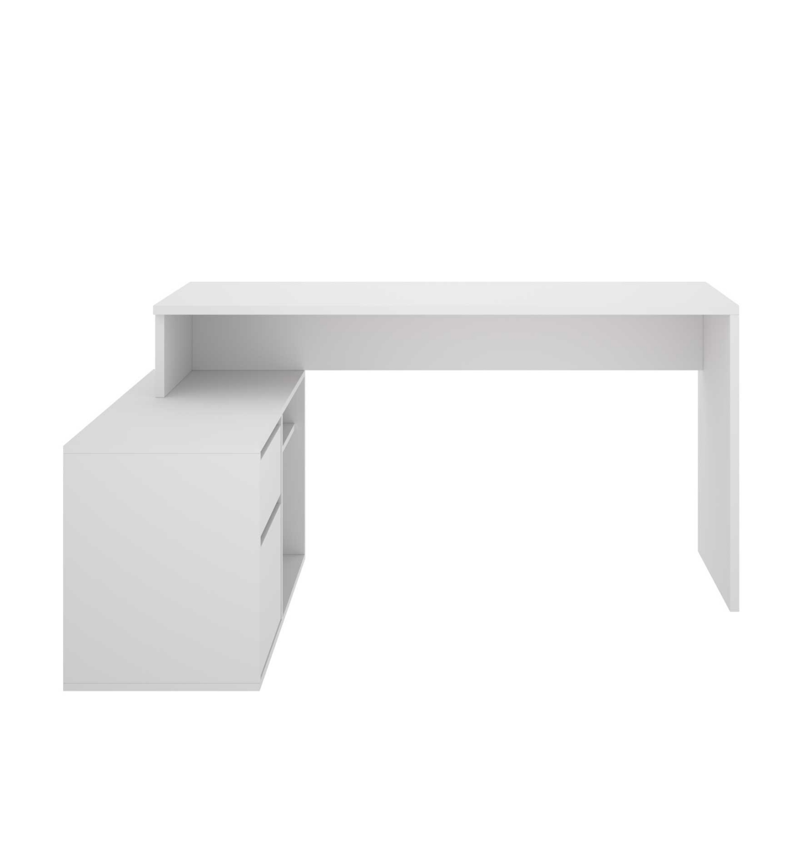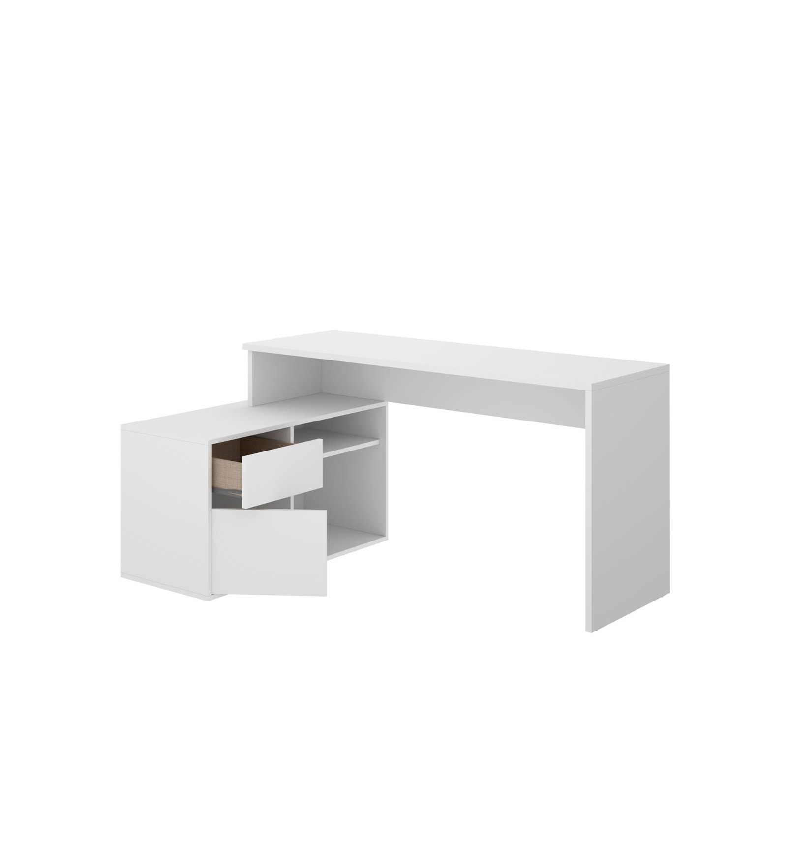 La mesa de escritorio en L Otto cuenta con un amplio espacio de trabajo y e incluye dos cajones de gran capacidad y dos estanterías.