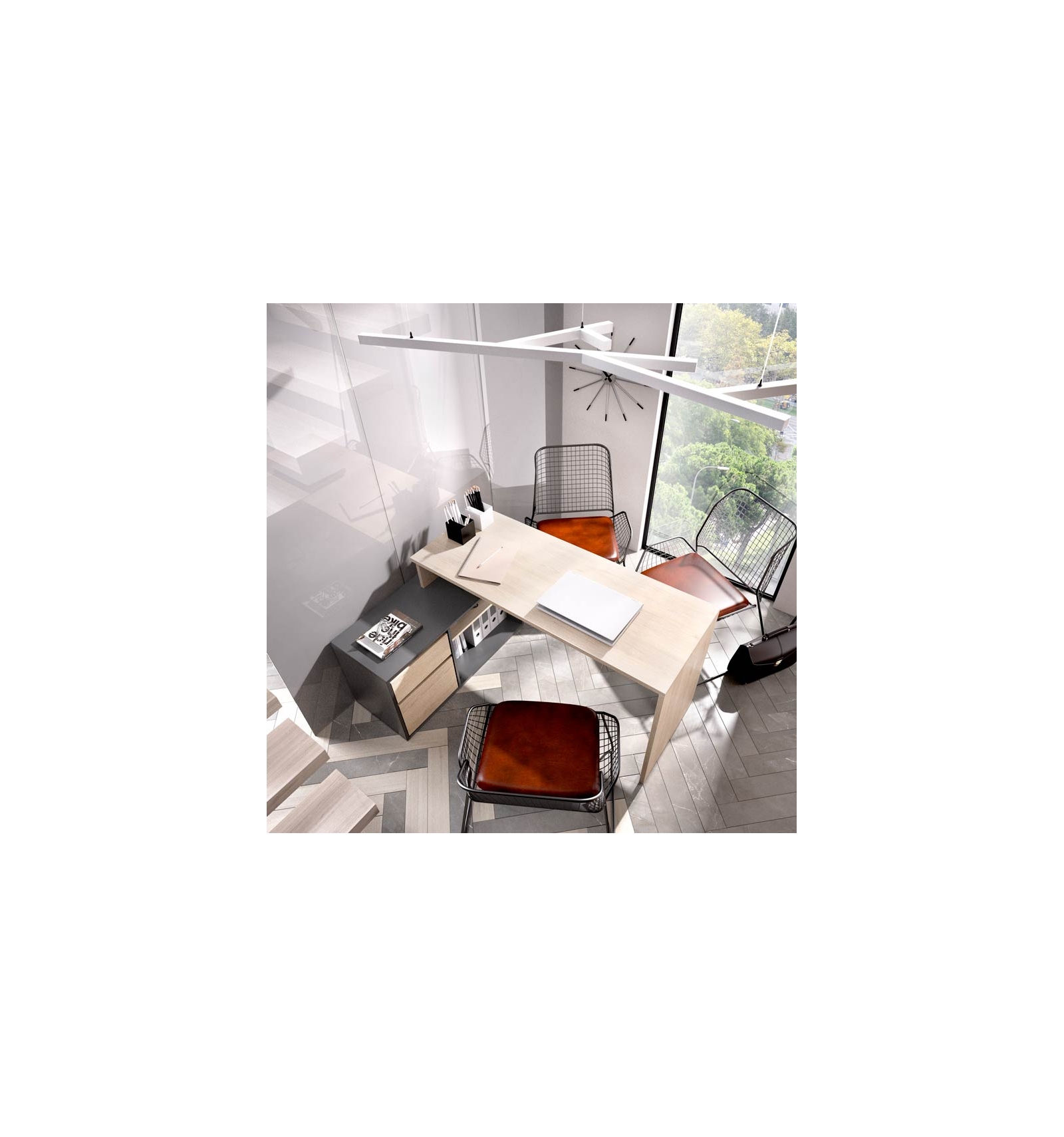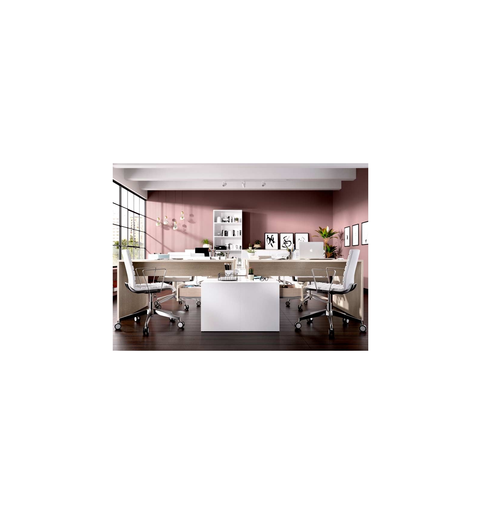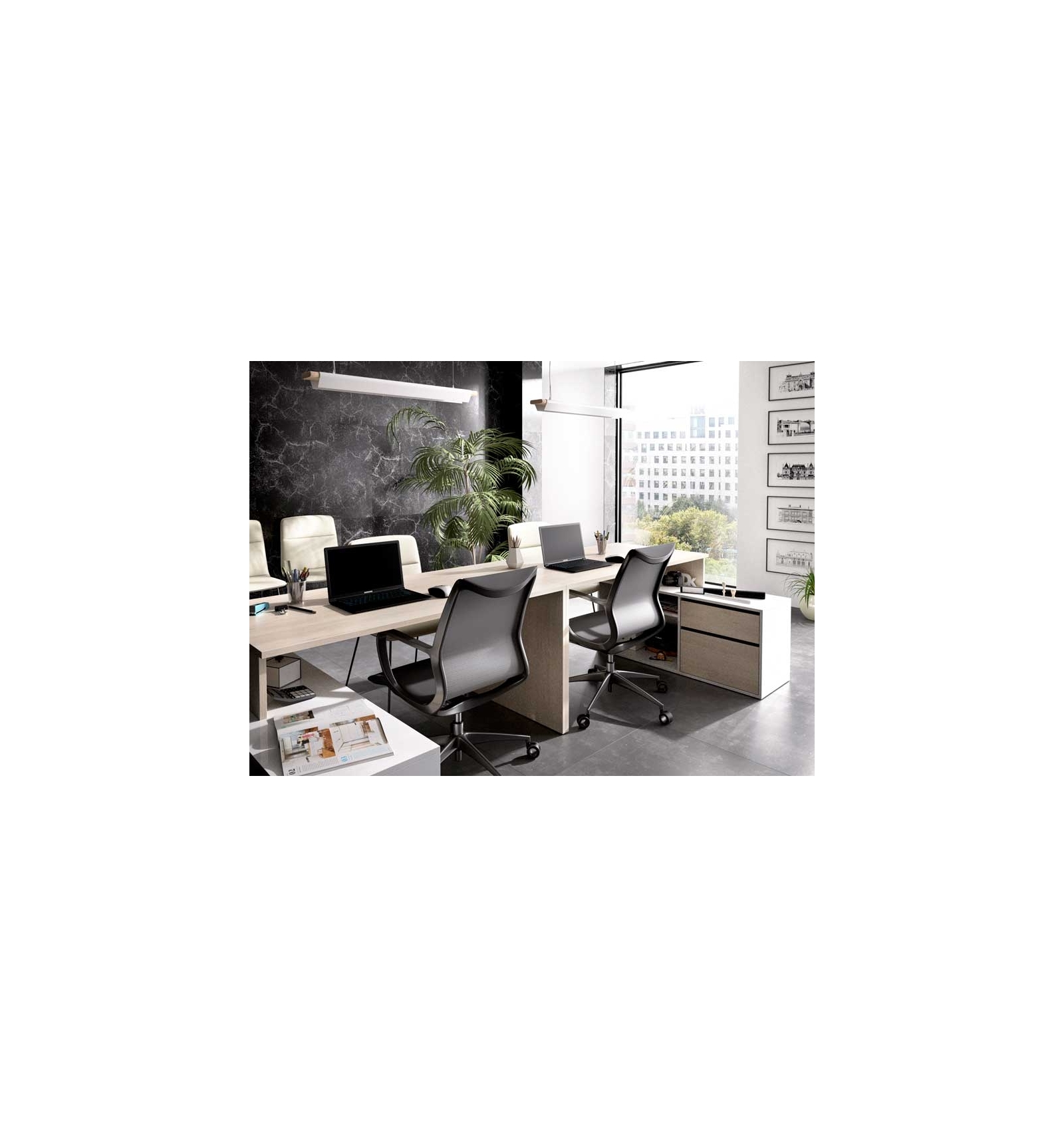 Por su diseño en L permite separar áreas de trabajo, por lo que es apta para oficinas y despachos.