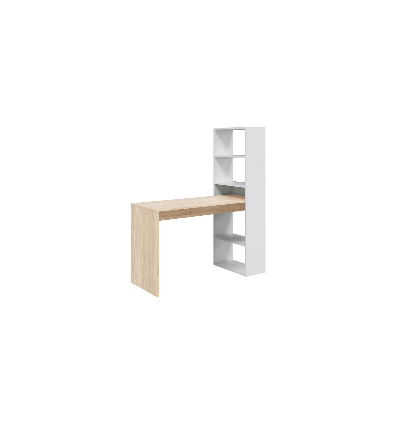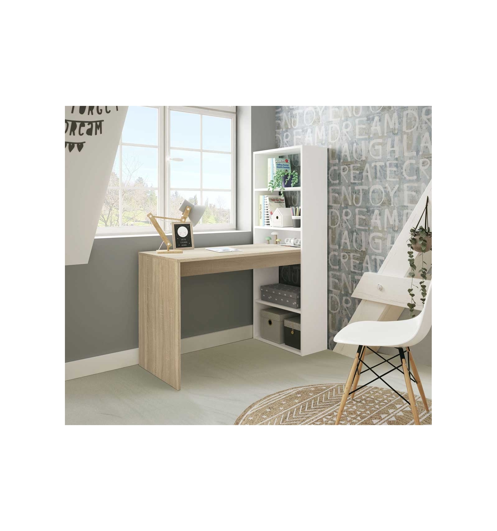 El escritorio con estantería Indra es una magnífica opción para tu oficina, despacho, sala de estudio o habitación de tus hijos puesto que ofrece un diseño en acabado bicolor que se adapta a cualquier espacio y decoración.
