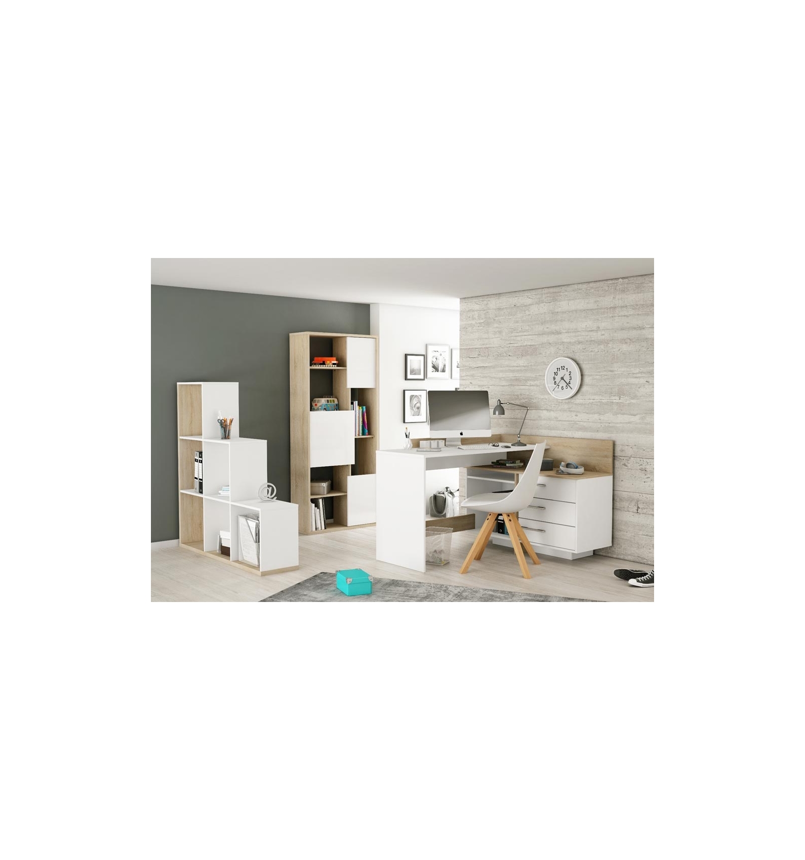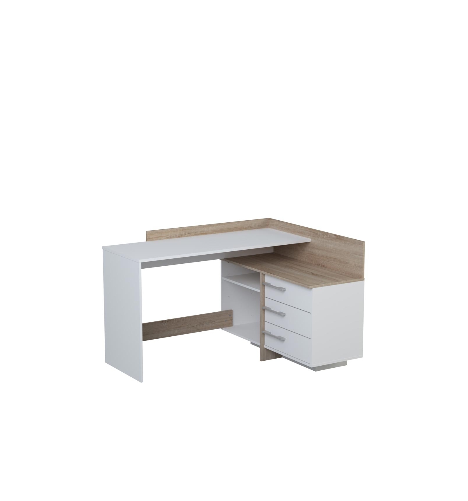 Práctico escritorio bicolor con estanterías y cajones. Gracias a su diseño en L, permite disponer de una amplia superficie de trabajo y tener las cosas a mano al mismo tiempo.