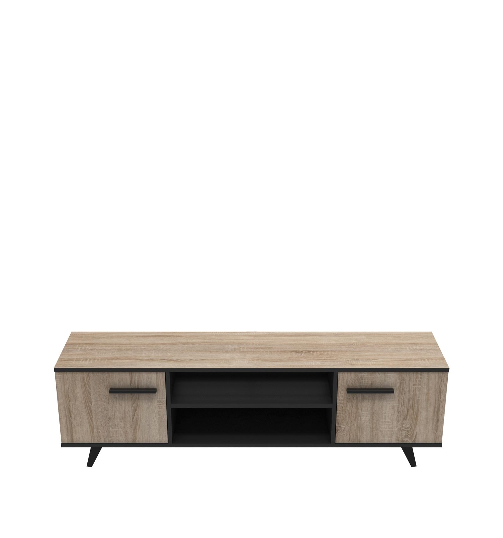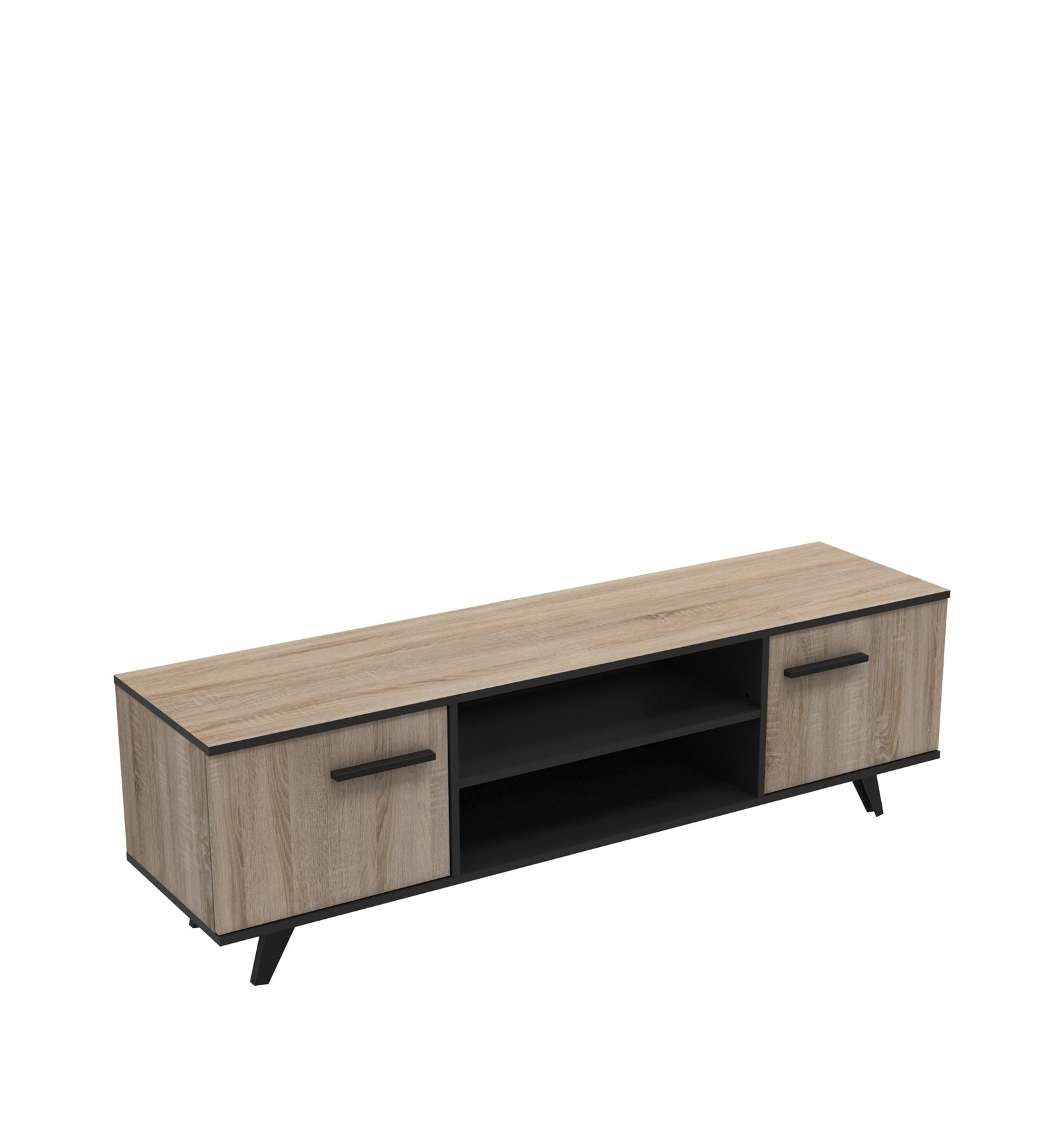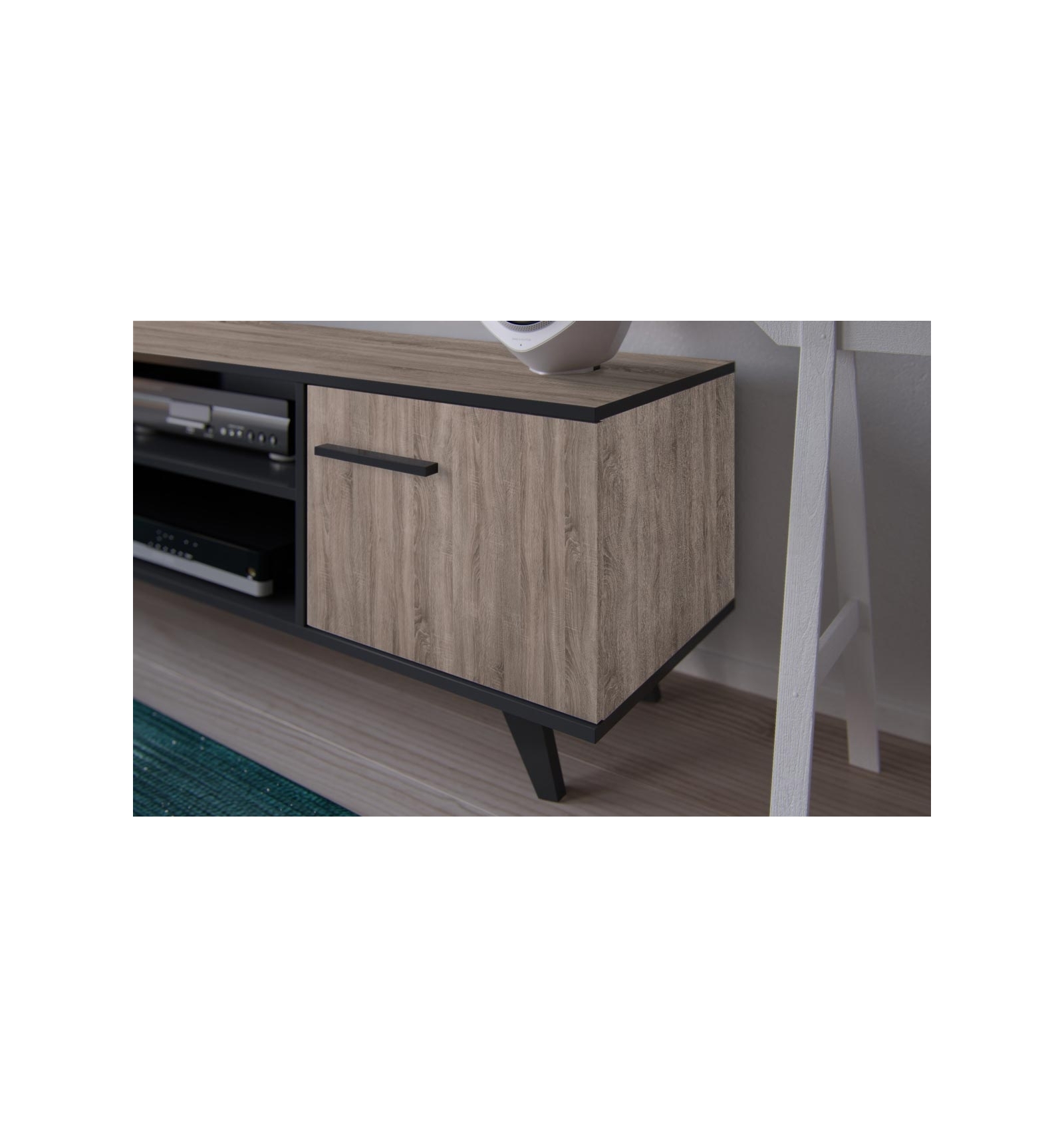 De diseño moderno y con acabado bicolor en roble y negro, este mueble cuenta con dos estantes de gran capacidad y 2 puertas con estantes regulables en altura para tener en un mismo sitio todo organizado.